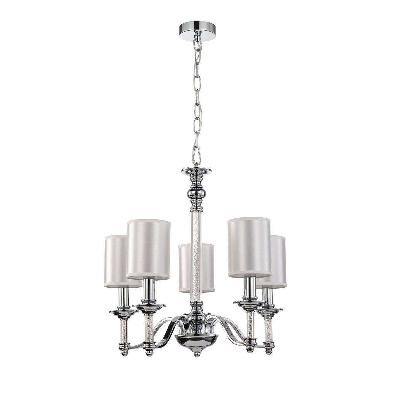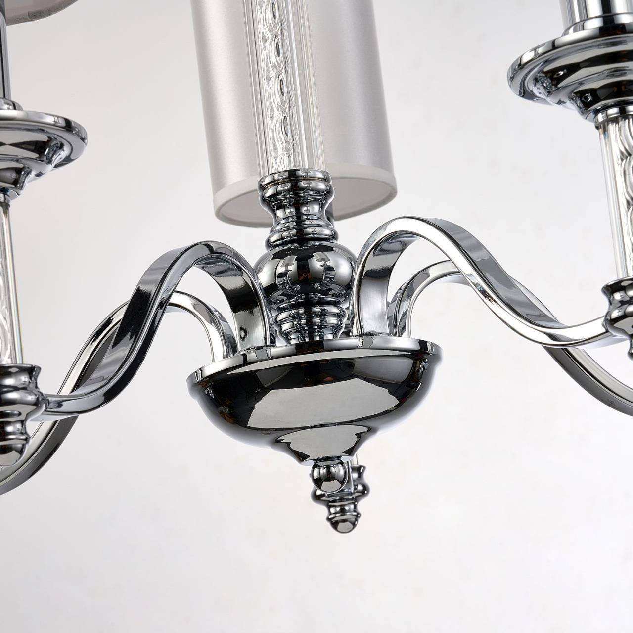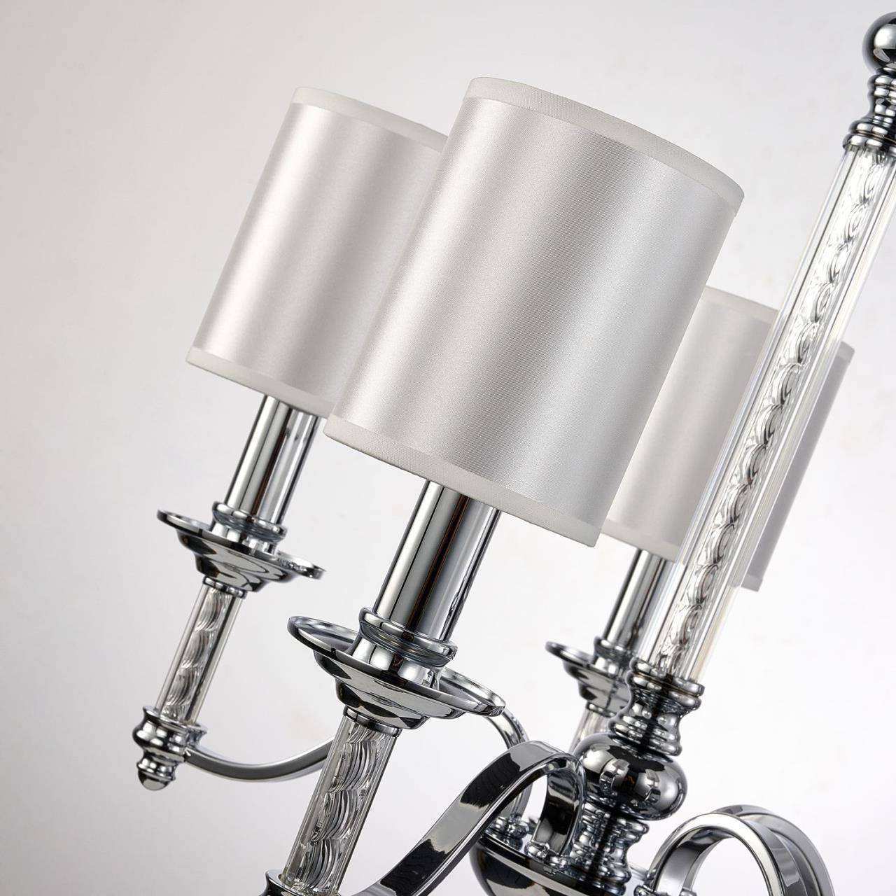 Каркас цвета хром, плафоны из белой атласной ткани, декоративные элементы из прозрачного стекла