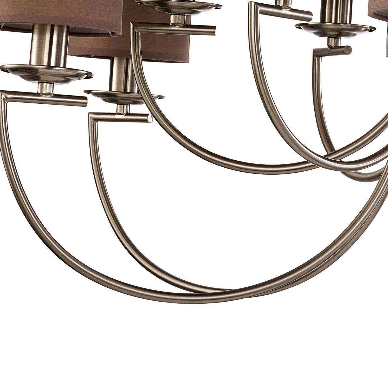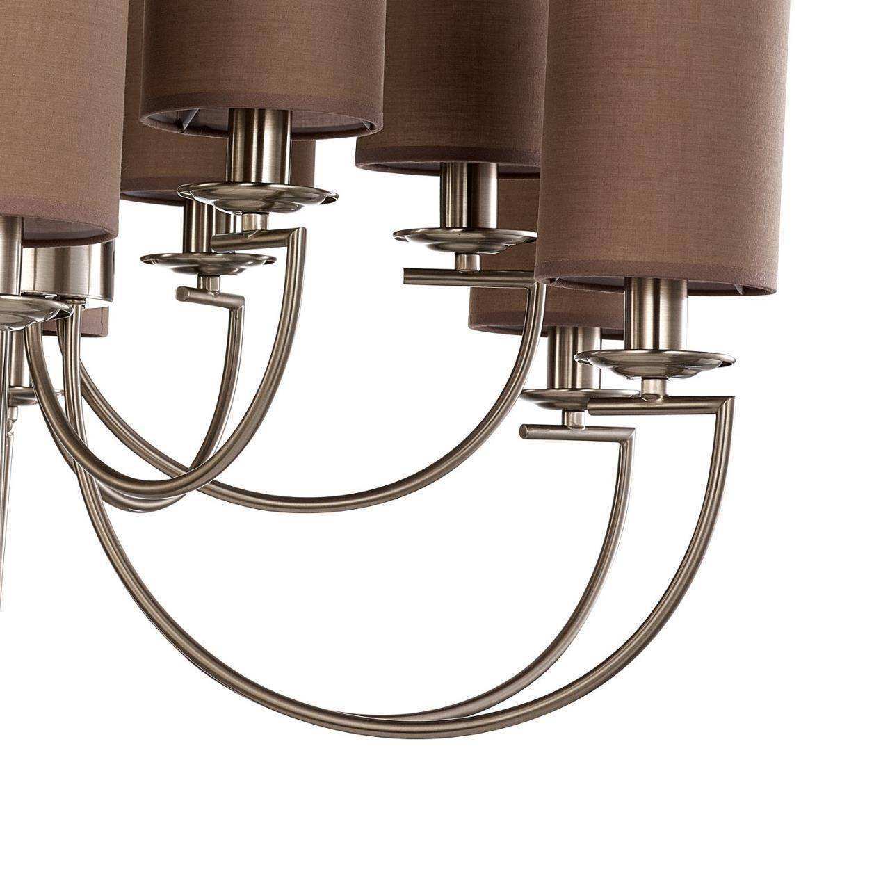 каркас цвета никеля, плафоны из коричневой ткани, декоративный элемент из прозрачного стекла