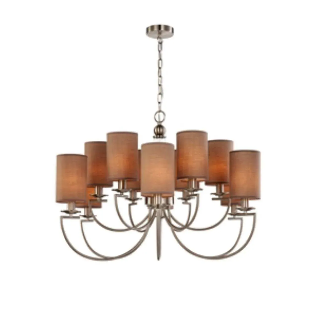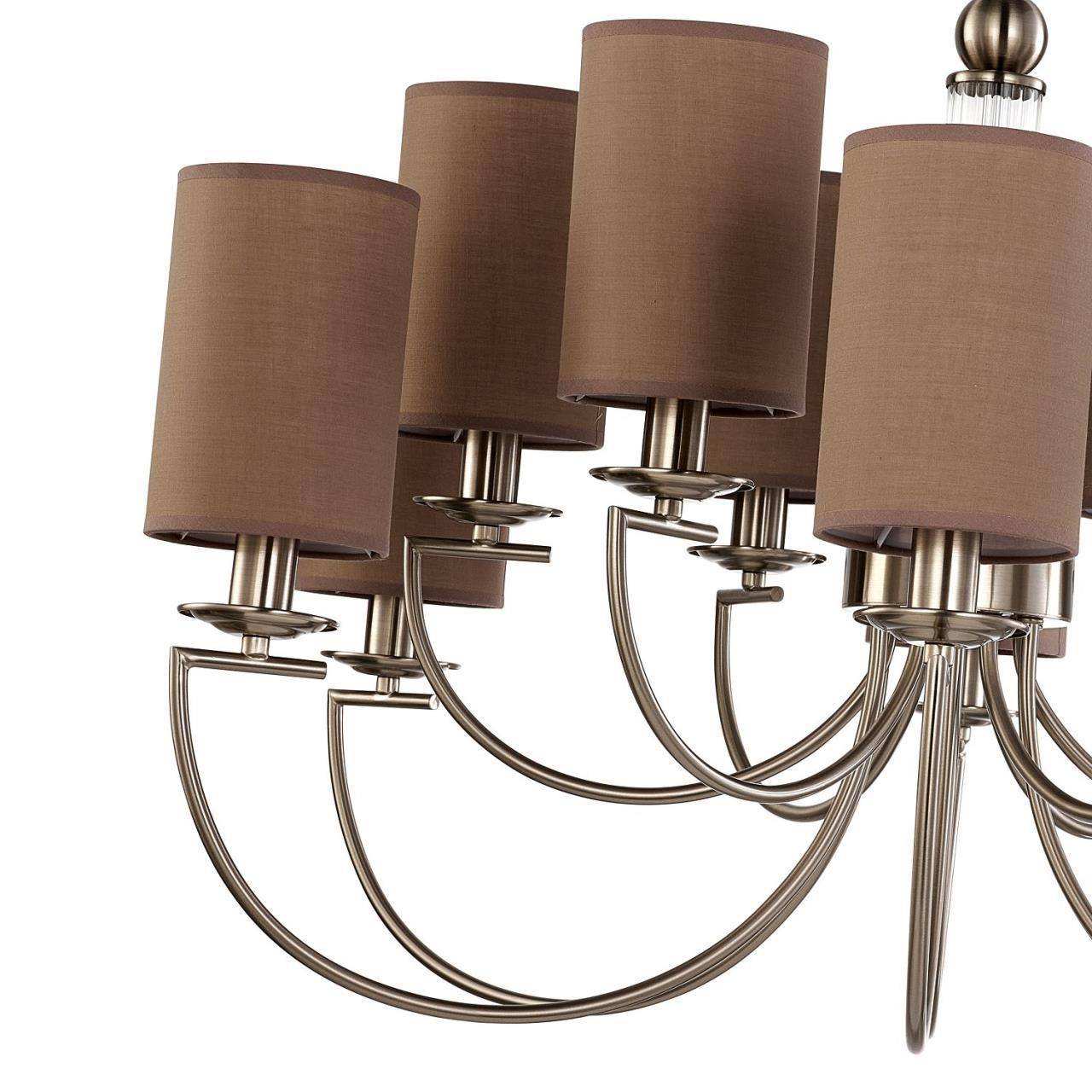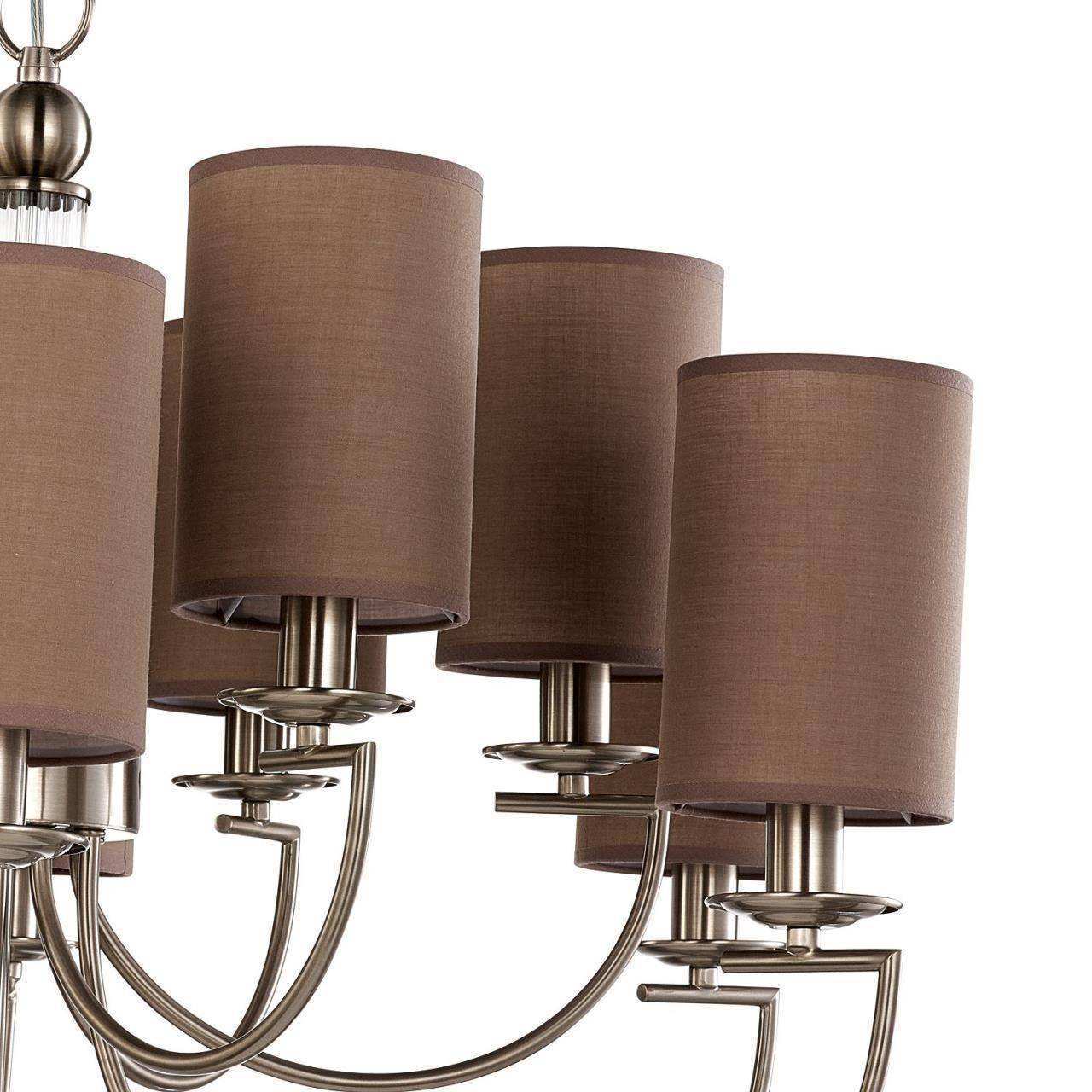 Каркас цвета никеля, плафоны из коричневой ткани, декоративный элемент из прозрачного стекла