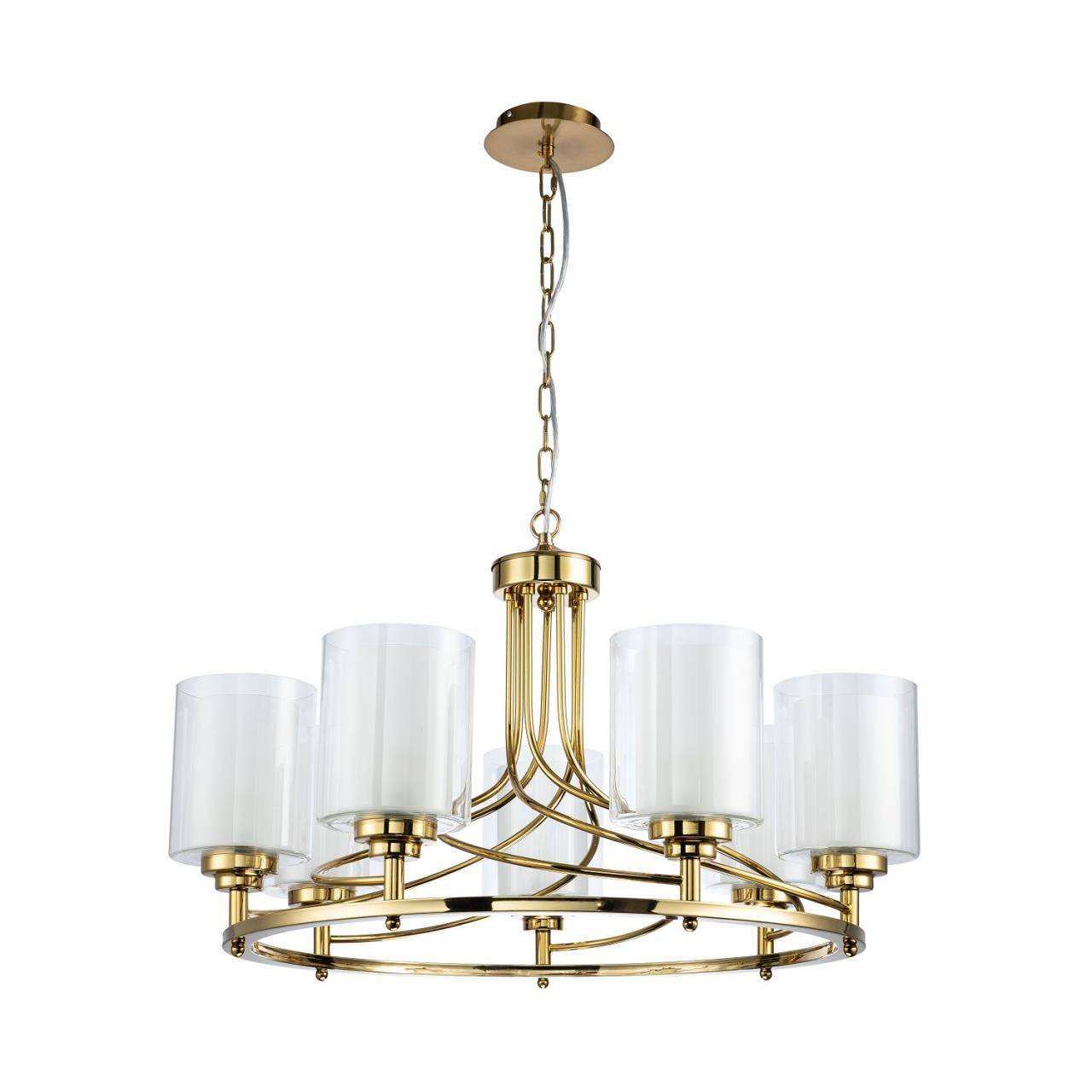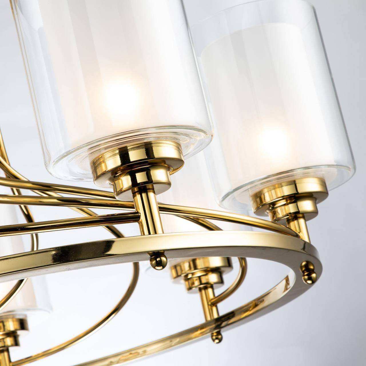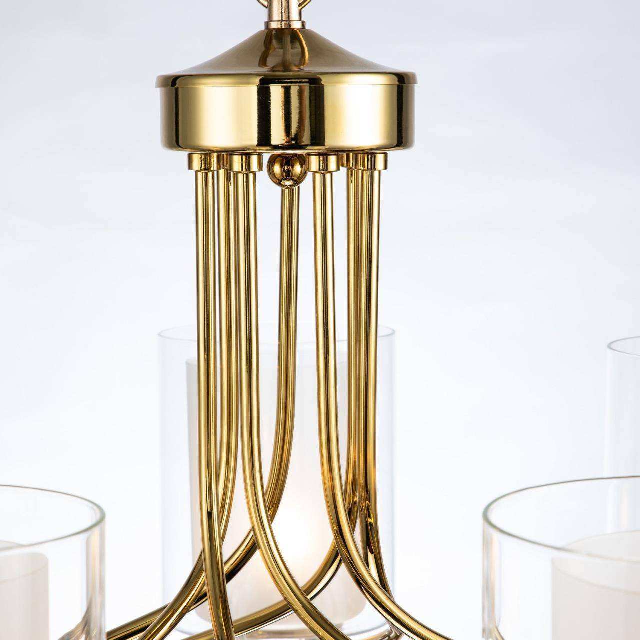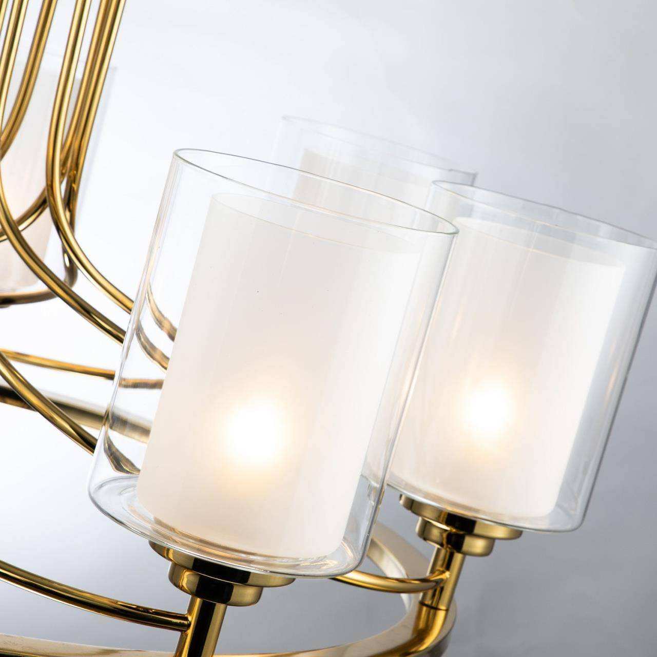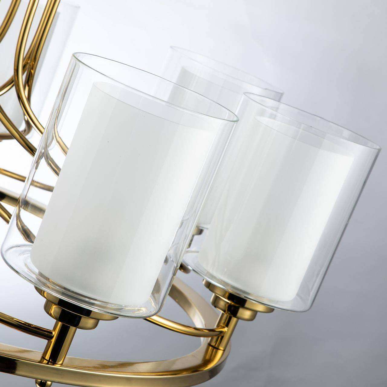 Каркас золотого цвета, внутренние плафоны из белого стекла, внешние плафоны из прозрачного стекла