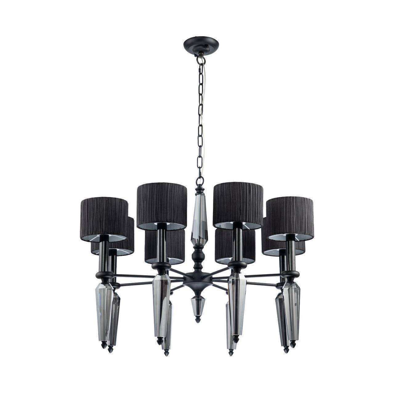 Каркас цвета матовый черный, плафоны из черной органзы, декоративные элементы из хрусталя серо-дымчатого цвета