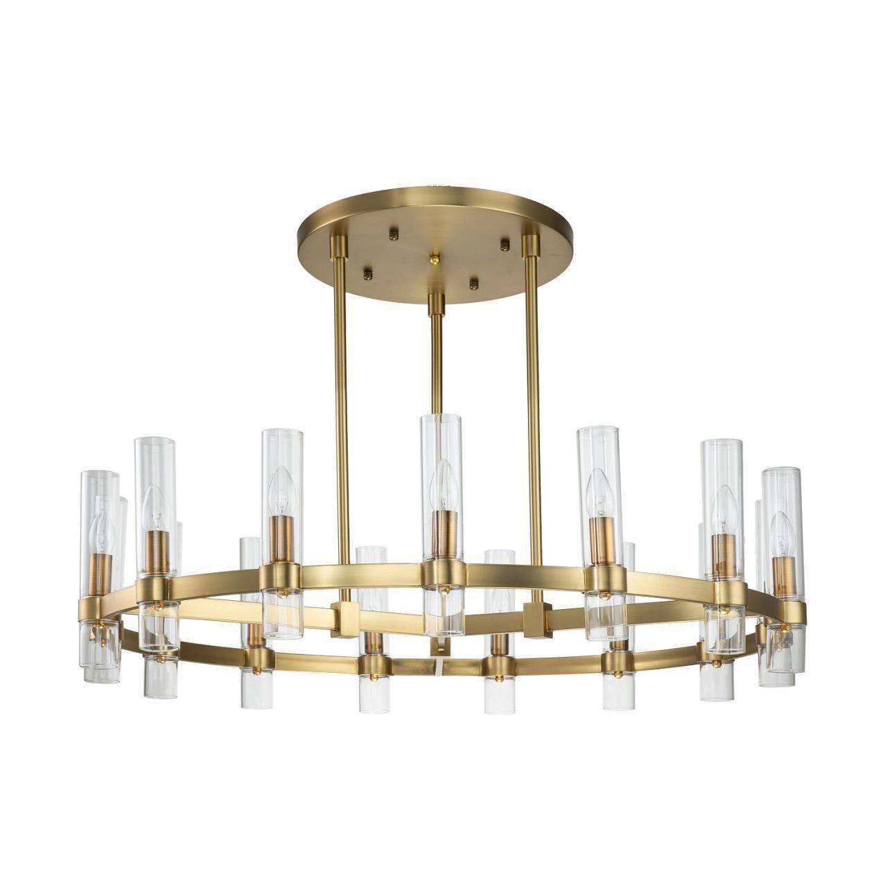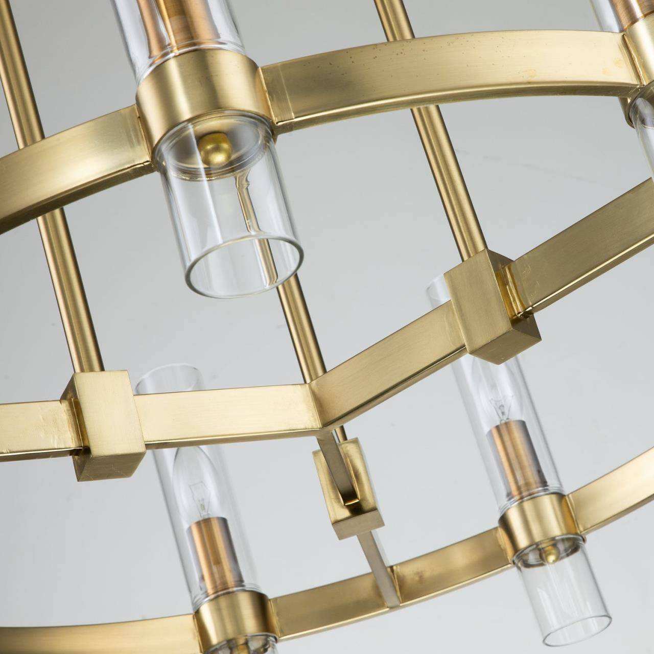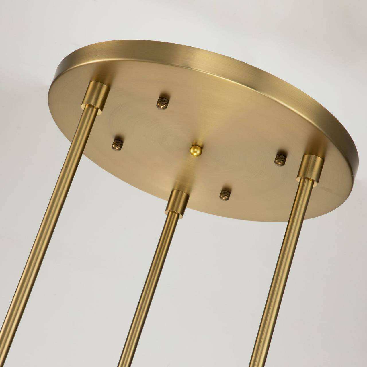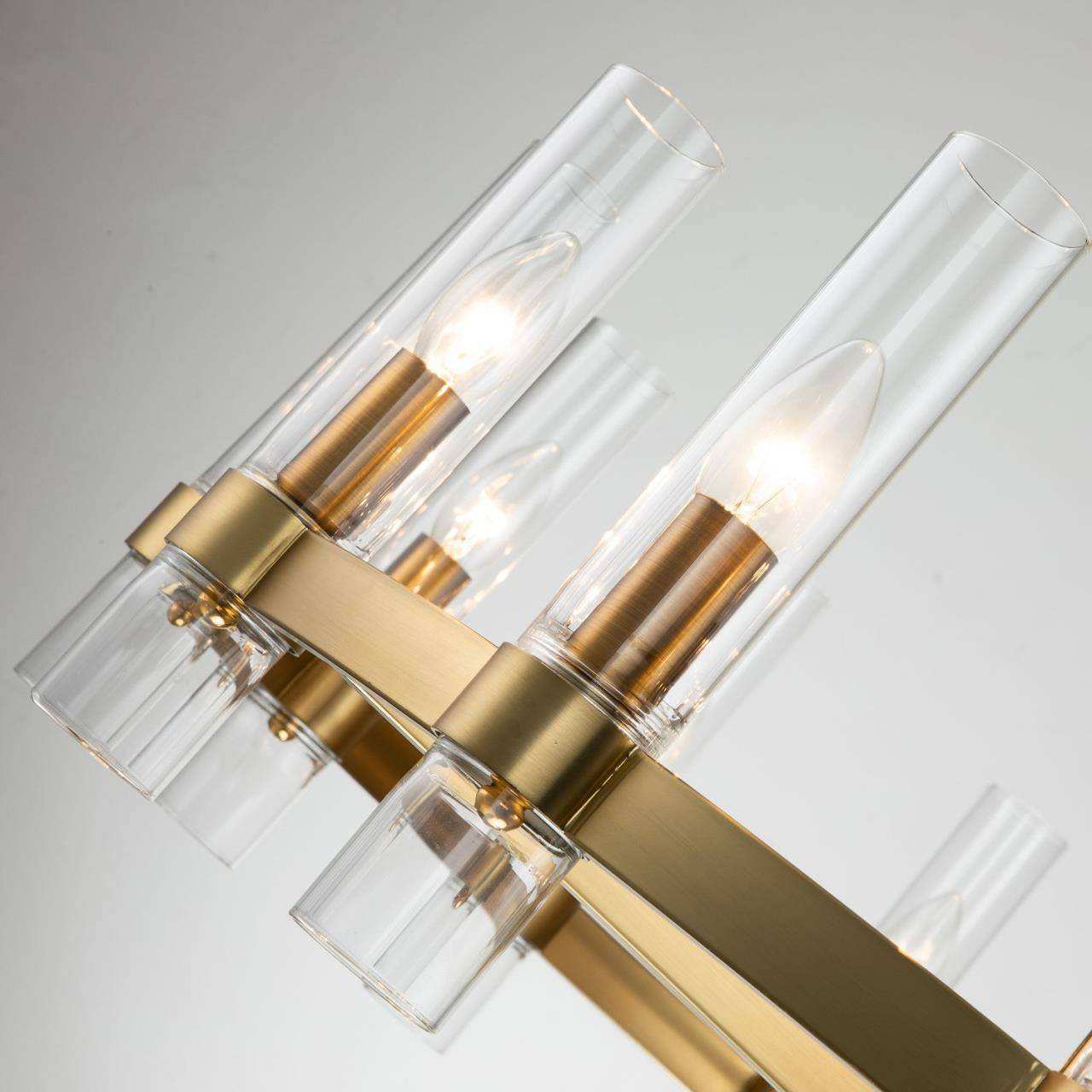 Каркас цвета матового золота, плафоны из прозрачного стекла, высота светильника регулируется благодаря составным центральным штокам