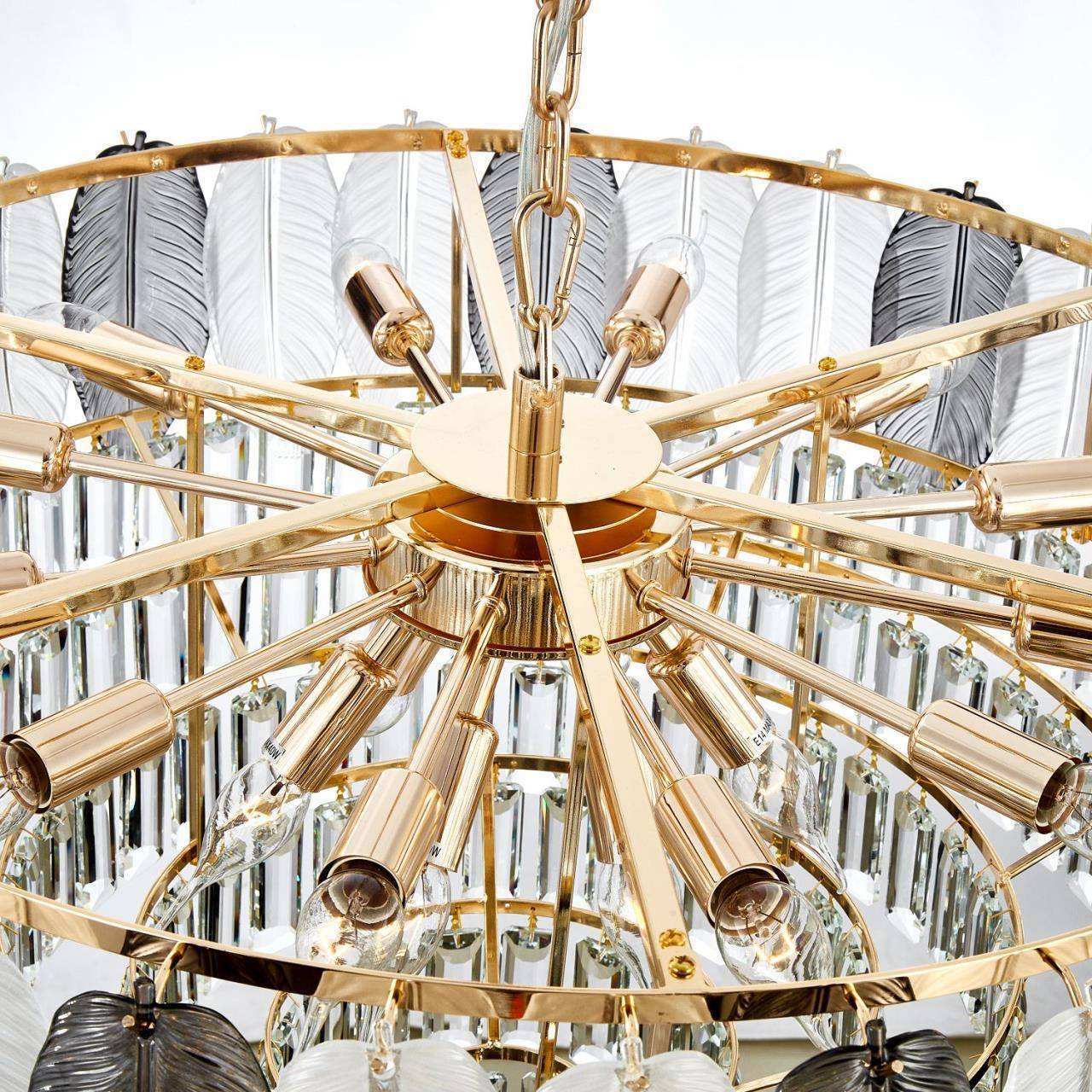 каркас цвета золотой гальваники, декоративные лепестки из белого и серого стекла, хрусталь оригинальной прямоугольной формы высшего качества