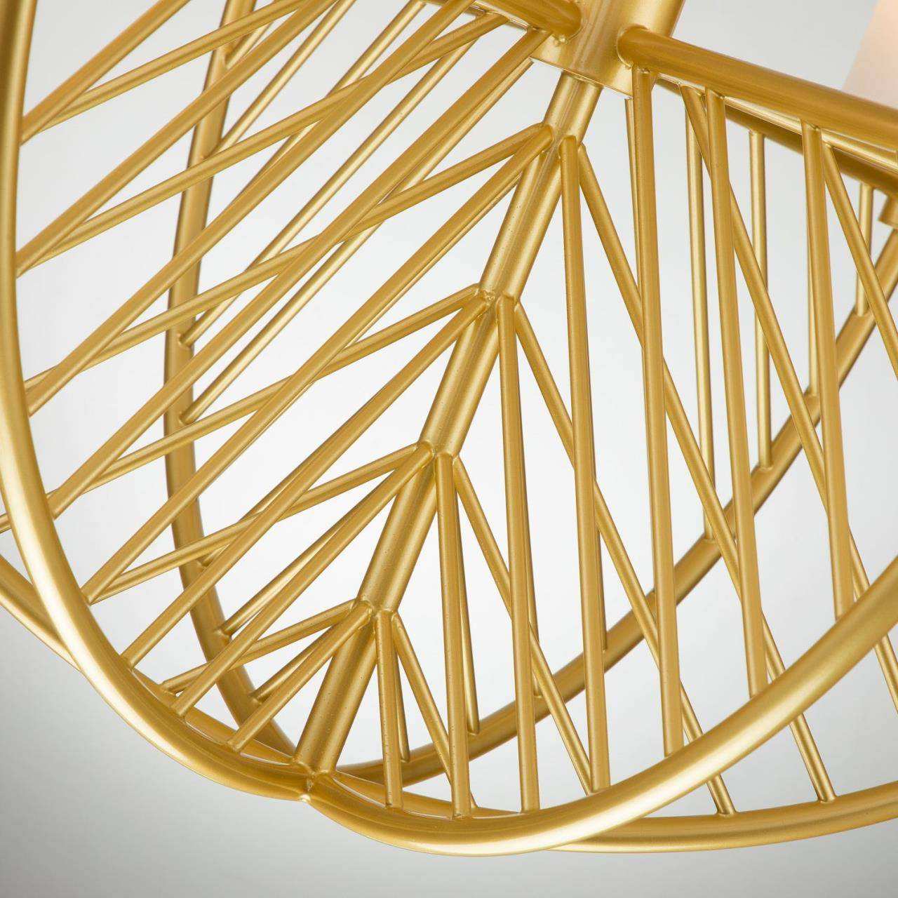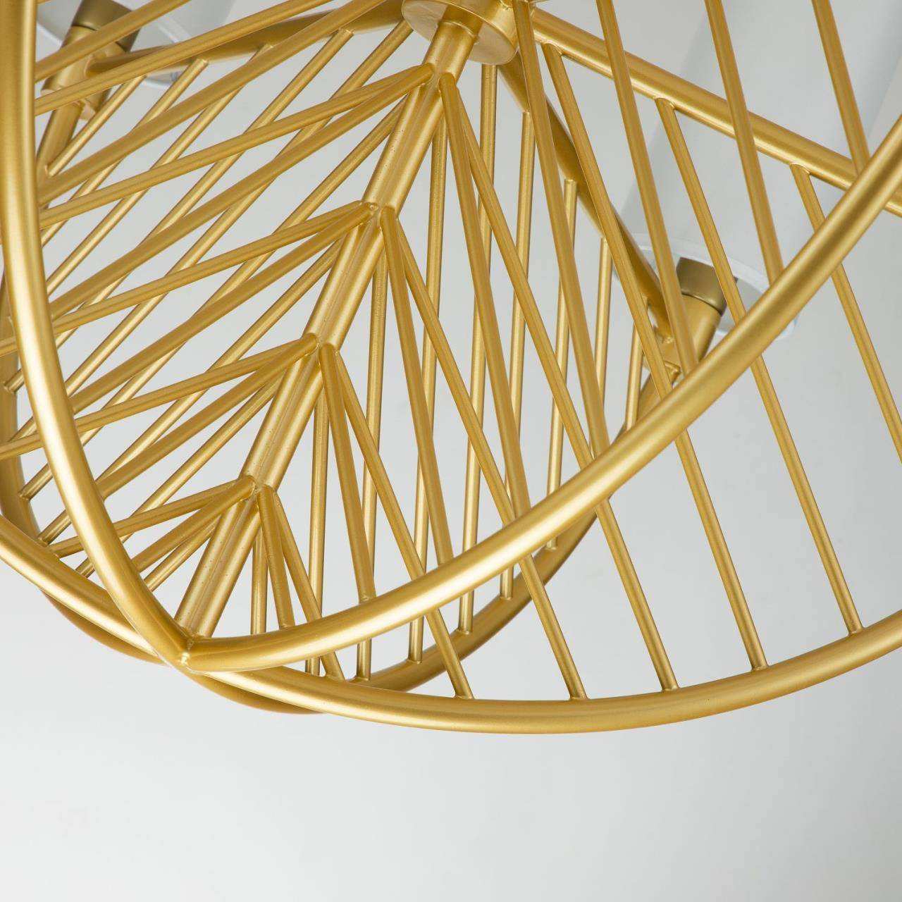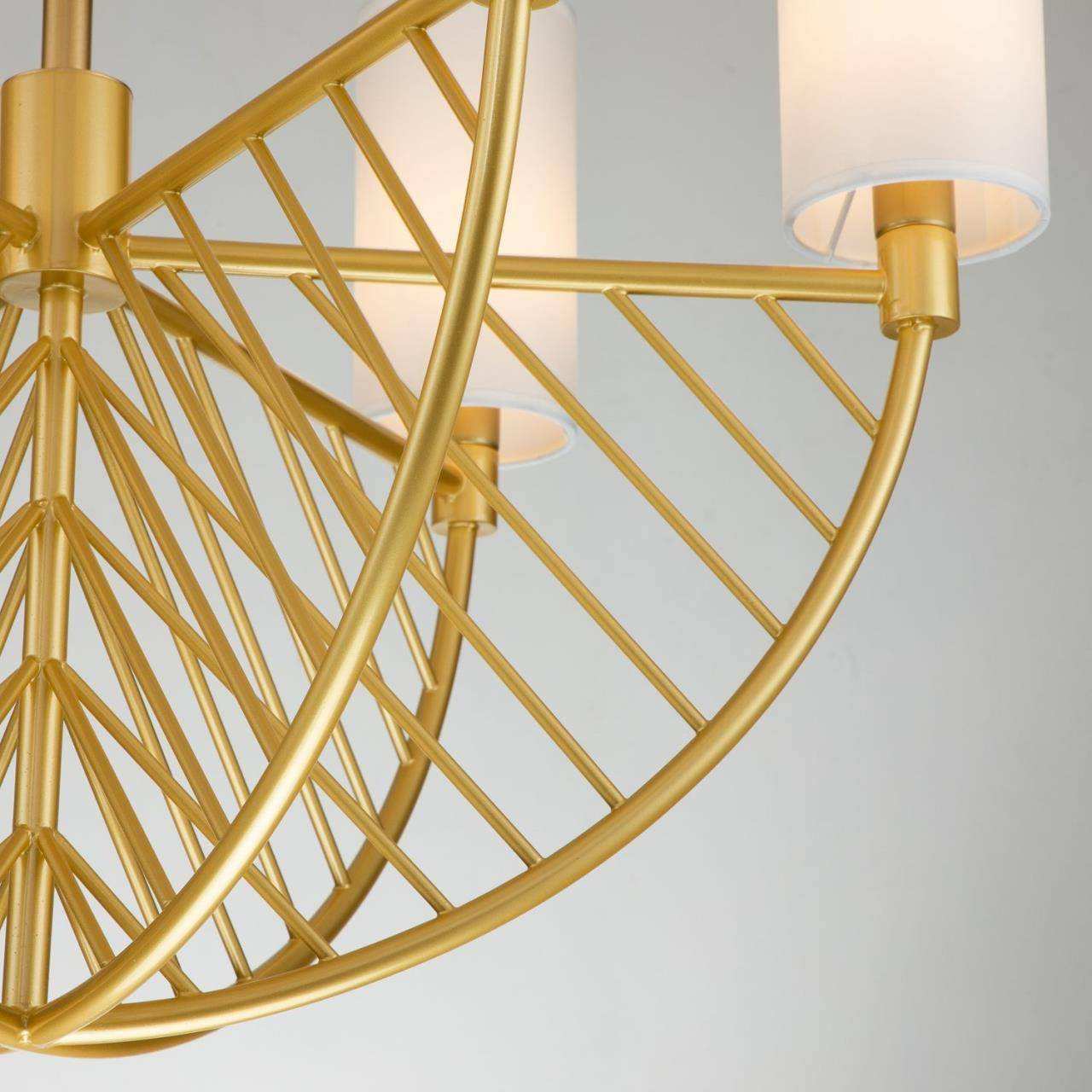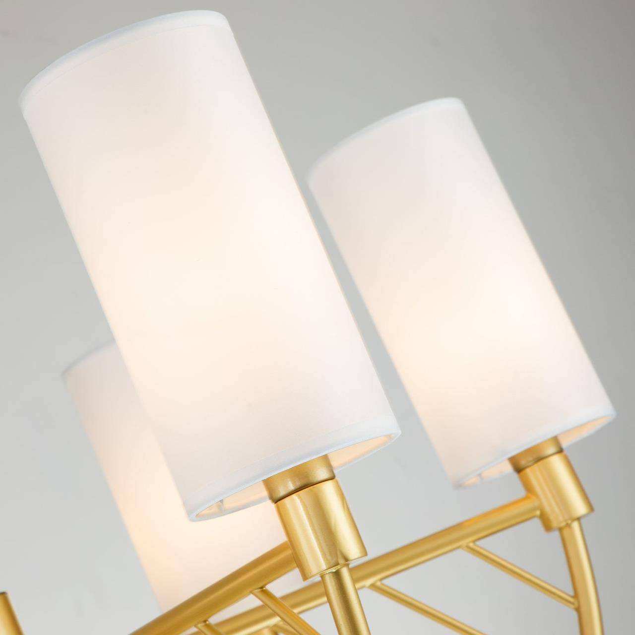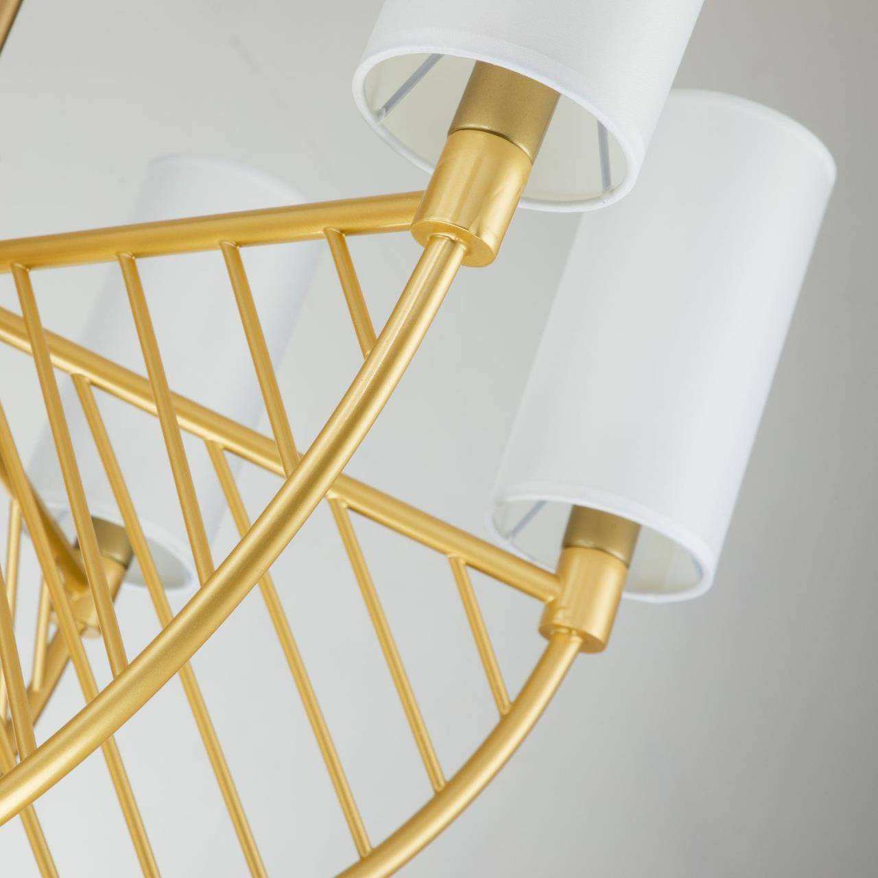 каркас цвета матовое золото, плафоны из ткани белого цвета, высота люстры регулируется благодаря составному центральному штоку