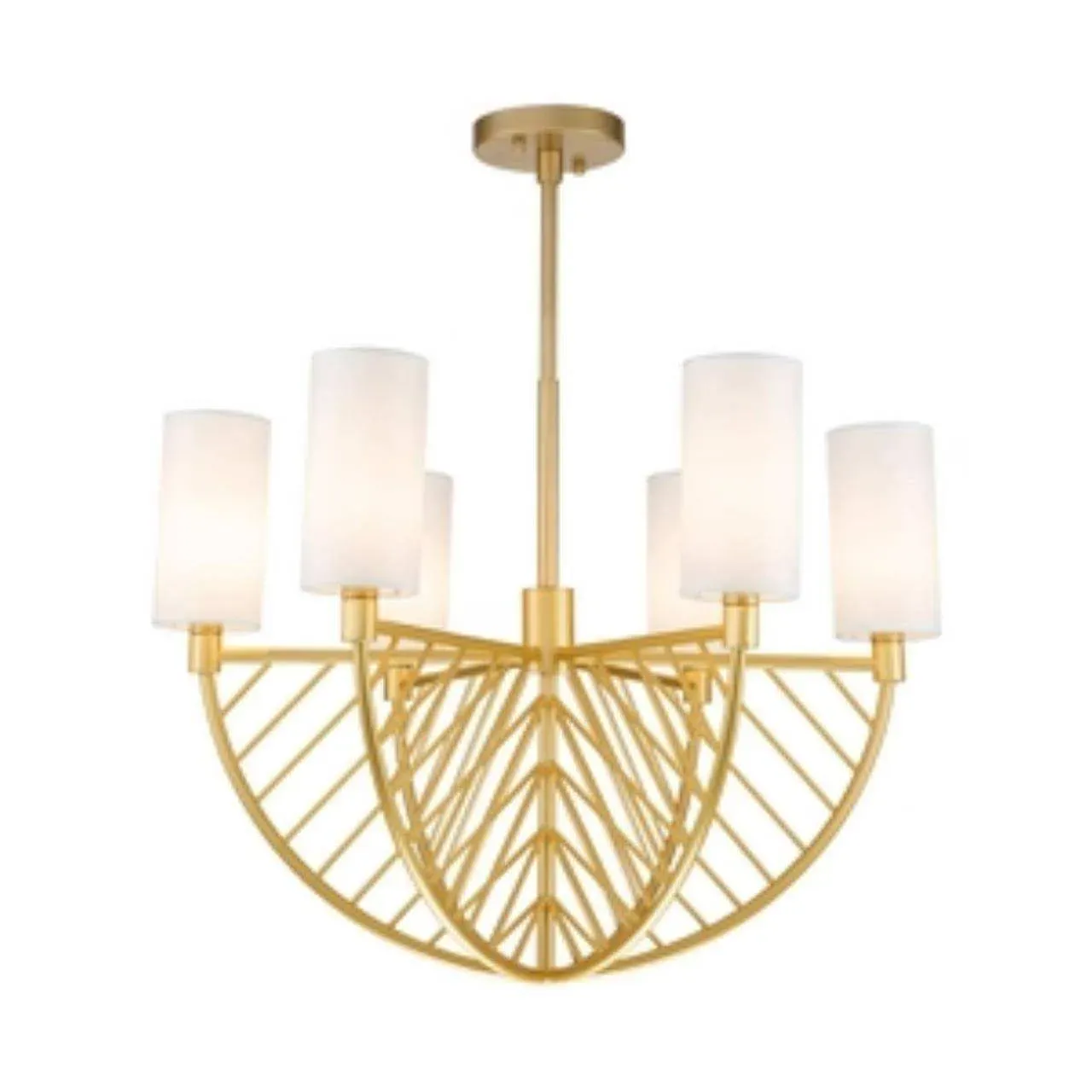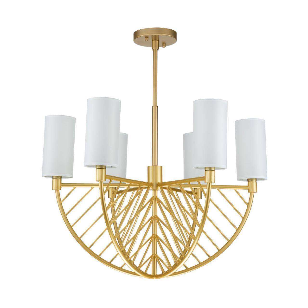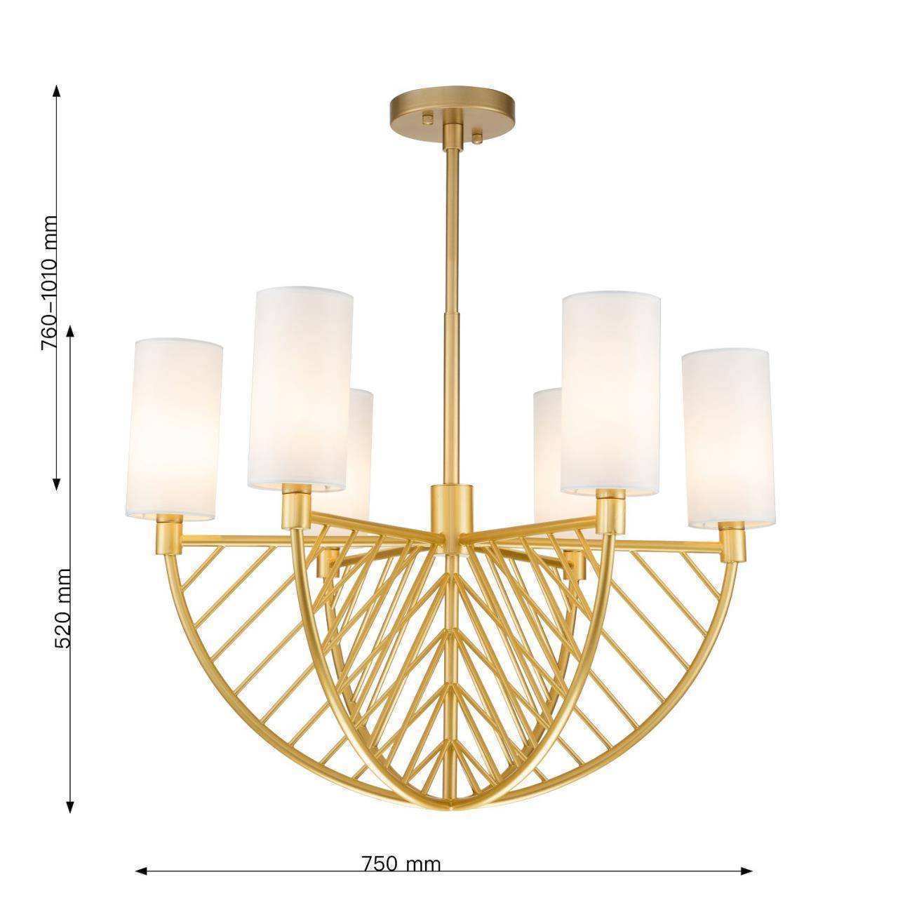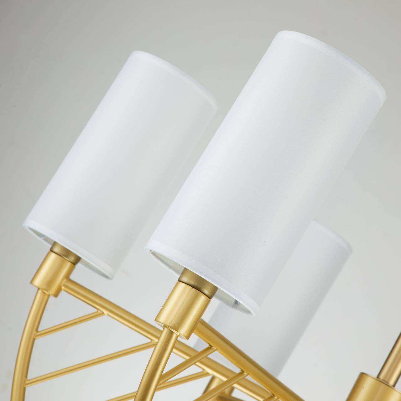 Каркас цвета матовое золото, плафоны из ткани белого цвета, высота люстры регулируется благодаря составному центральному штоку