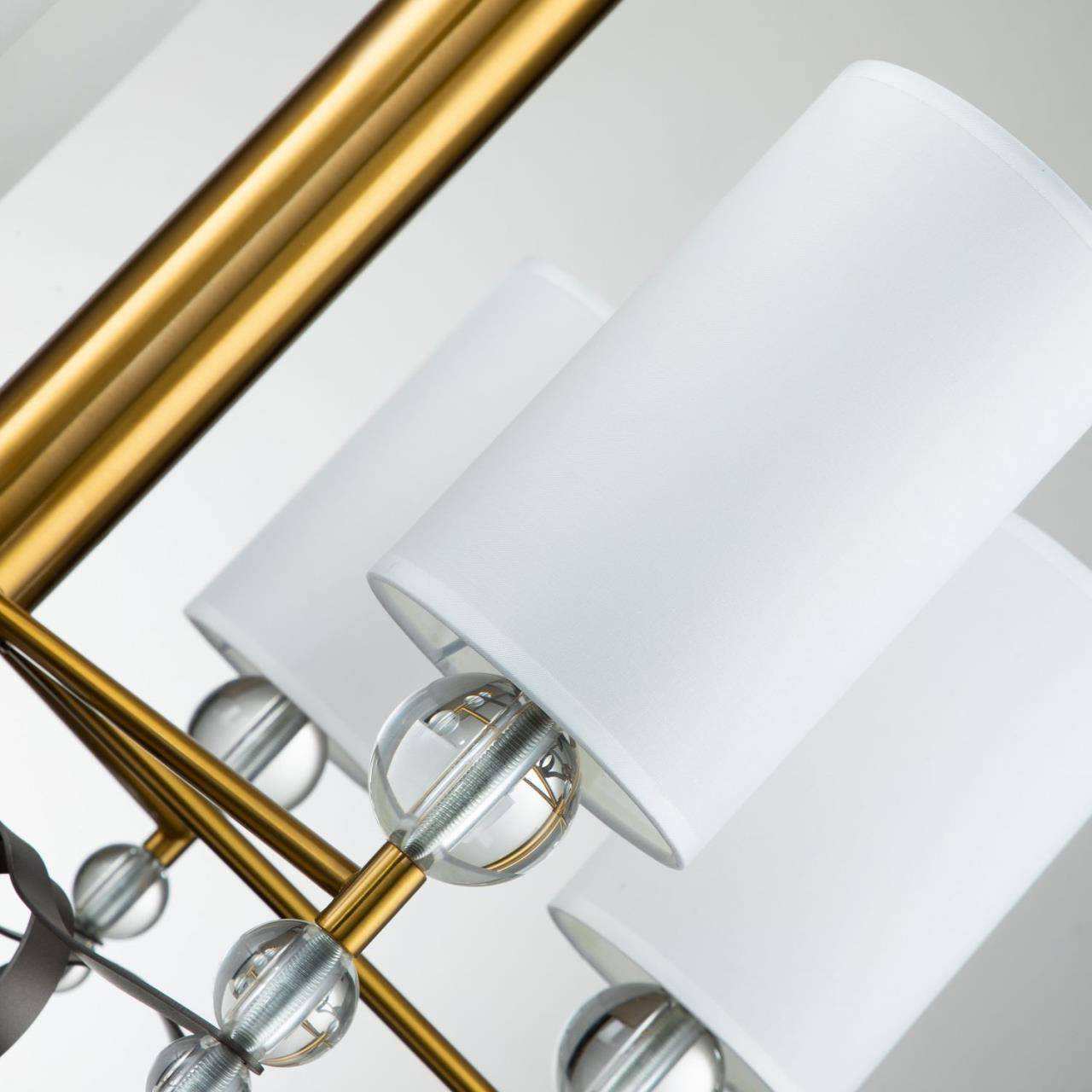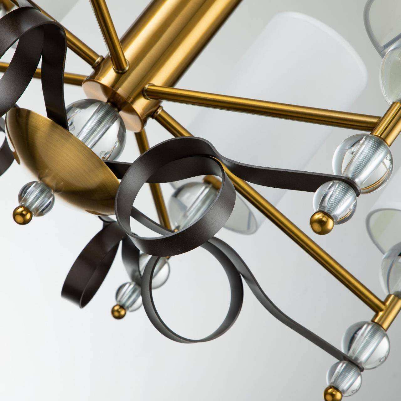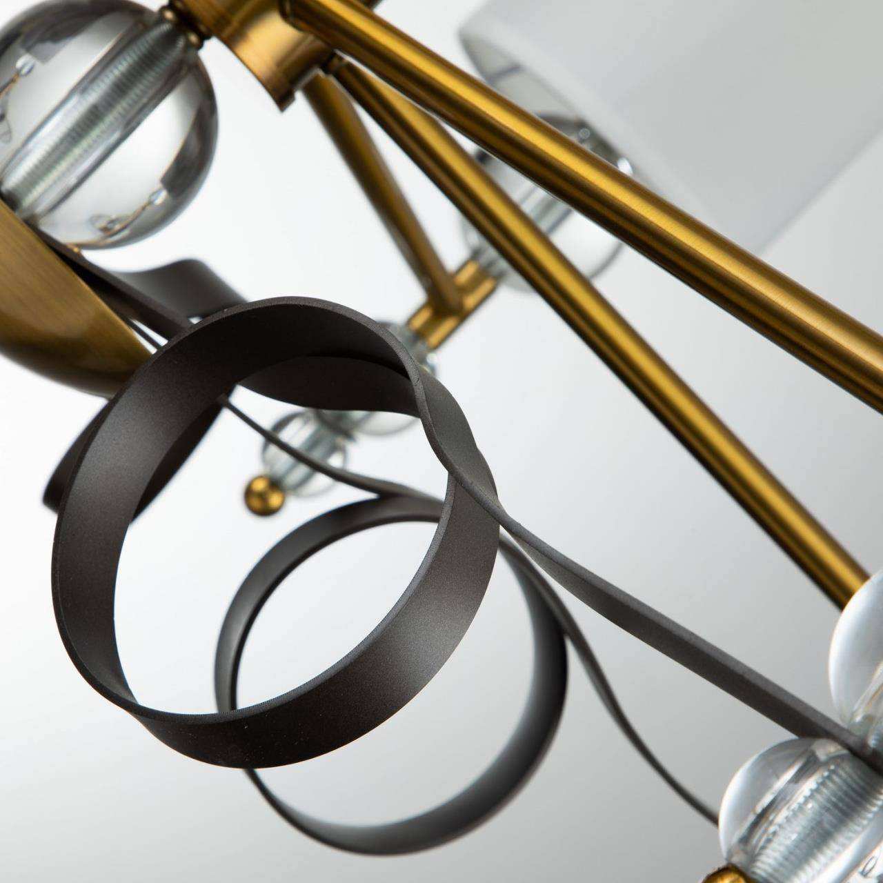 каркас цвета латуни, декоративные металлические ленты темно-коричневого цвета, декоративные стеклянные шары на рожках, плафоны из ткани белого цвета