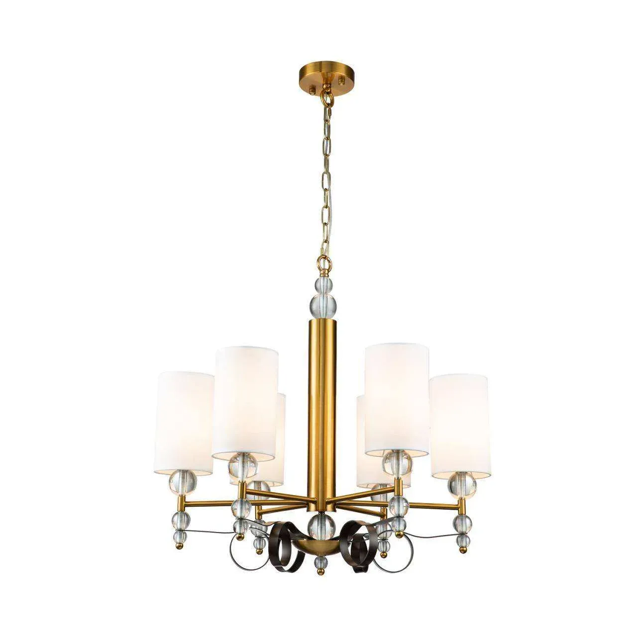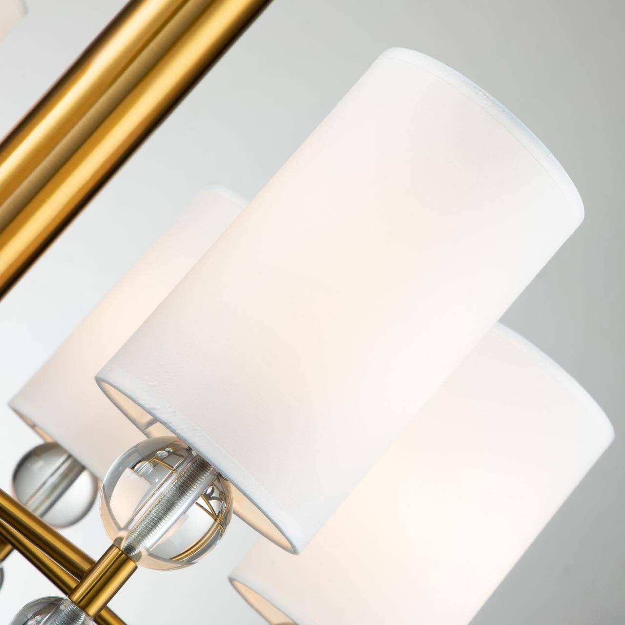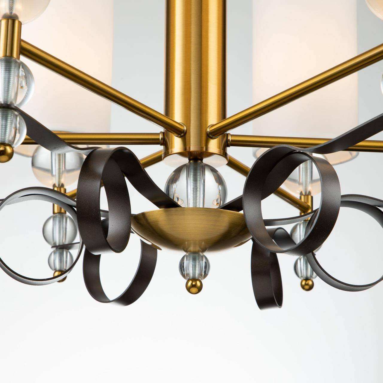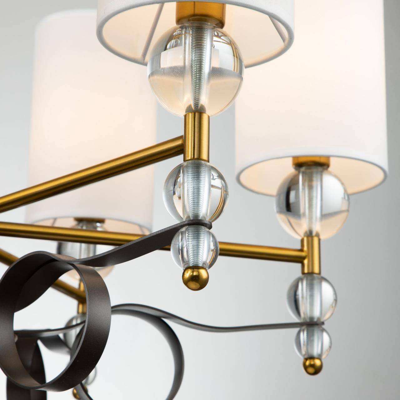 каркас цвета латуни, декоративные металлические ленты темно-коричневого цвета, декоративные стеклянные шары на рожках, плафоны из ткани белого цвета