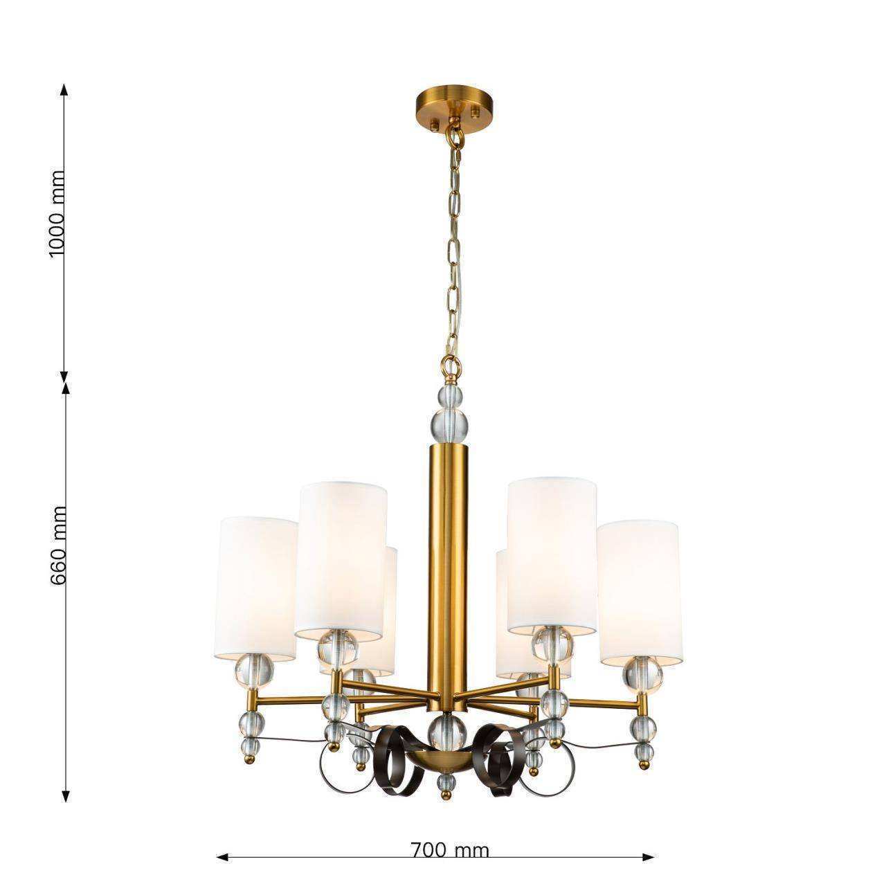 Каркас цвета латуни, декоративные металлические ленты темно-коричневого цвета, декоративные стеклянные шары на рожках, плафоны из ткани белого цвета