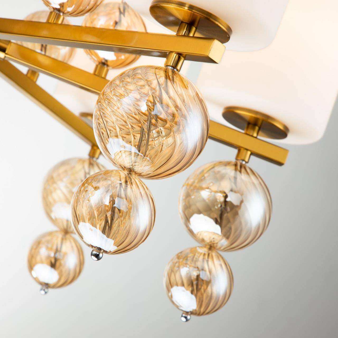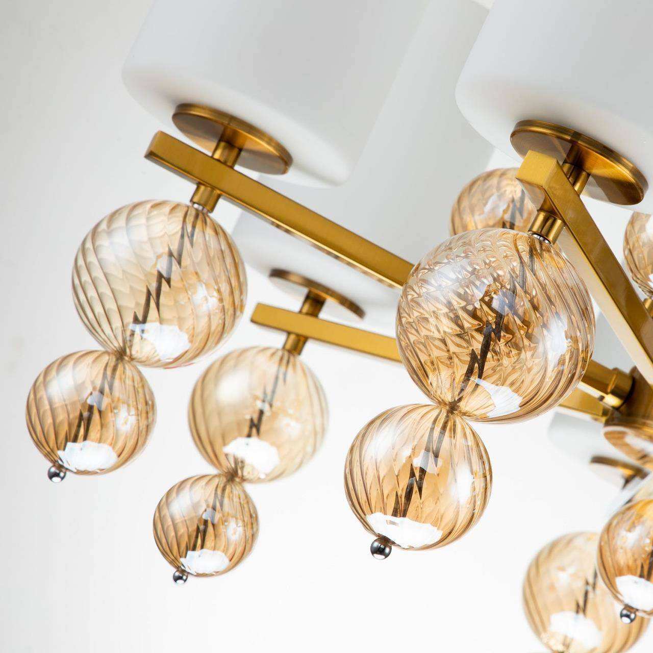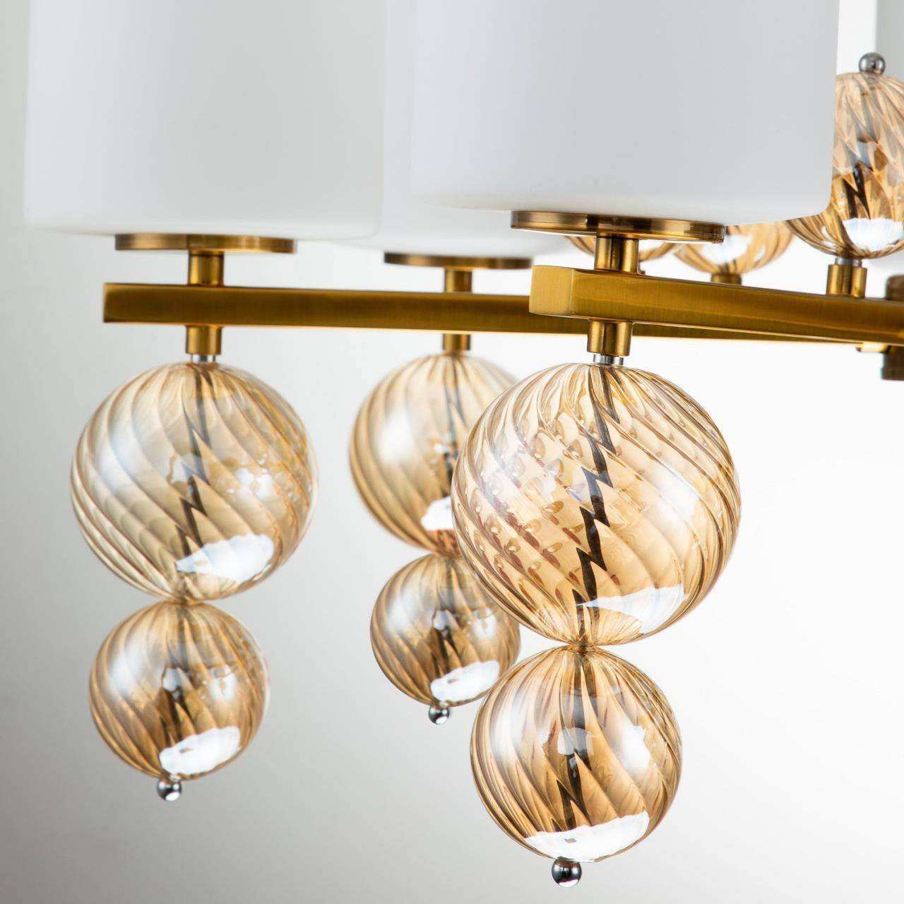 Каркас цвета латуни, декор в виде узорных выдувных стеклянных шаров янтарного цвета, белый керамический шар на центральном штоке, плафоны из стекла бе