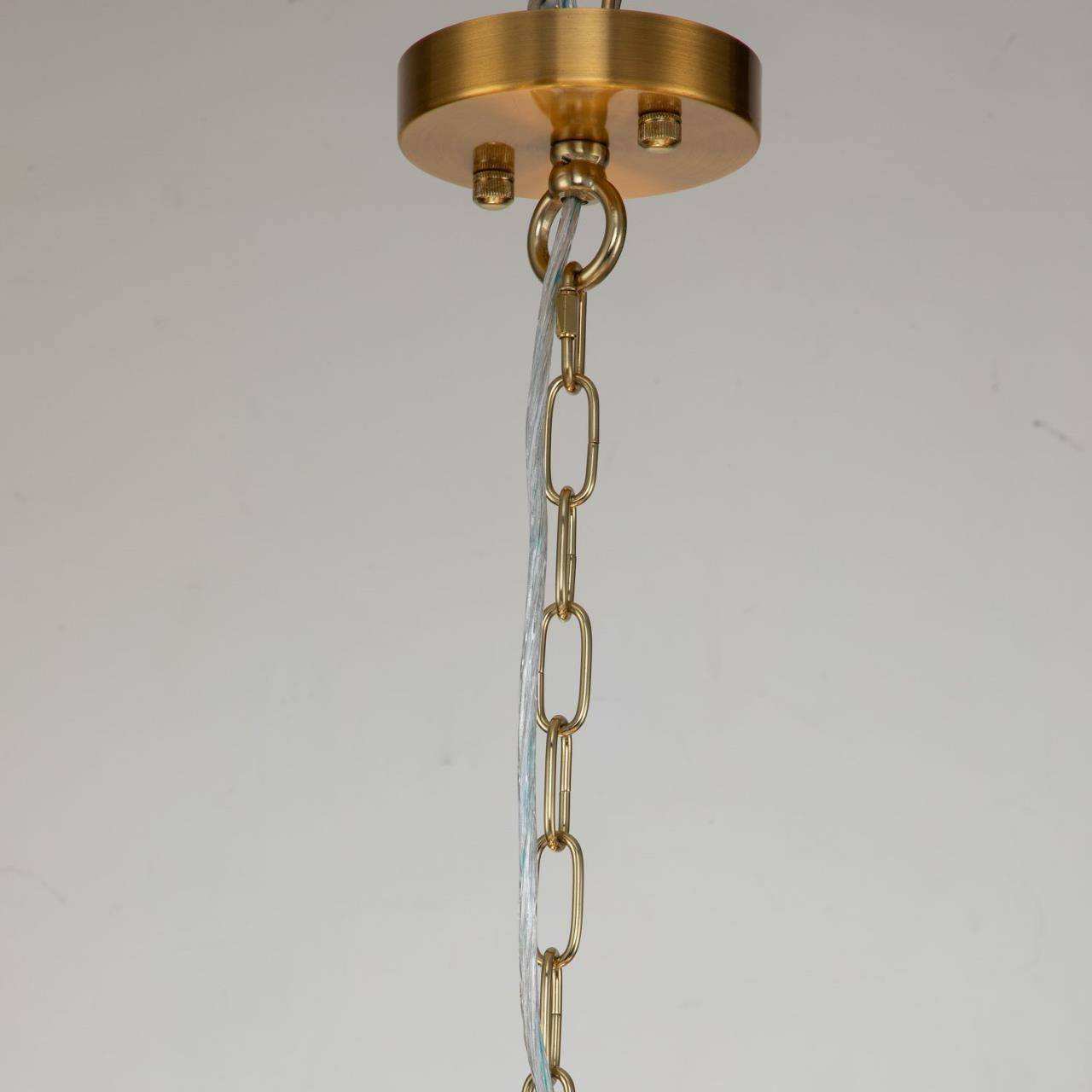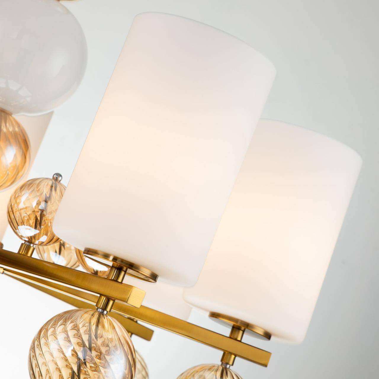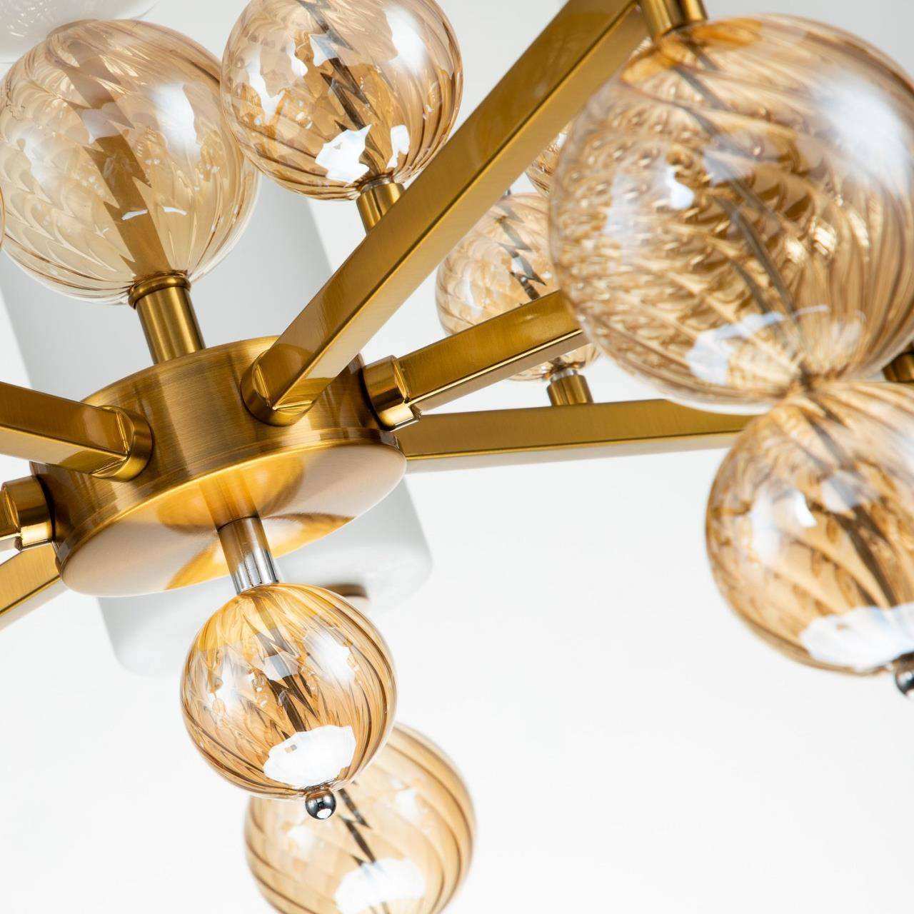 Каркас цвета латуни, декор в виде узорных выдувных стеклянных шаров янтарного цвета, белый керамический шар на центральном штоке, плафоны из стекла бе