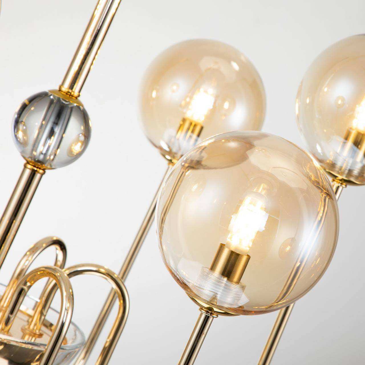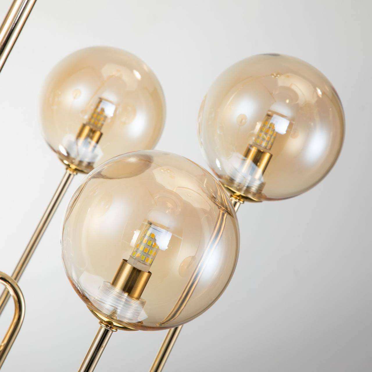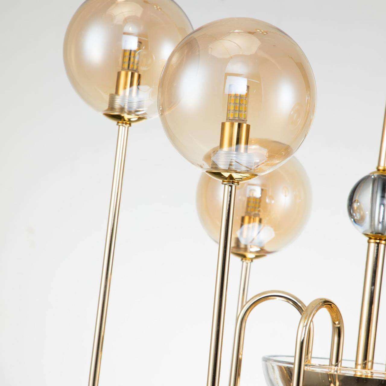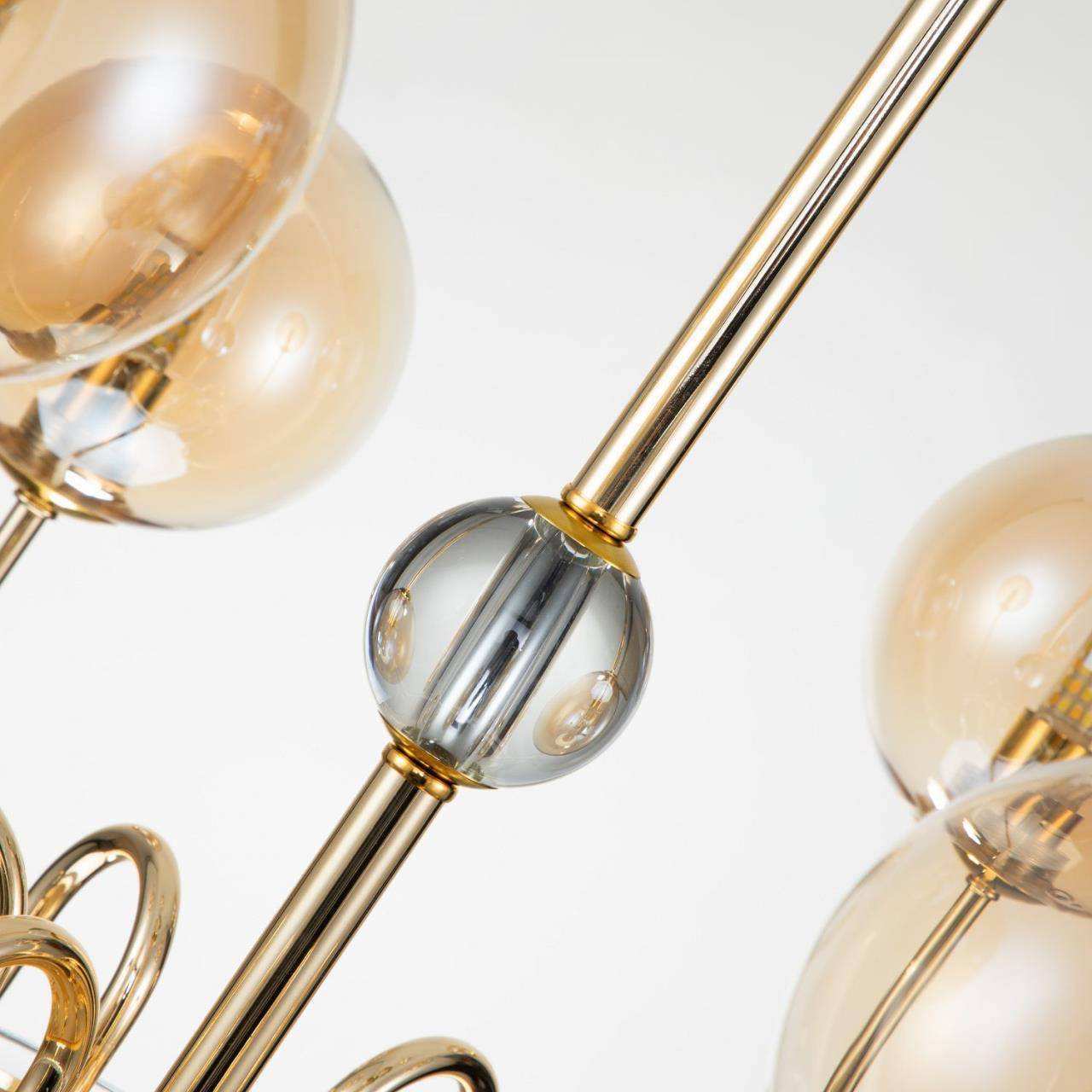 Каркас цвета золотой гальваники, на центральном штоке декор в виде стеклянного шара, выдувные плафоны янтарного цвета