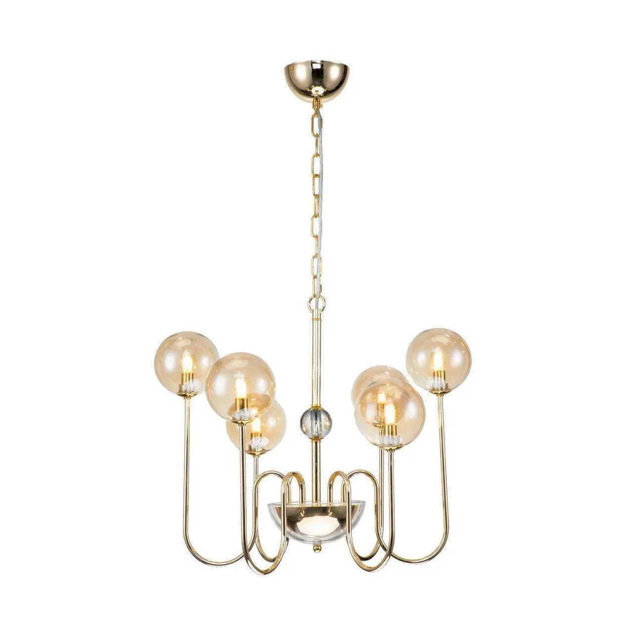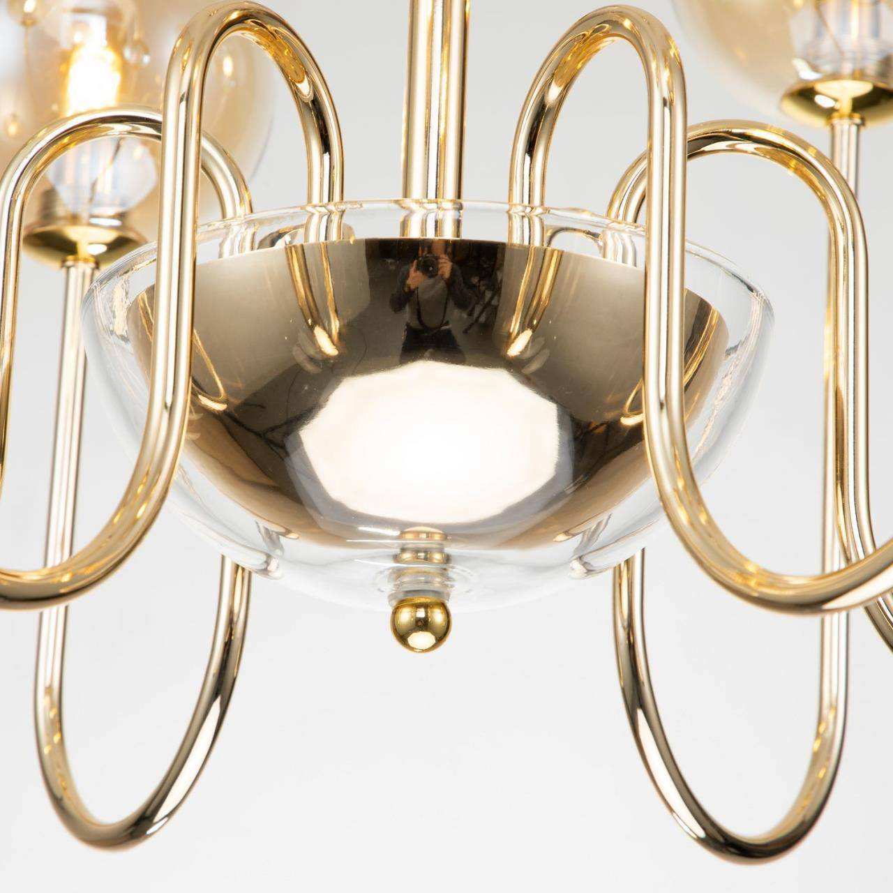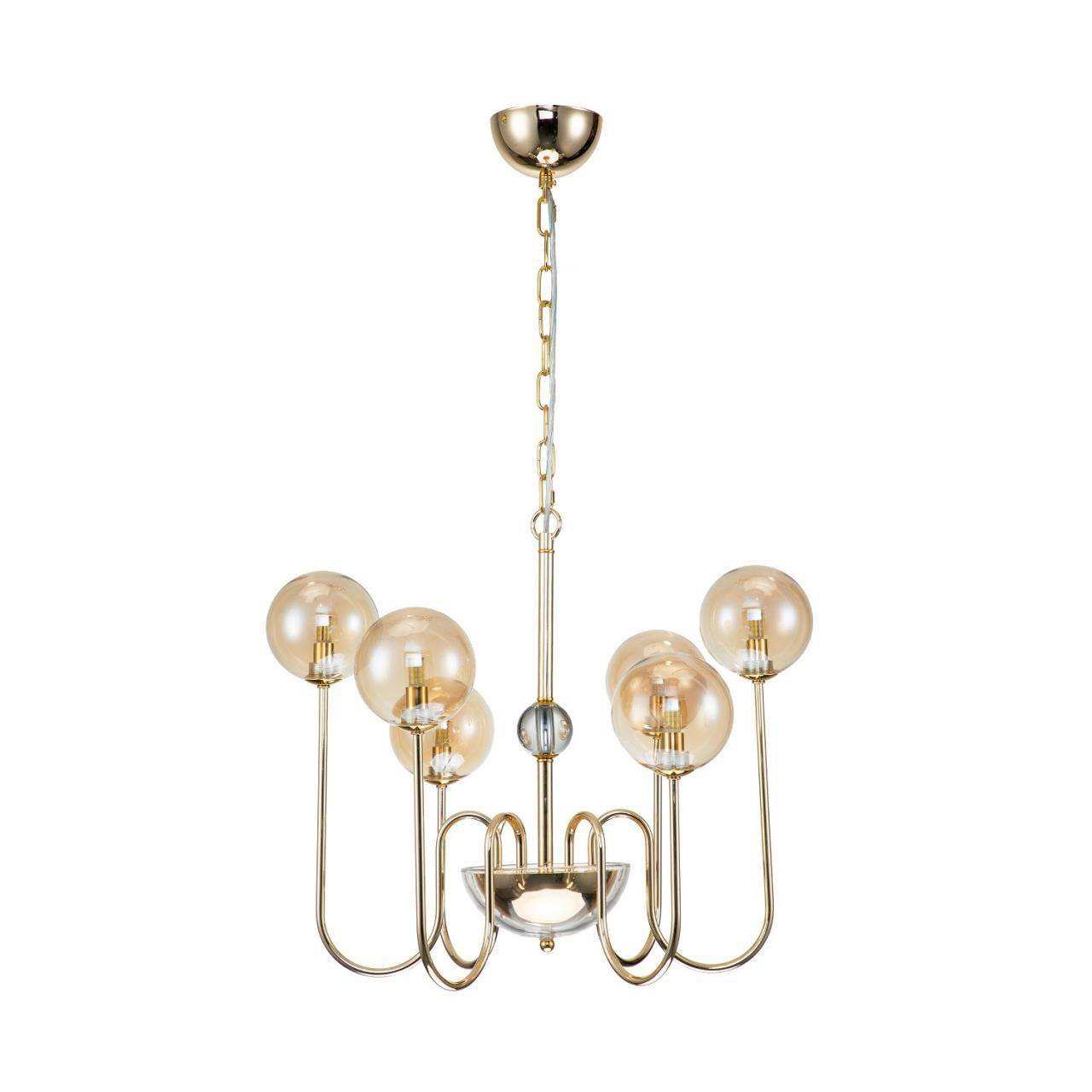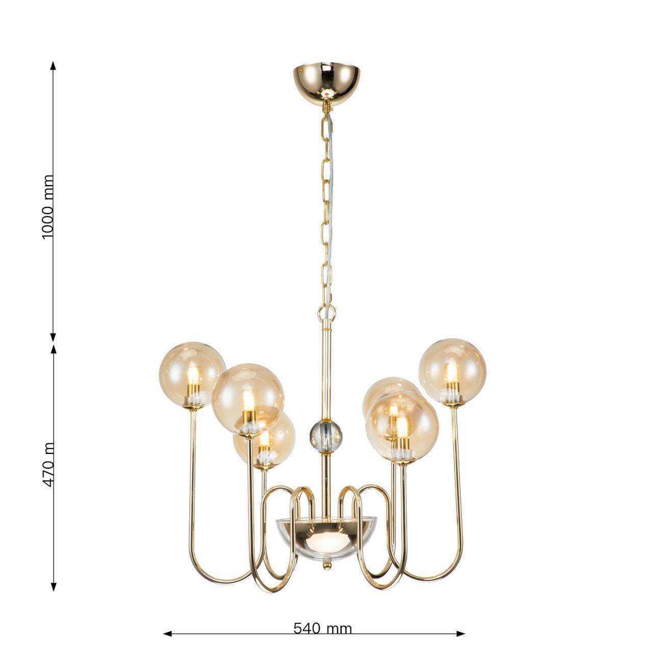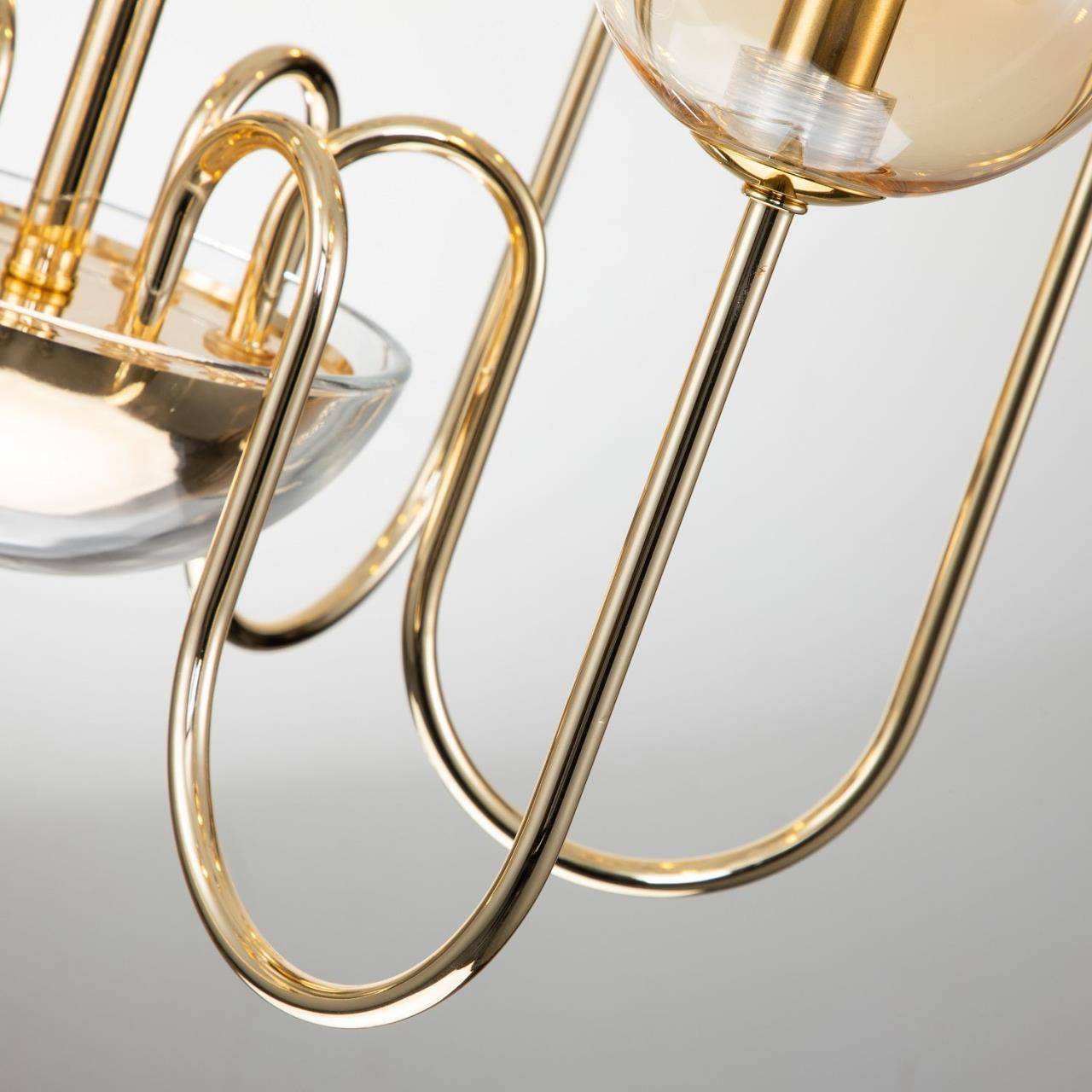 Каркас цвета золотой гальваники, на центральном штоке декор в виде стеклянного шара, выдувные плафоны янтарного цвета