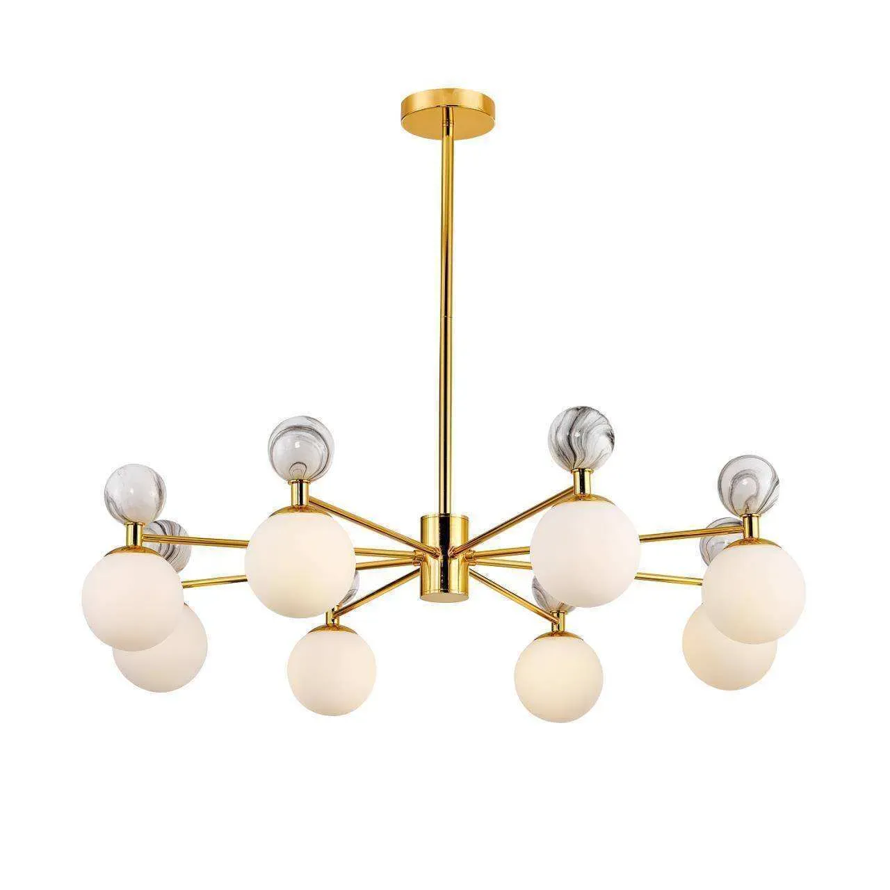 Каркас цвета золота, плафоны из матового белого стекла, декоративные элементы из керамики цвета белого мрамора, лампу g9 можно менять
