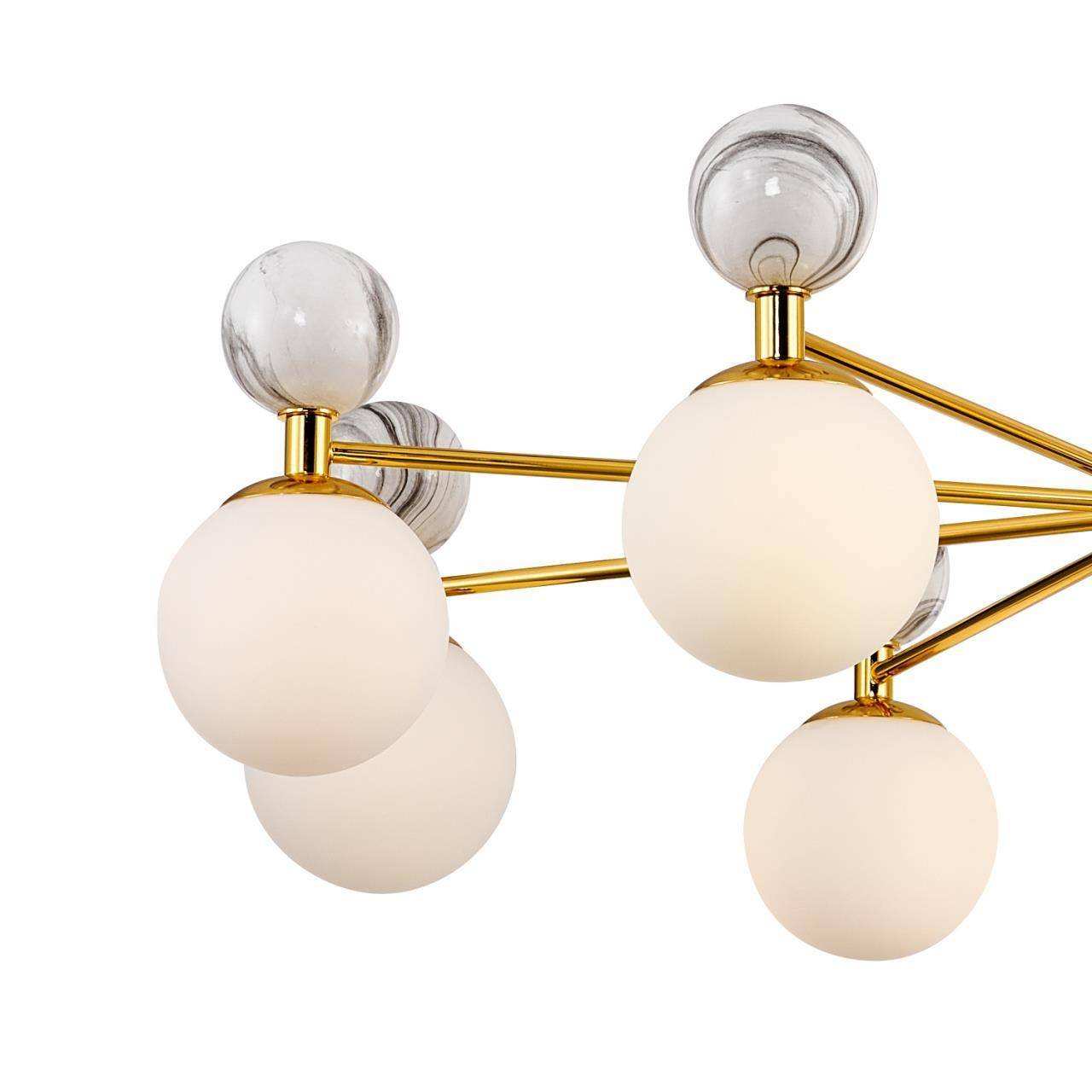 каркас цвета золота, плафоны из матового белого стекла, декоративные элементы из керамики цвета белого мрамора, лампу G9 можно менять