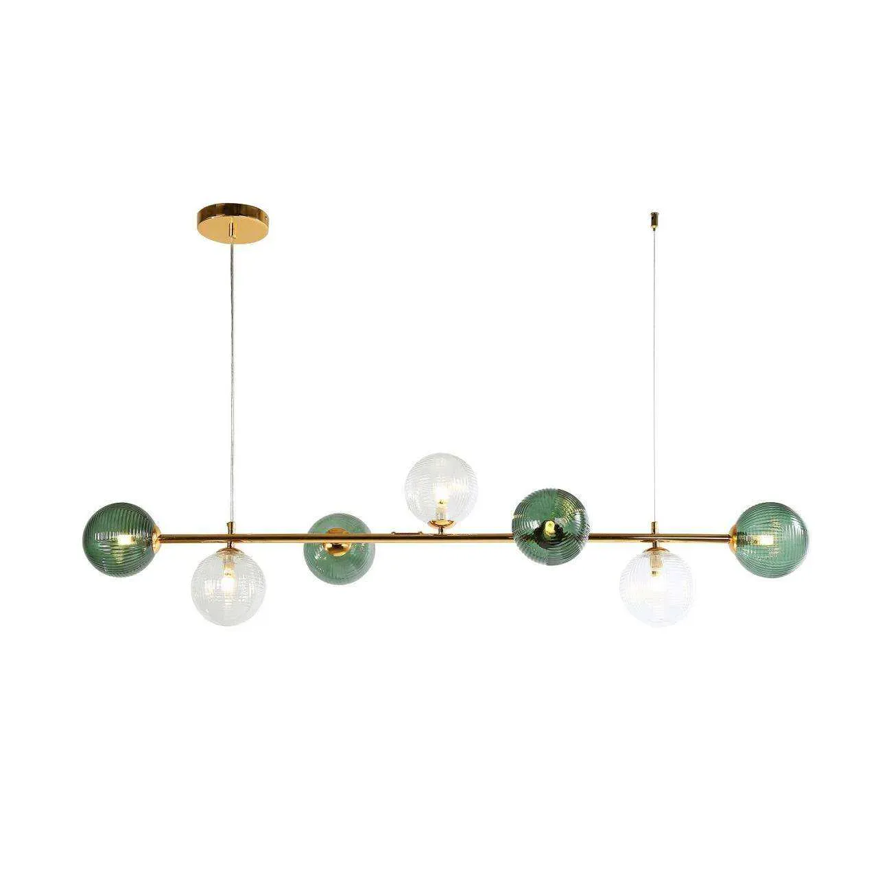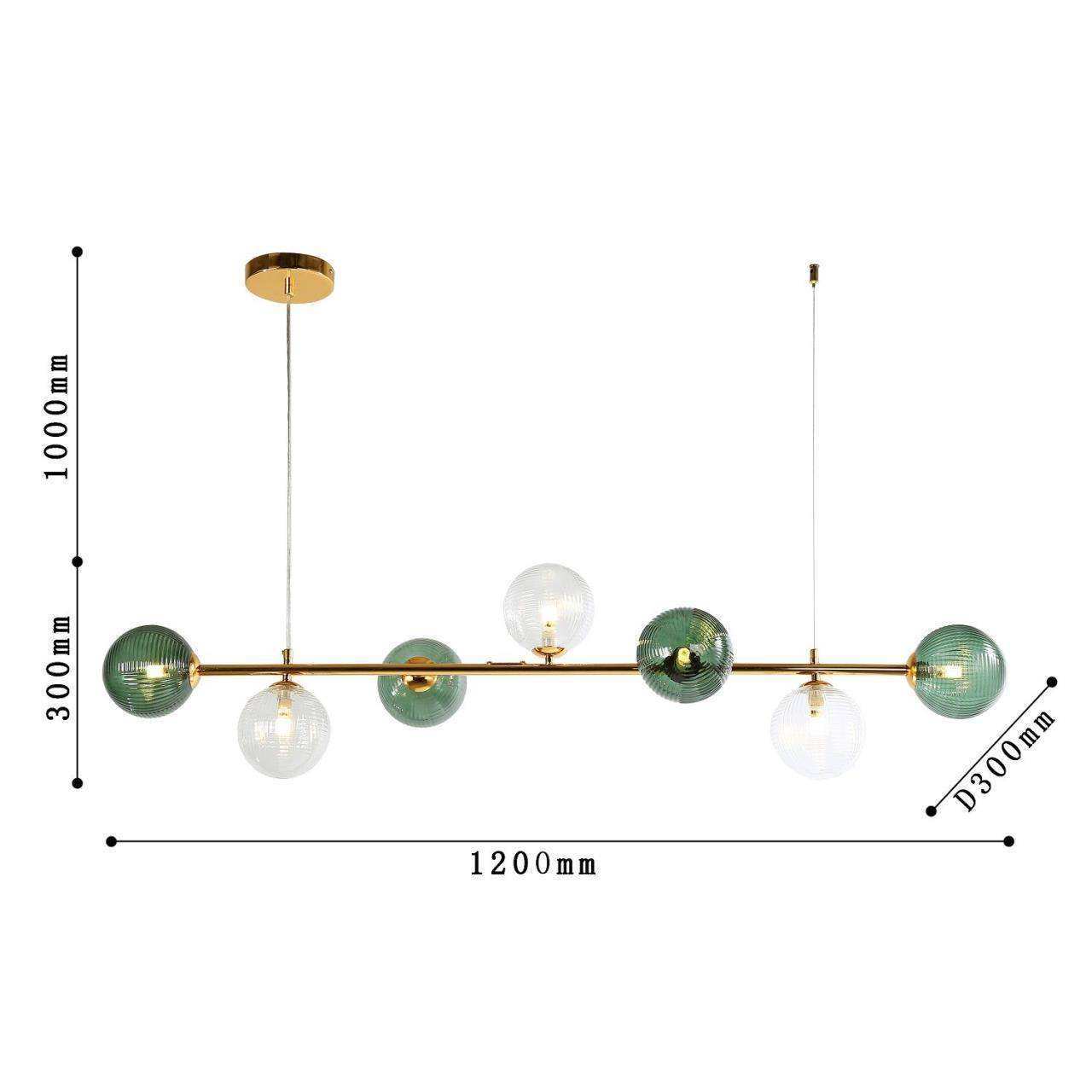 каркас цвета светлого золота, стеклянные плафоны прозрачного и зеленого цвета, лампу G9 можно менять