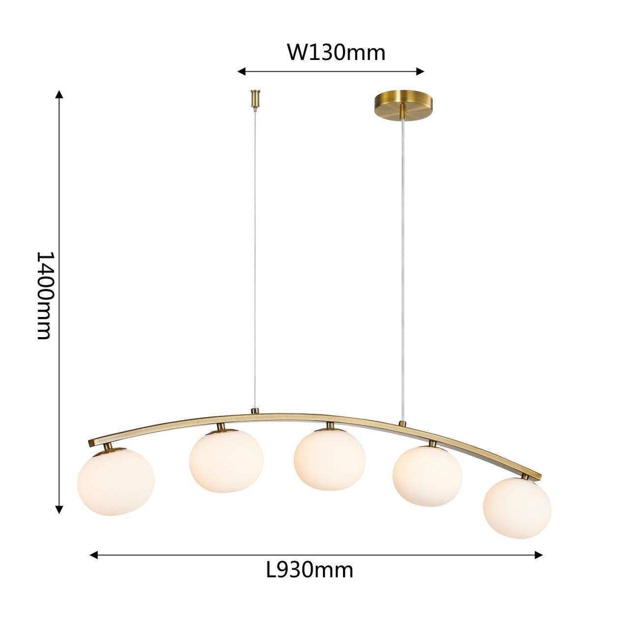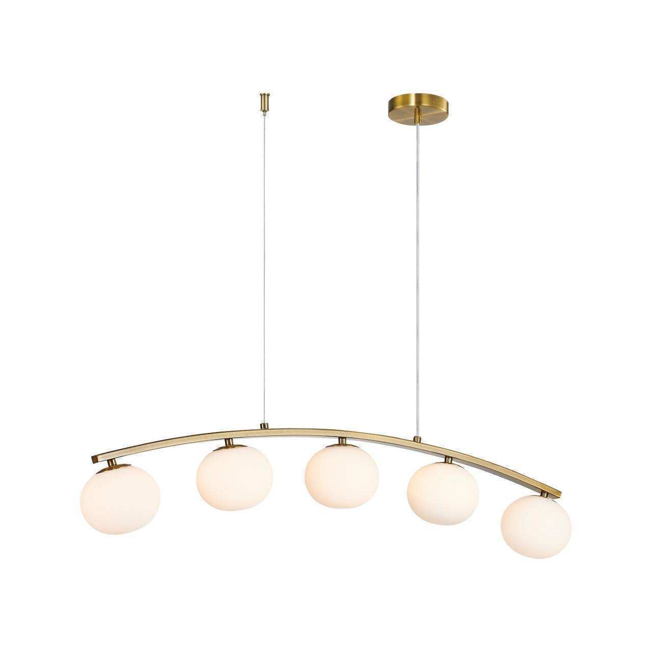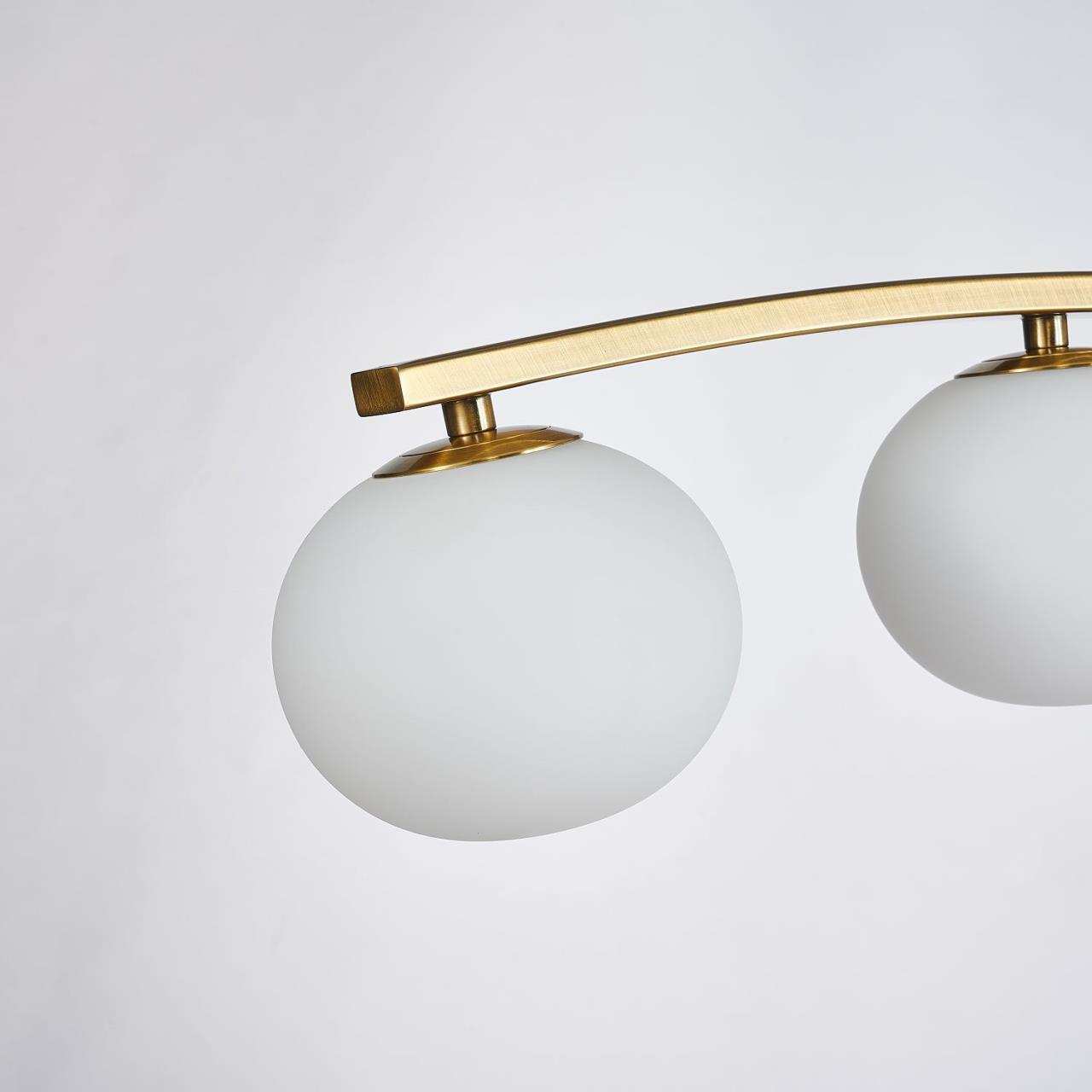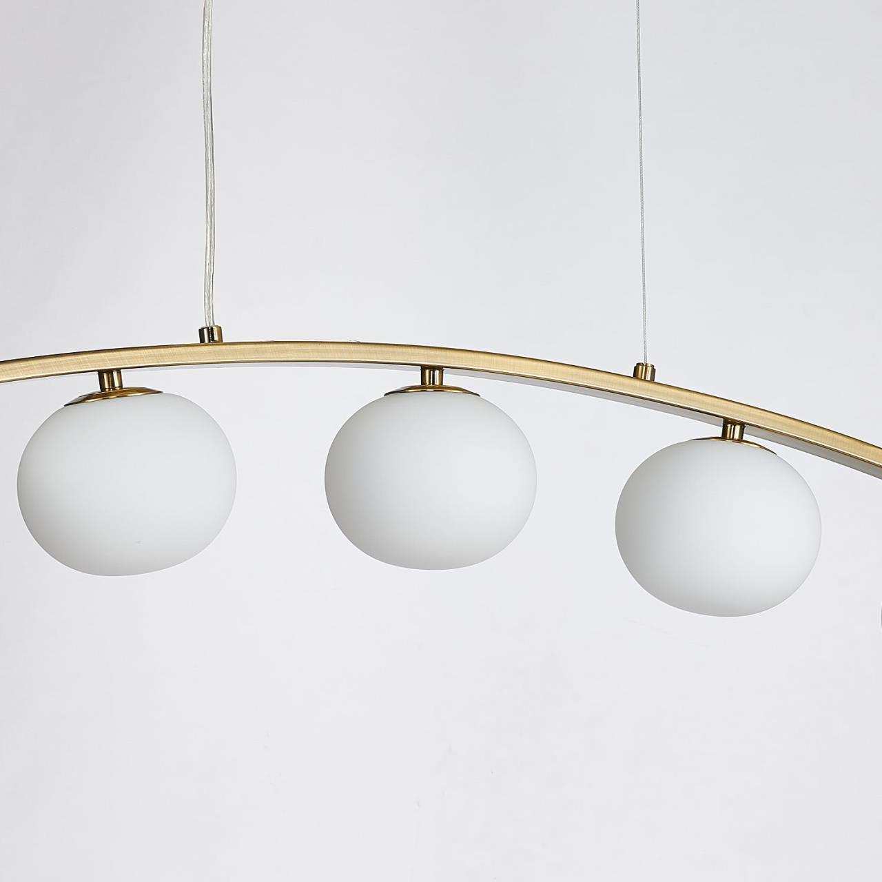 Дугообразный каркас цвета матового золота, плафоны из выдувного стекла цвета опала, лампу g9 можно менять, часть каркаса фиксируется тросиком для бала