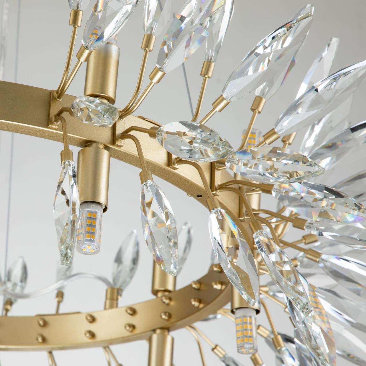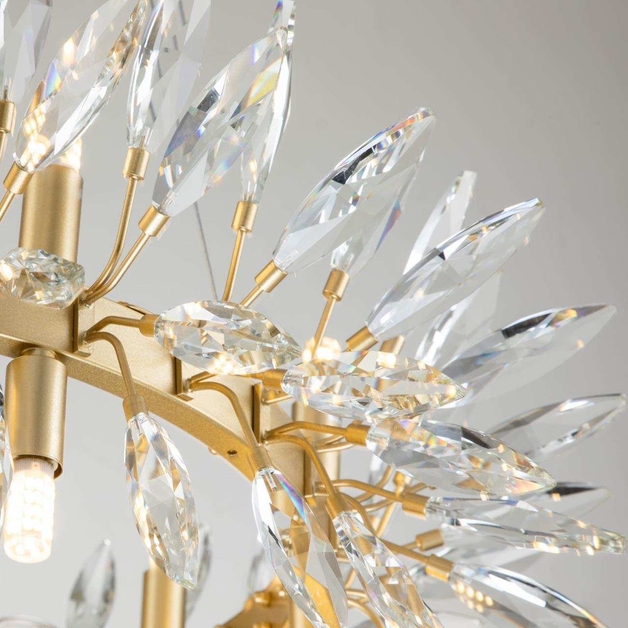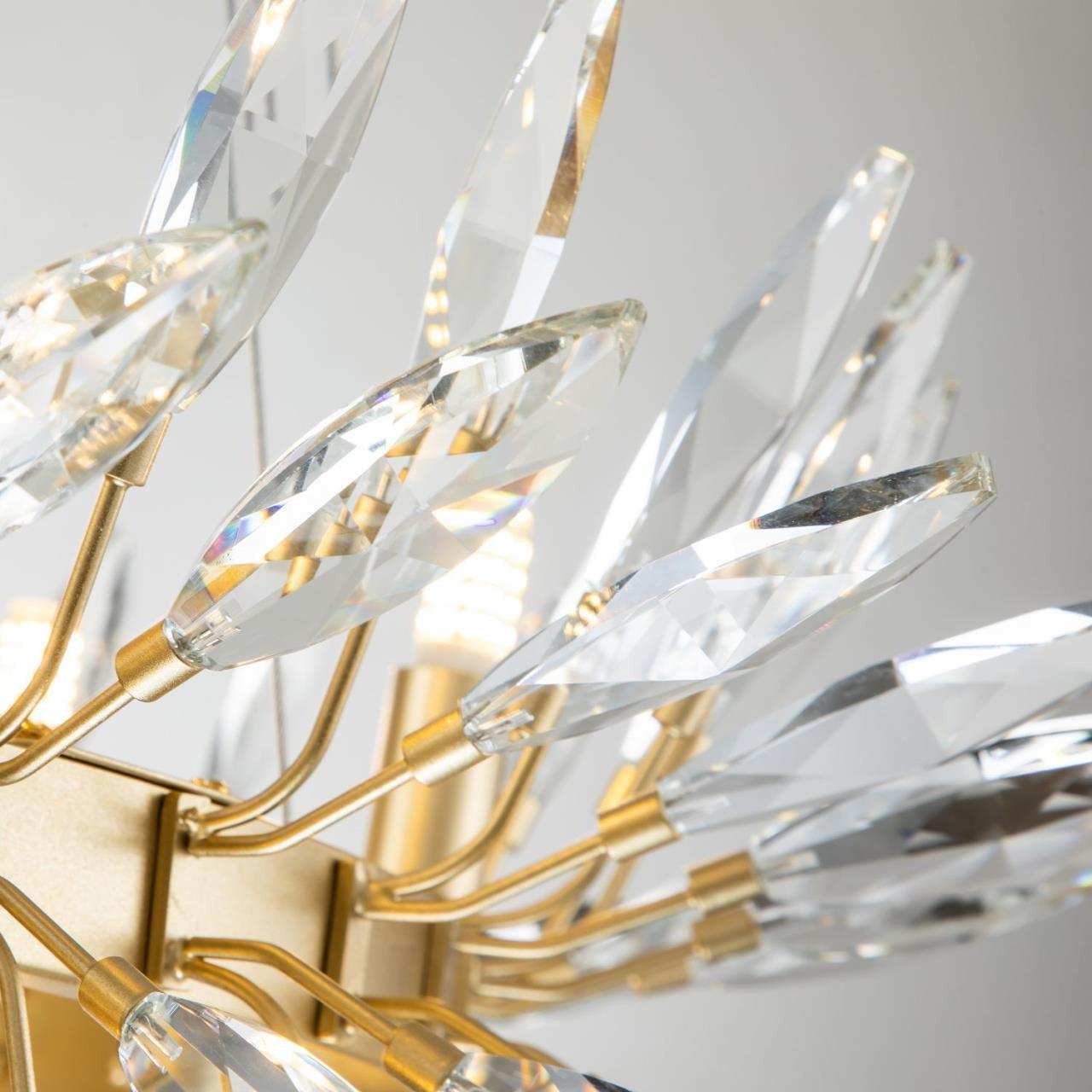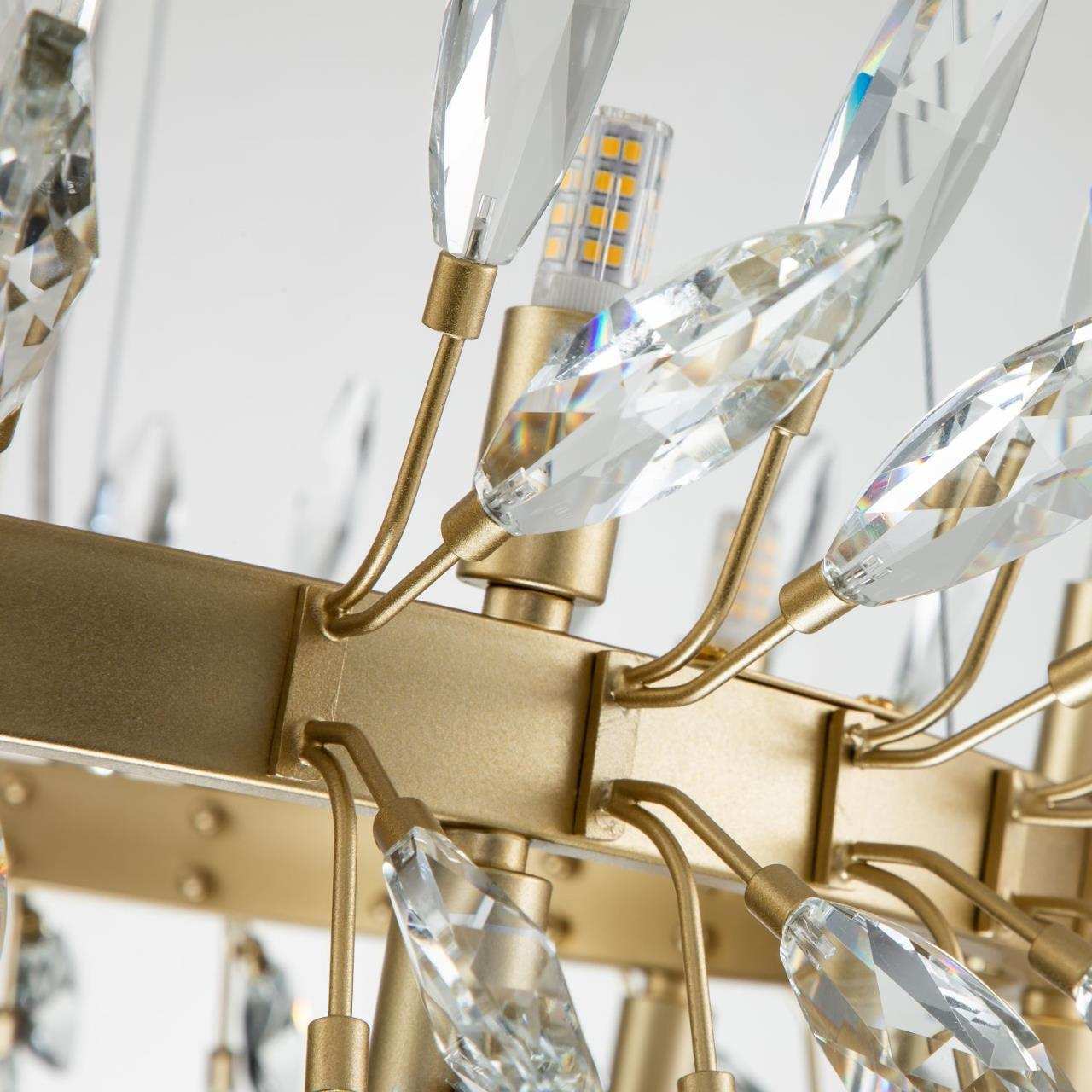 Каркас цвета золота, источники света направлены вверх и вниз, декоративные элементы из прозрачного хрусталя миндалевидной формы, лампу g9 можно менять