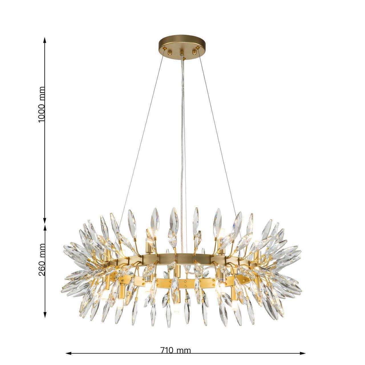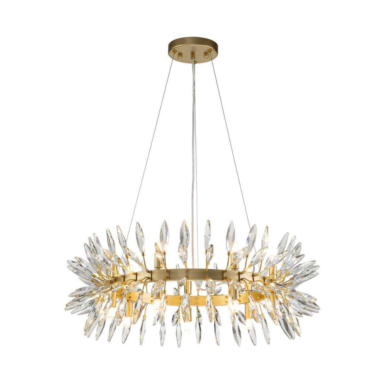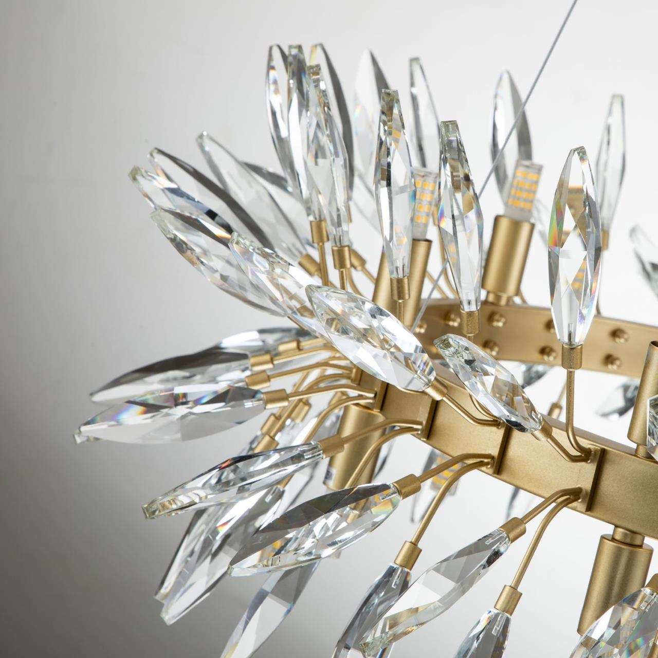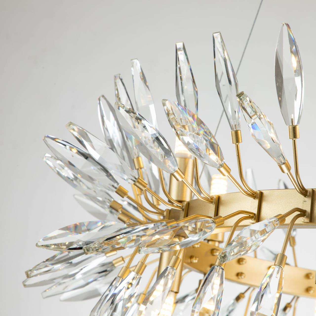 Каркас цвета золота, источники света направлены вверх и вниз, декоративные элементы из прозрачного хрусталя миндалевидной формы, лампу g9 можно менять
