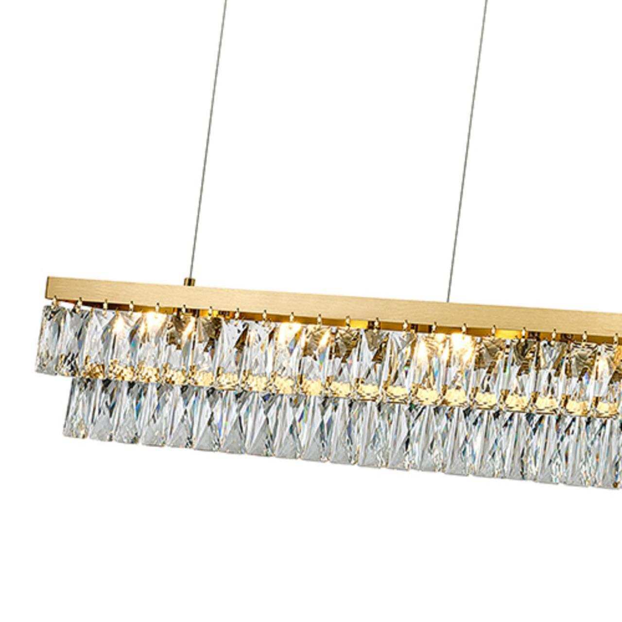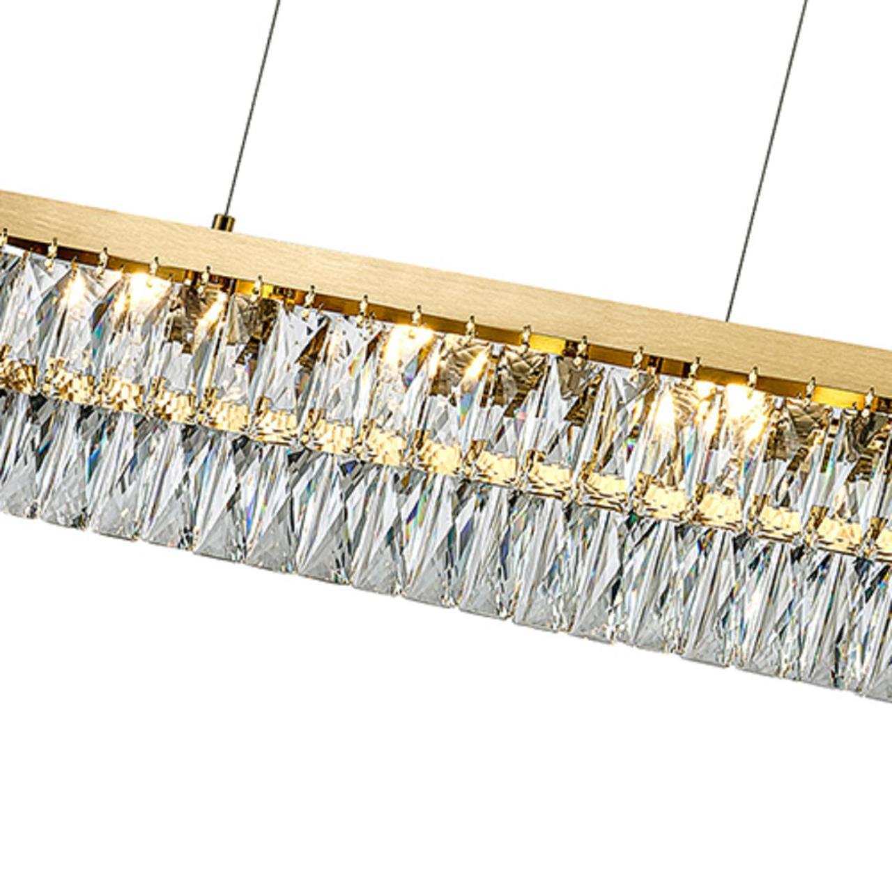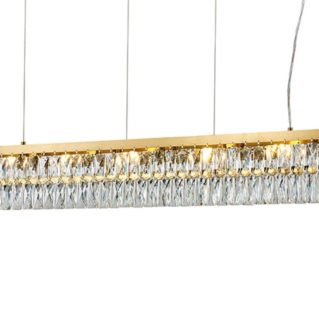 Прямоугольный каркас цвета золота, плафон состоит из прозрачного хрусталя оригинальной формы, часть каркаса фиксируется тросиками для баланса