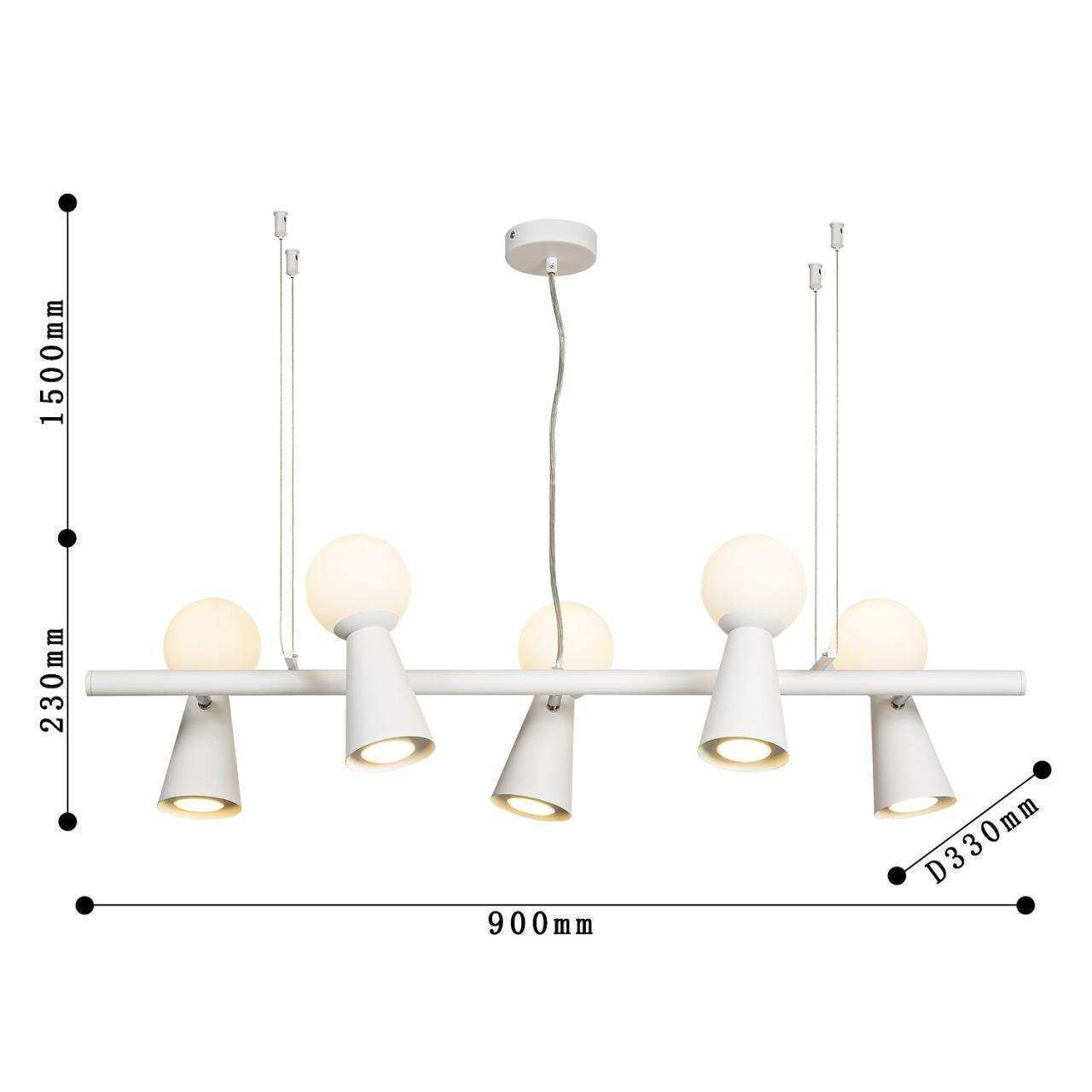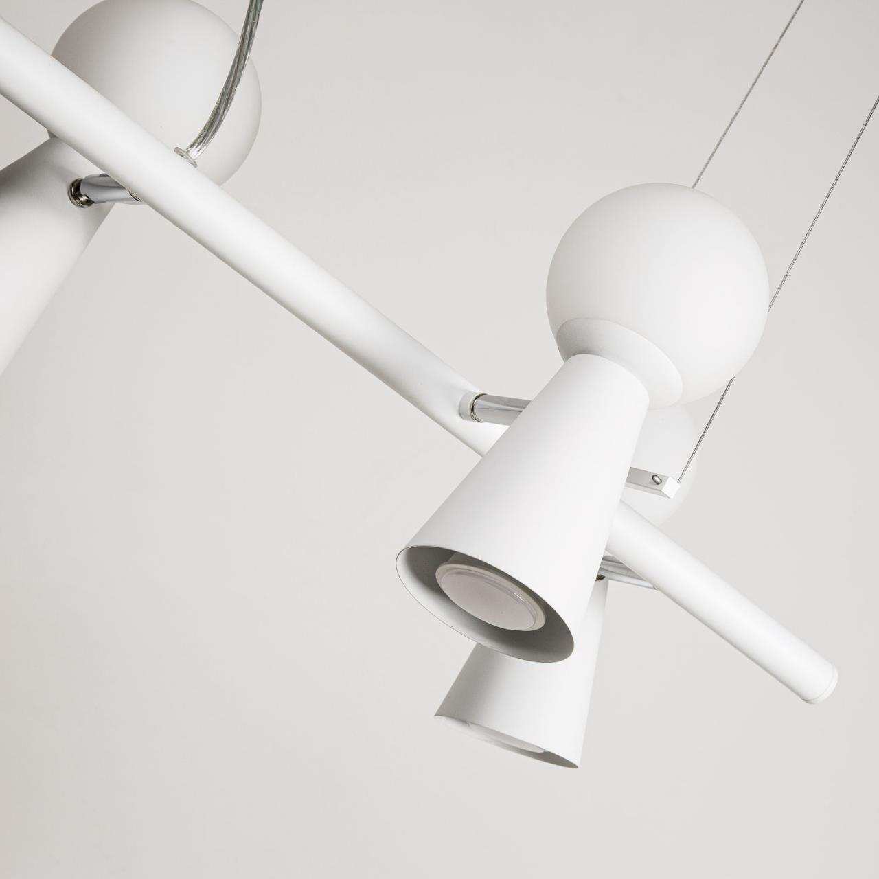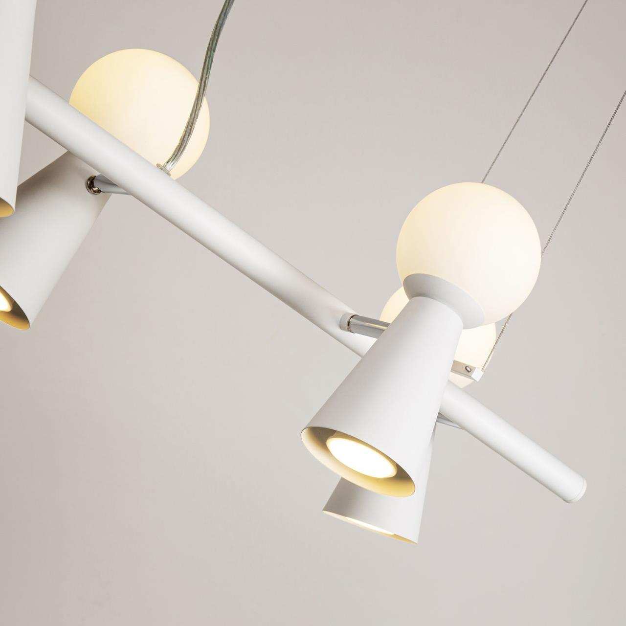 Каркас белого цвета, поворотные плафоны с двумя источниками света - стеклянный выдувной матовый шар с лампой g9 и металлический конус с лампой gu10, л