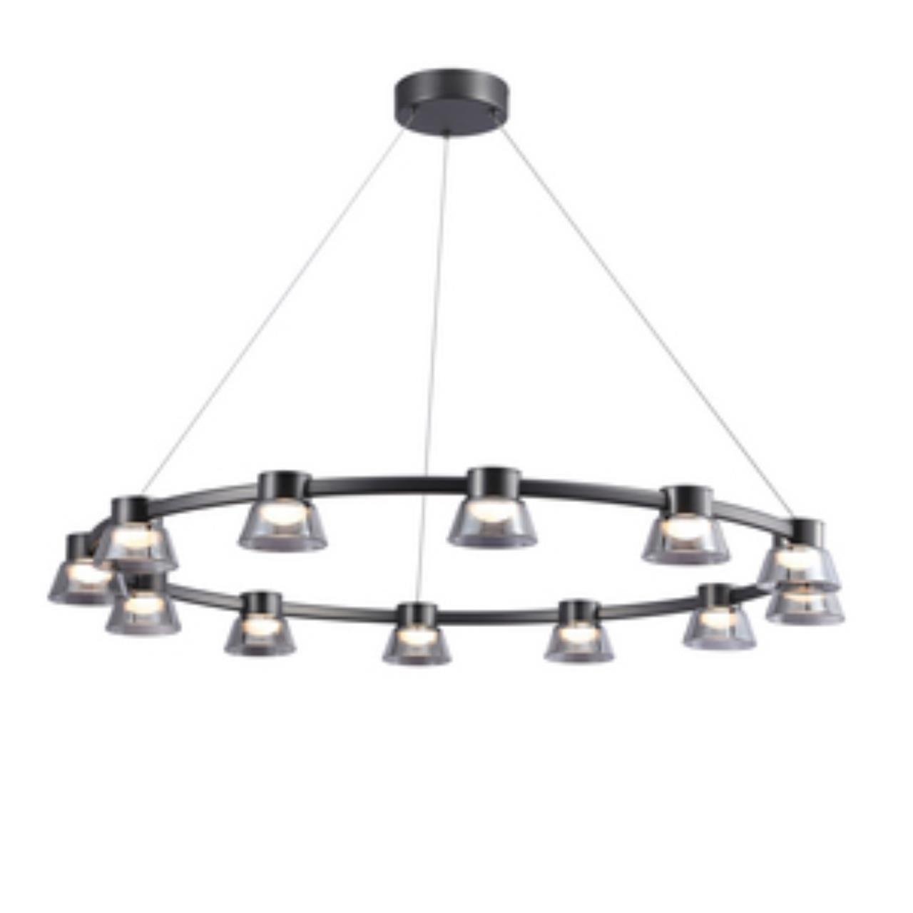 Подвесная люстра диаметром 100 см с прозрачными рифлеными плафонами, каждый из которых состоит из двух слегка выгнутых стекол, закрепленных на заклепк
