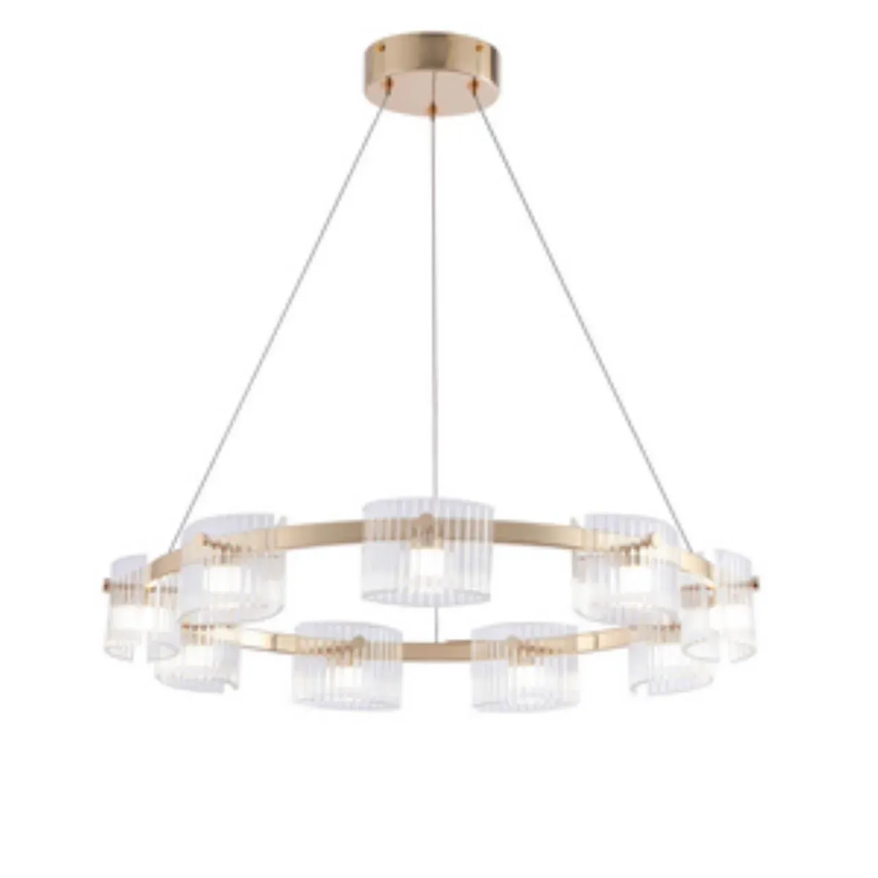 Подвесная люстра диаметром 62 см с прозрачными рифлеными плафонами, каждый из которых состоит из двух слегка выгнутых стекол, закрепленных на заклепка