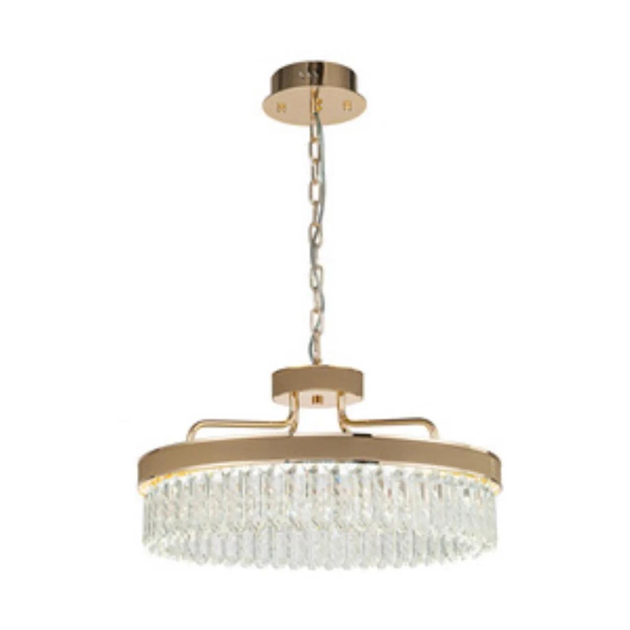 Подвесная люстра диаметром 60 см, декоративное кольцо каркаса в цвете золотой гальваники оттенка шампань украшено вставками из эко-кожи бежевого цвета