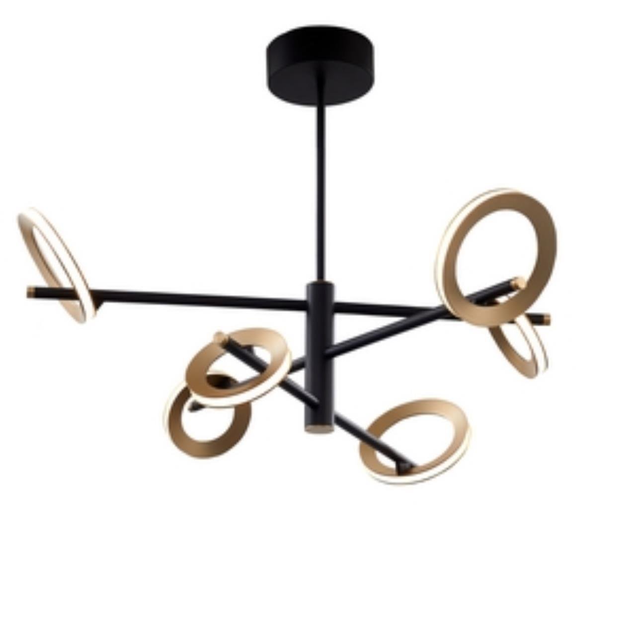 Потолочная люстра сочетает в себе объемные кольца цвета матового золота, которые светятся по периметру с помощью встроенной LED-ленты. Они закреплены