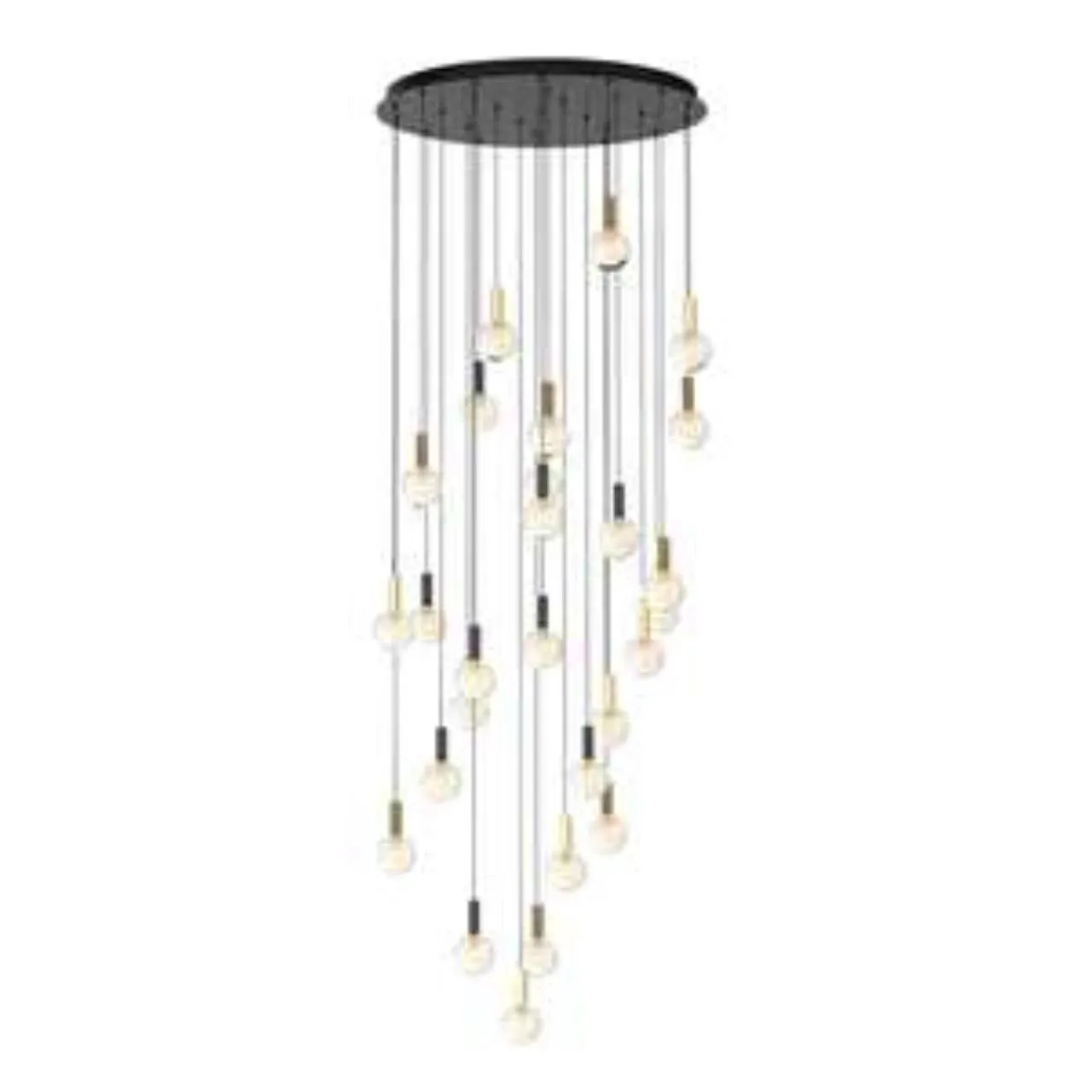 Подвесная каскадная люстра с черным каркасом, с плафонами из двойного стекла — прозрачного снаружи и матового внутри, декоративные цоколи в форме мета