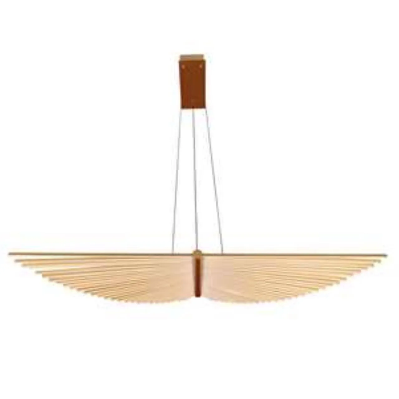Подвесная люстра в цвете матовое золото, в виде распахнутых крыльев, состоит из множества тонких металлических планок, в которые встроены светодиодные