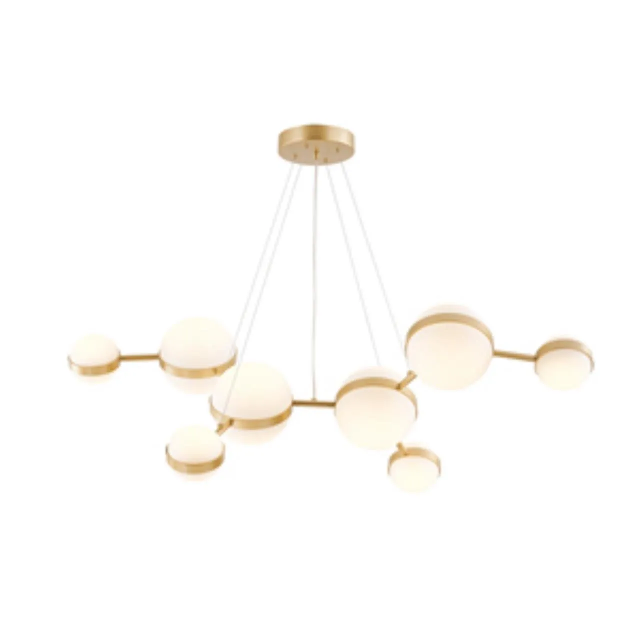 Подвесная люстра с каркасом в цвете матовое золото с восемью шаровидными плафонами разных размеров, LED-лампы