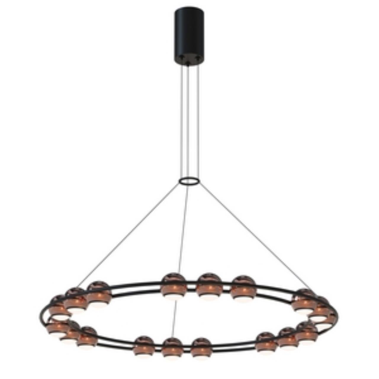 Подвесная люстра с диаметром 65 см в стиле хай-тек, каркас состоит из двух металлических трубок черного цвета, между которыми расположены чередующиеся