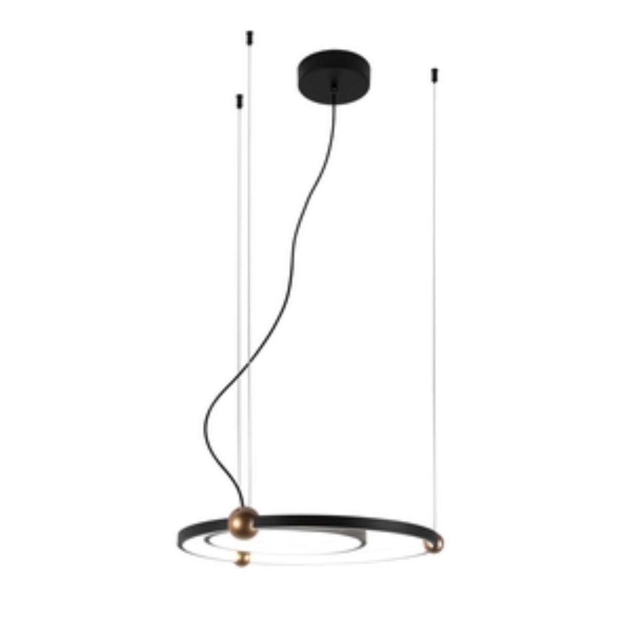 Подвесная люстра, составленная из колец разных размеров, собранных в композицию. Каркас светильников выполнен в черном цвете, с встроенной лентой LED,