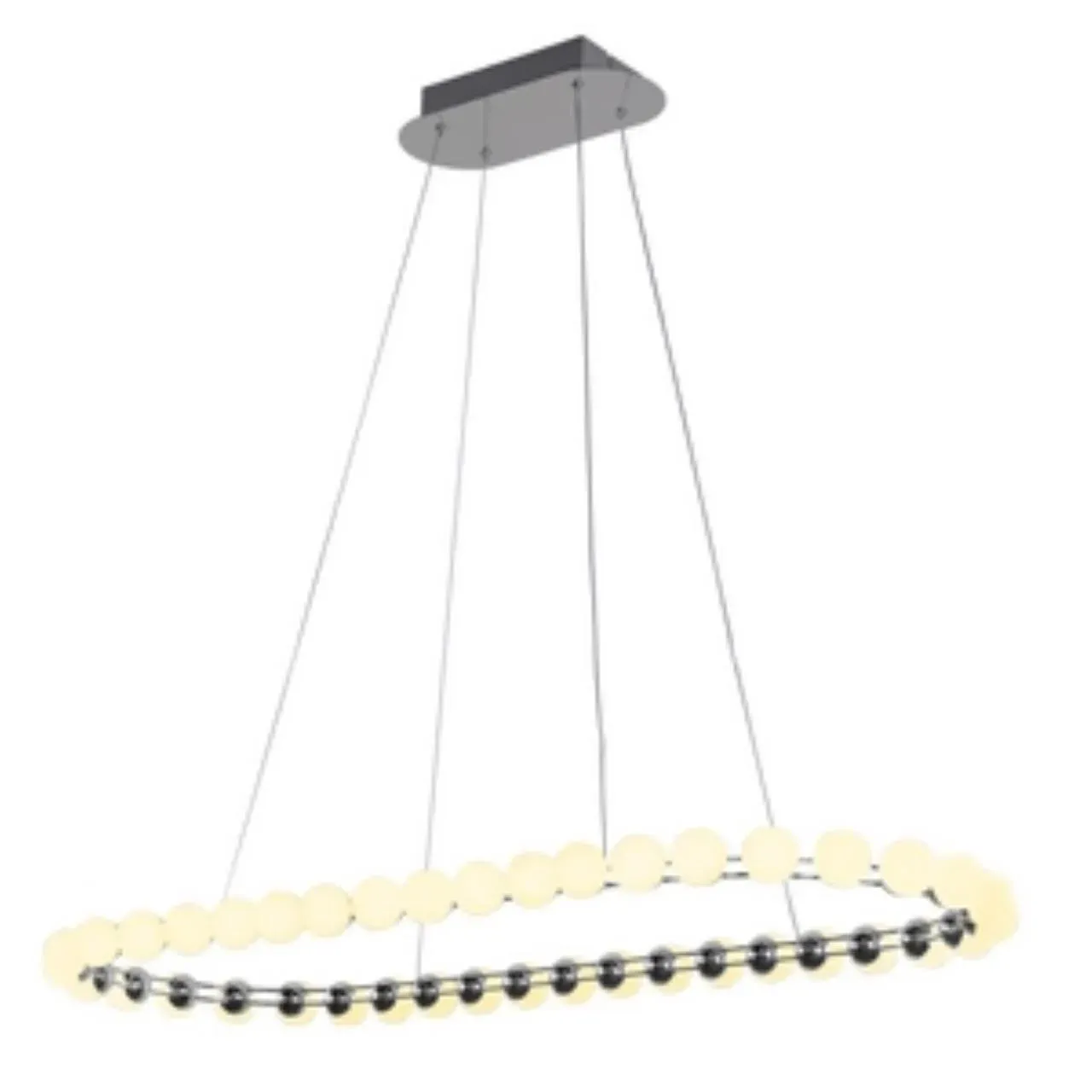 Подвесная люстра длиной 100 см с каркасом в цвете хром, служащим проводником электричества, кольцо украшено белыми акриловыми шариками в качестве плаф