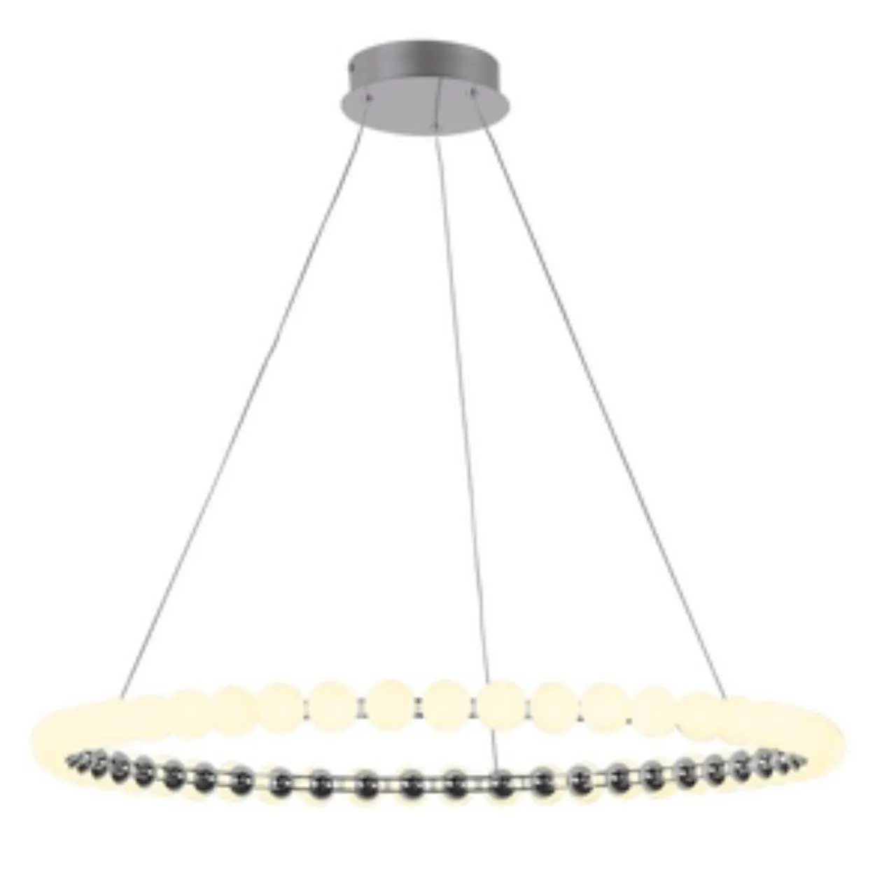 Подвесная люстра диаметром 80 см с каркасом в цвете хром, служащим проводником электричества, кольцо украшено белыми акриловыми шариками в качестве пл