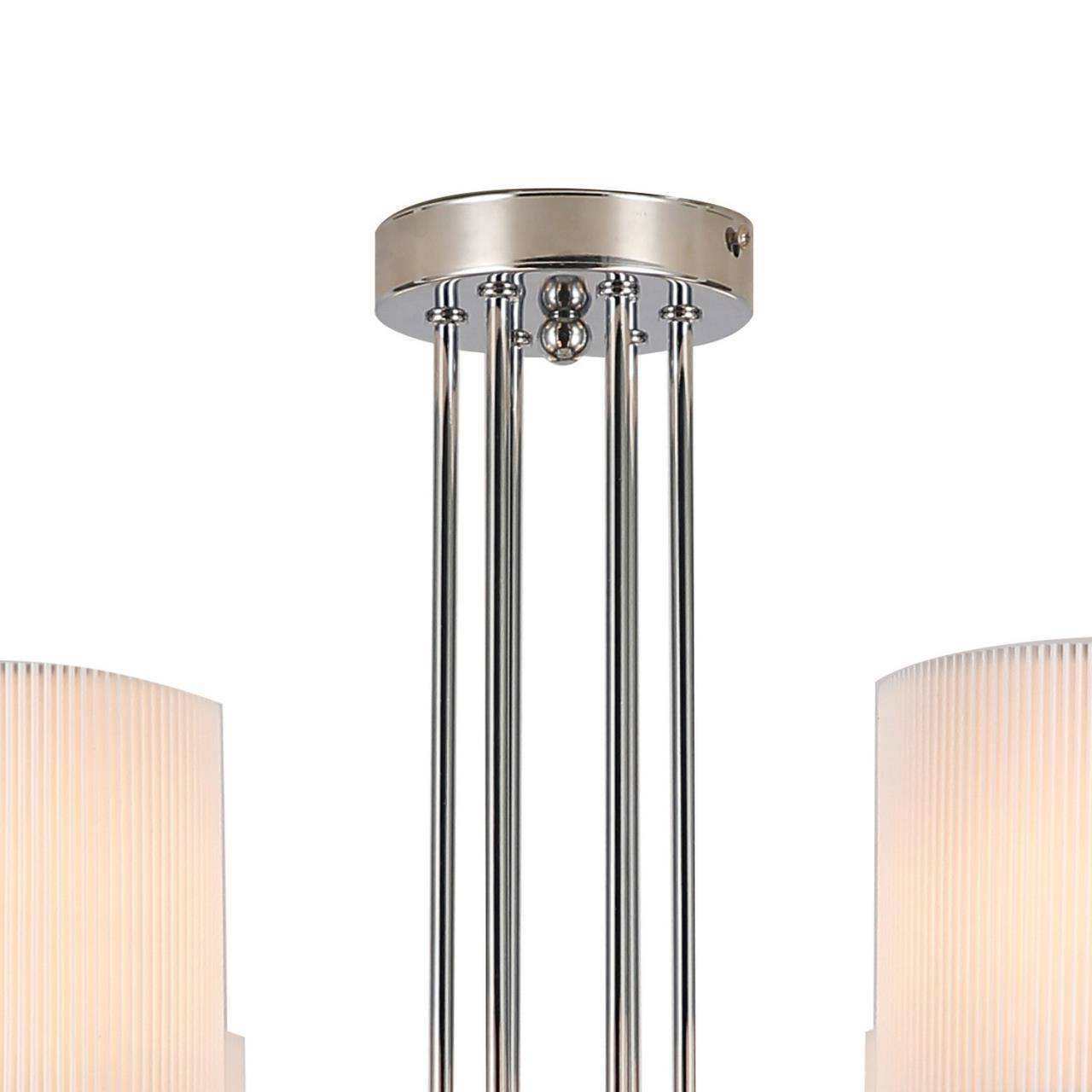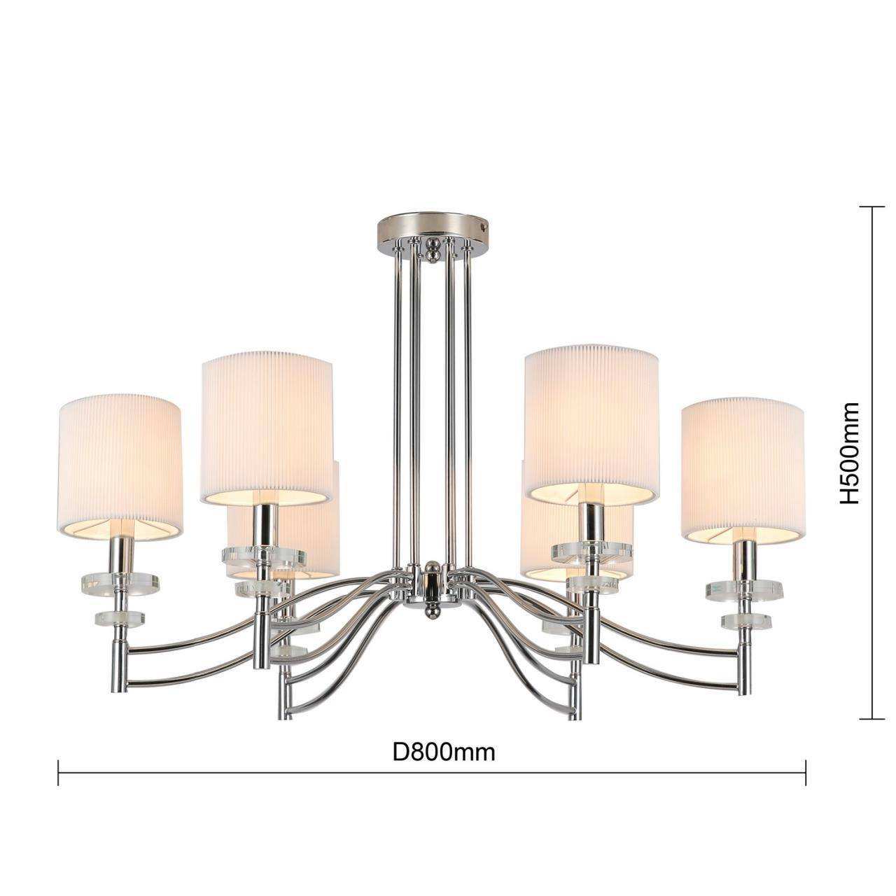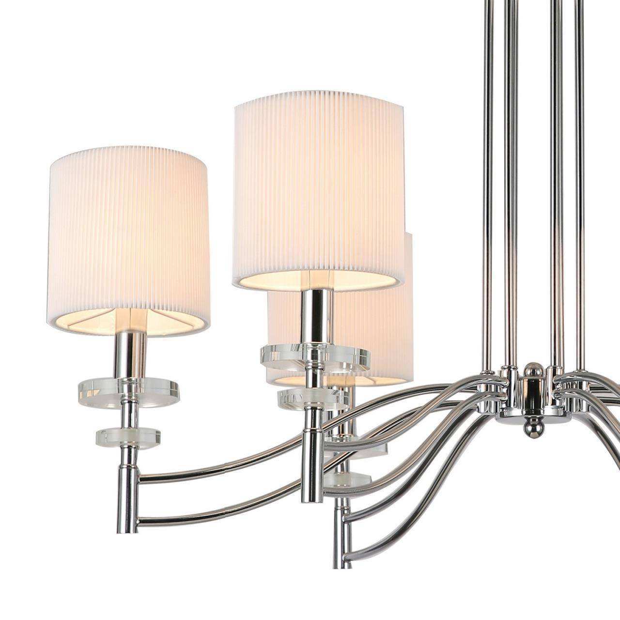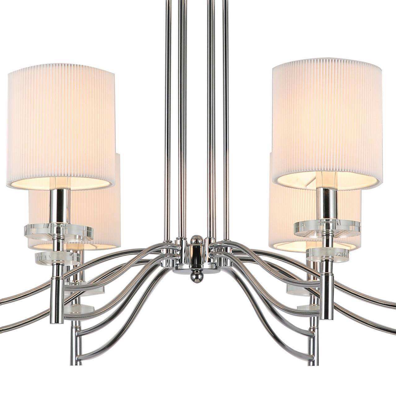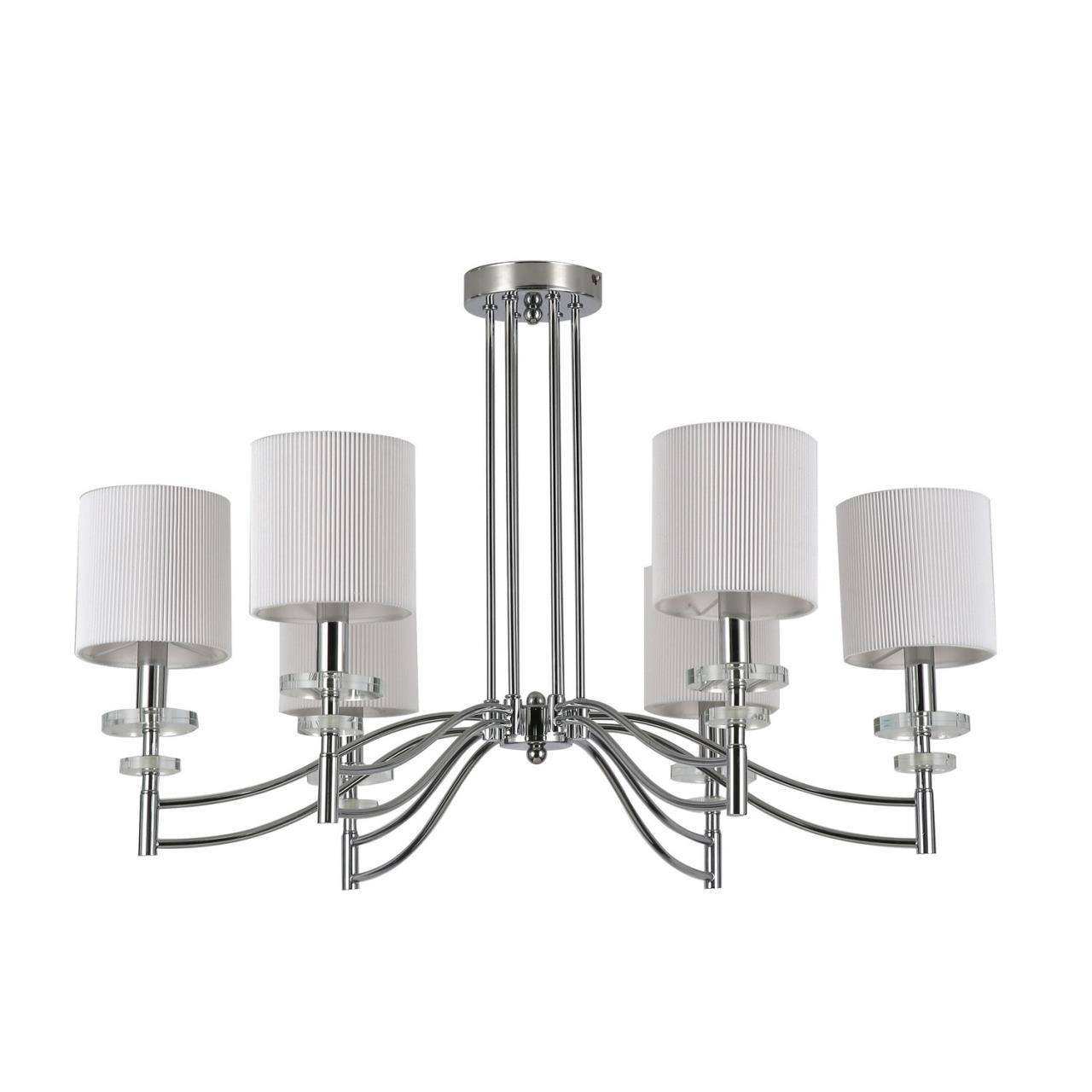 Каркас цвета хром, плафоны из белой ткани, декоративные блюдца из прозрачного стекла
