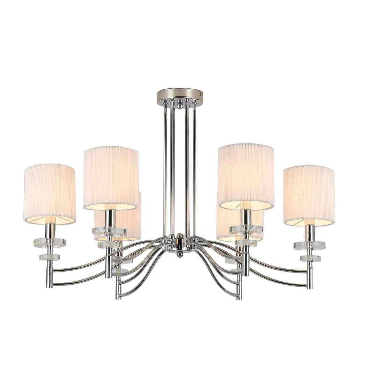каркас цвета хром, плафоны из белой ткани, декоративные блюдца из прозрачного стекла