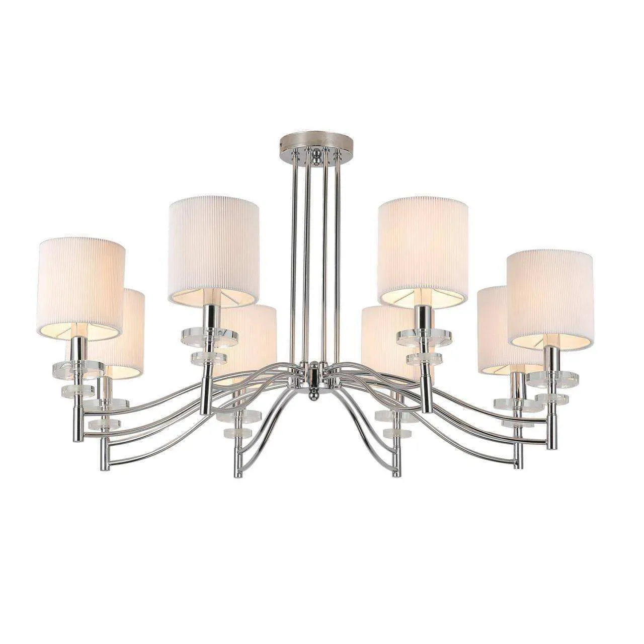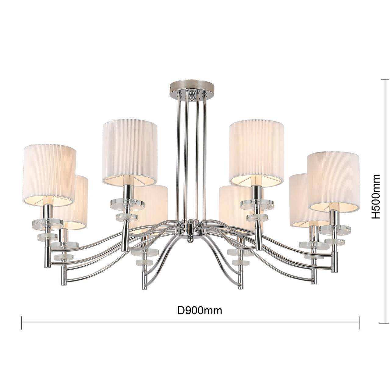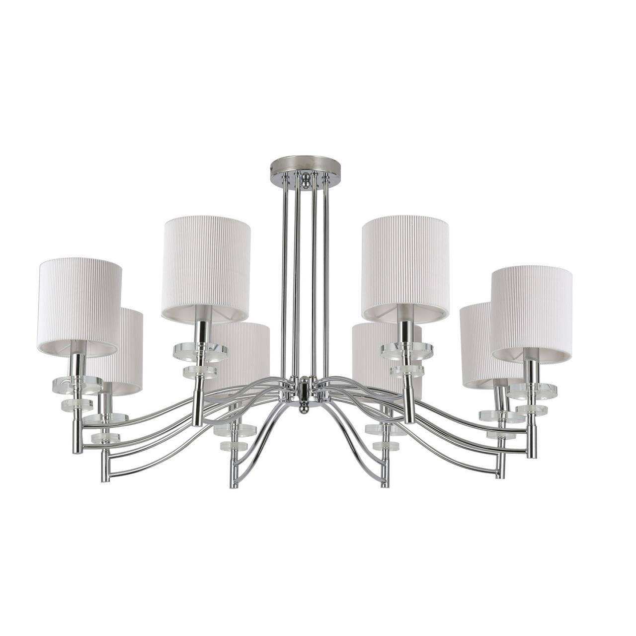 каркас цвета хром, плафоны из белой ткани, декоративные блюдца из прозрачного стекла