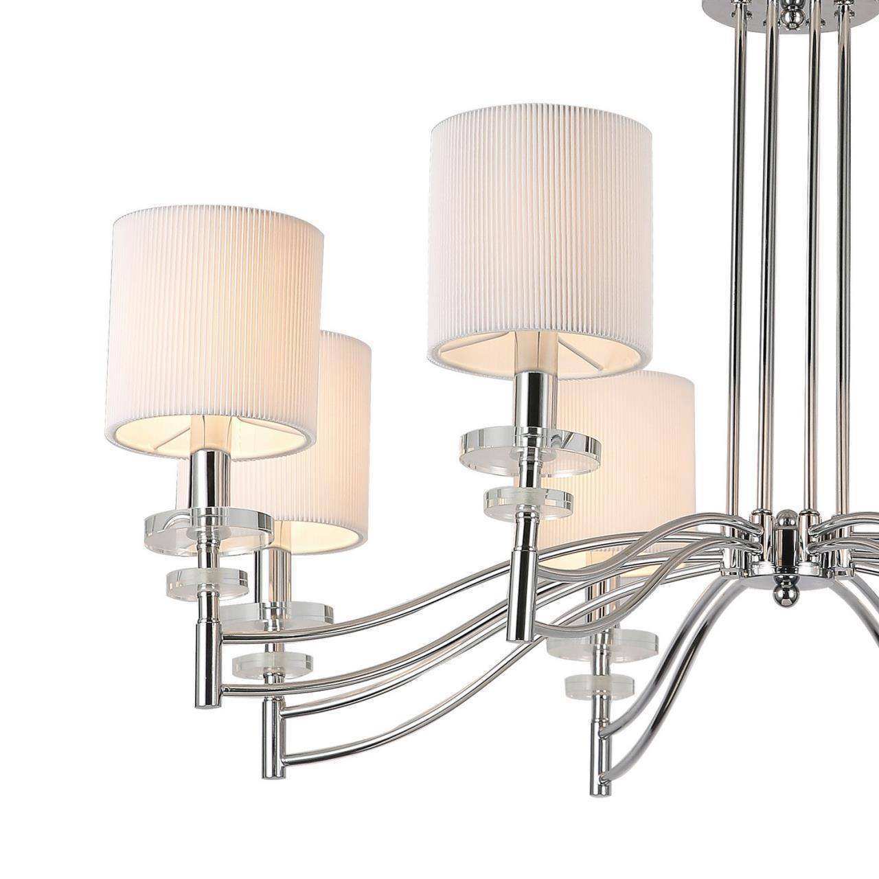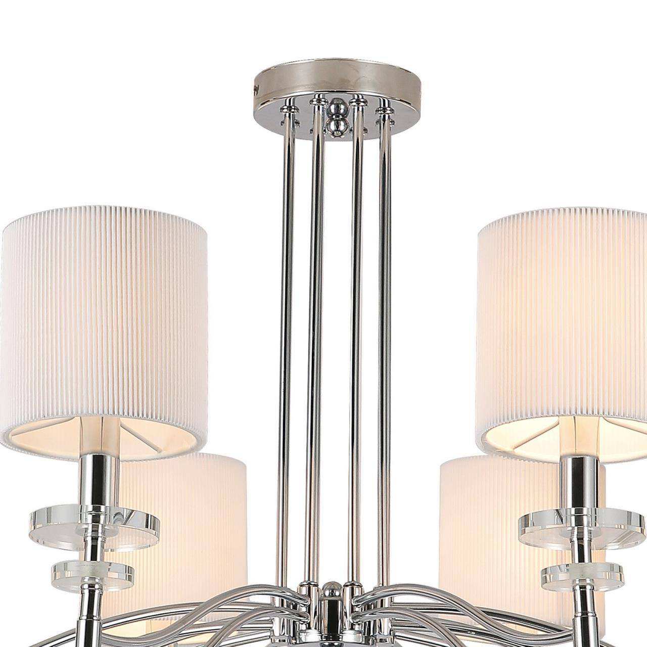 Каркас цвета хром, плафоны из белой ткани, декоративные блюдца из прозрачного стекла