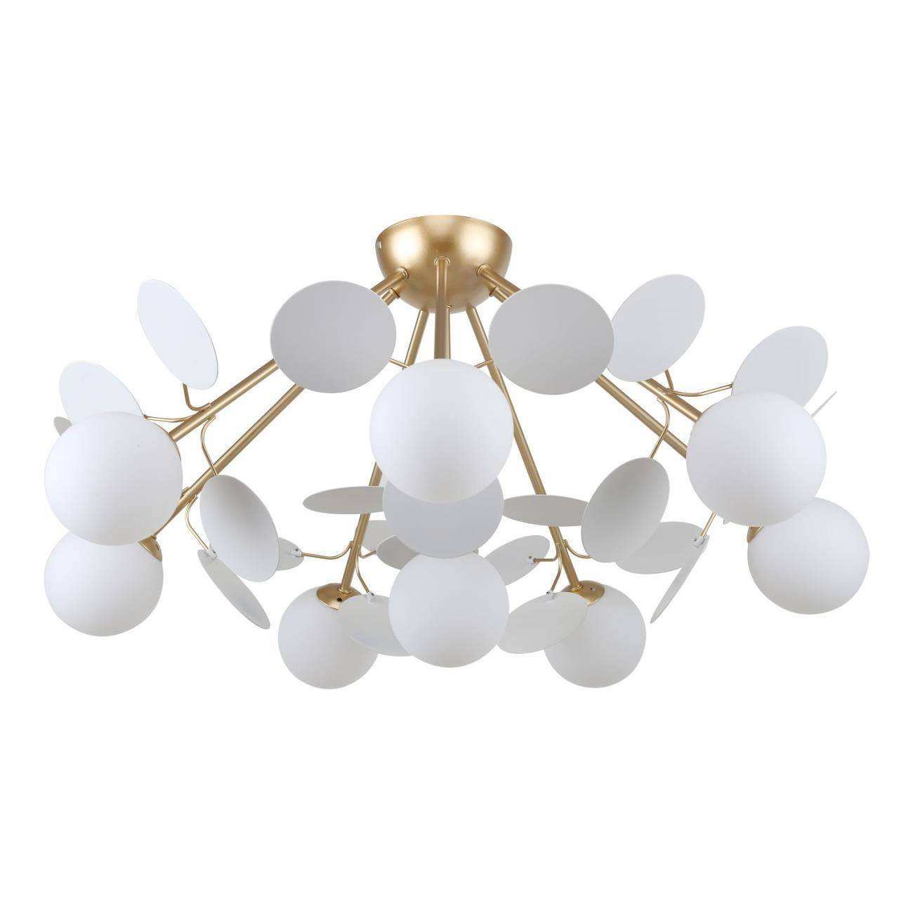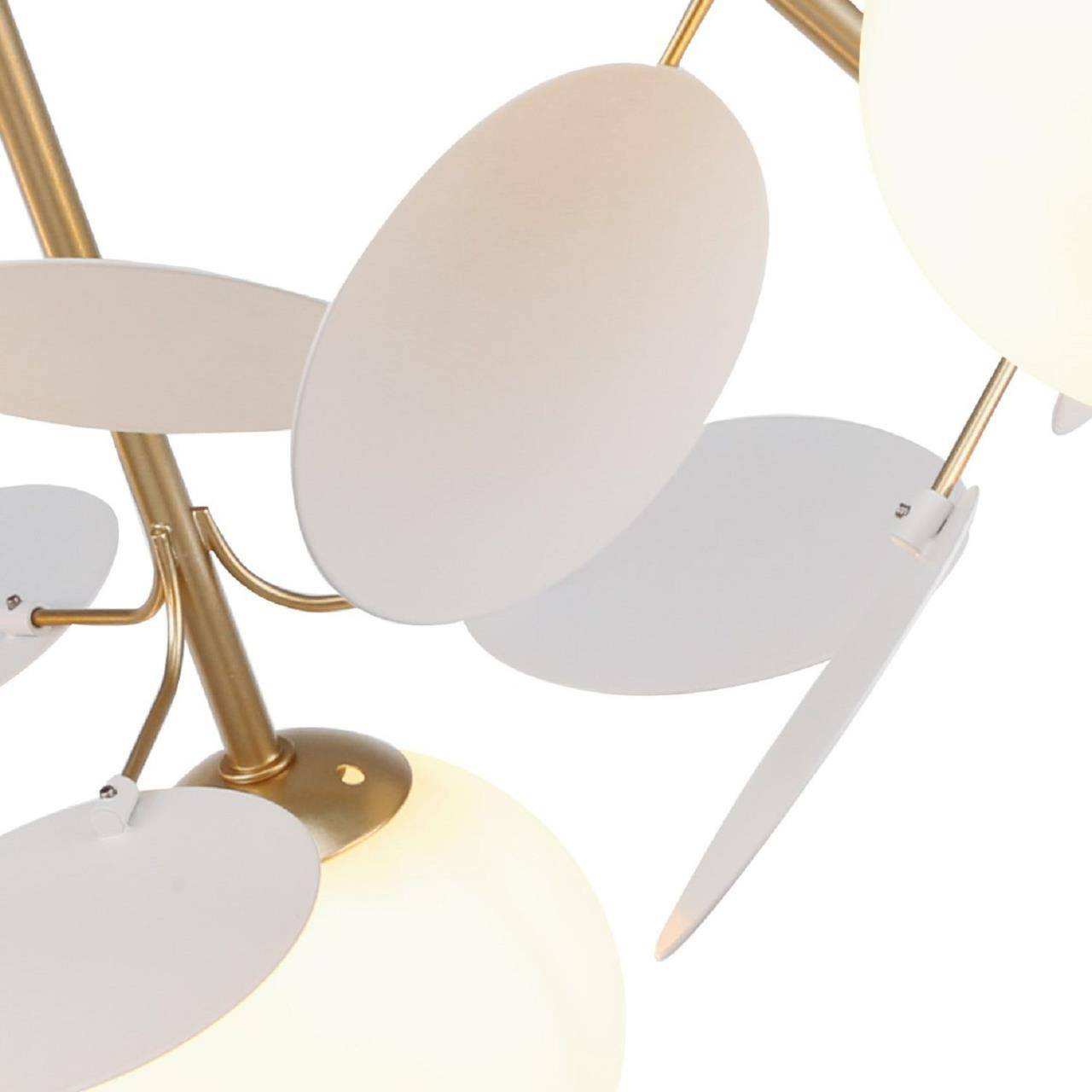 Каркас золотого цвета, круглые стеклянные плафоны молочного цвета, декоративные круглые белые пластины