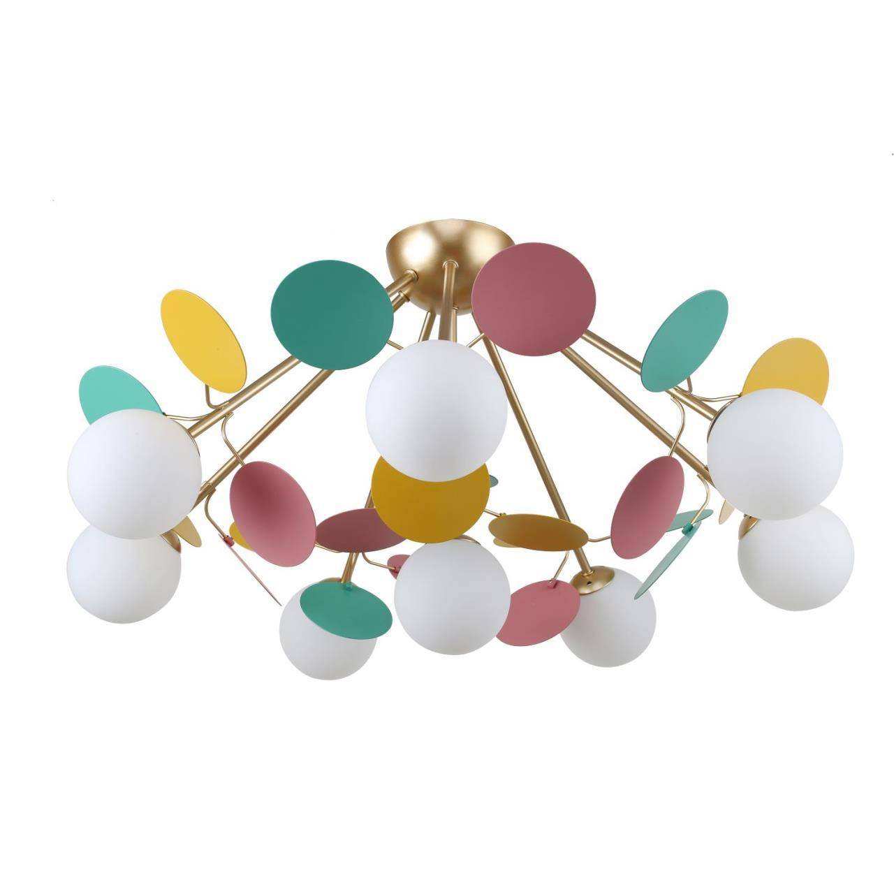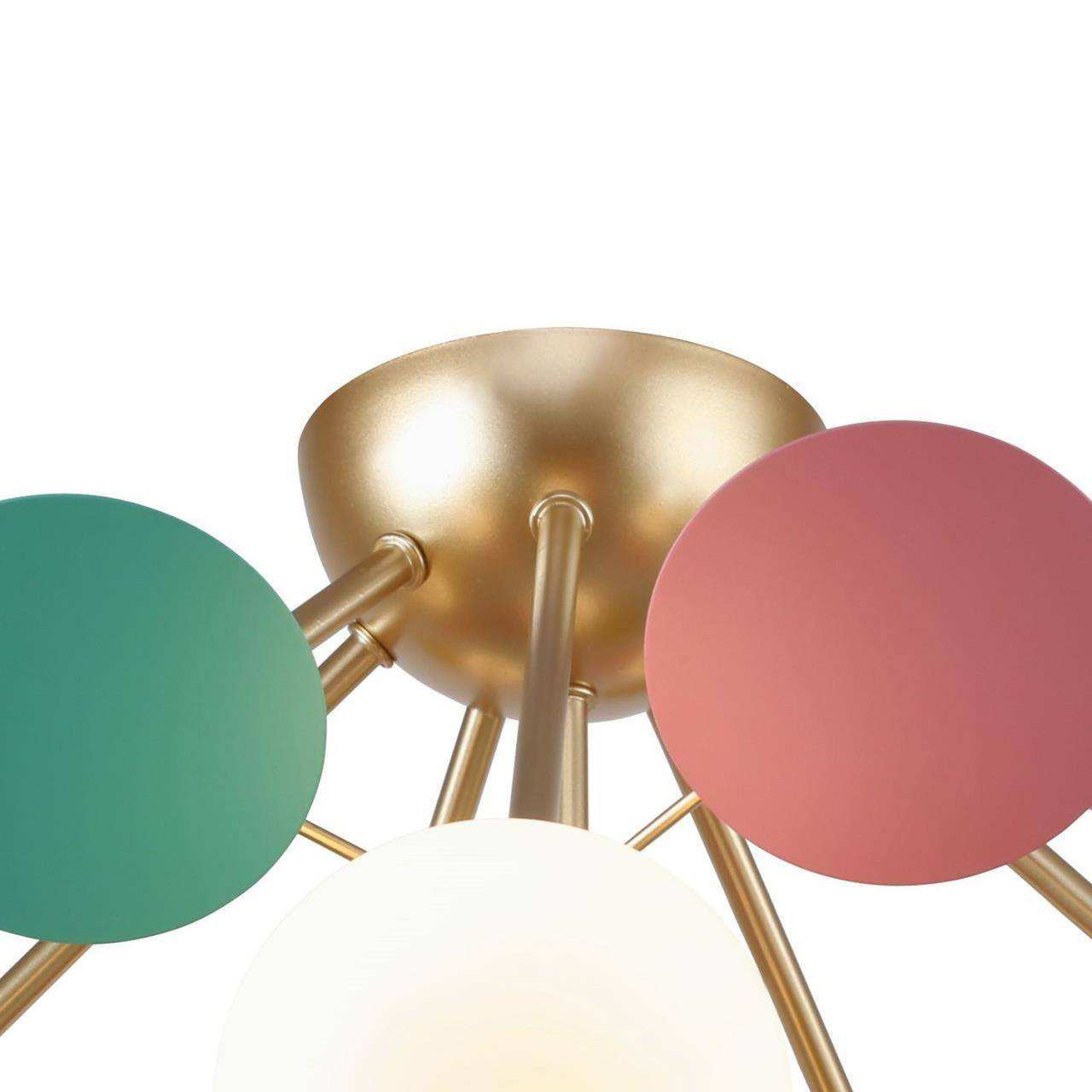 Каркас золотого цвета, круглые стеклянные плафоны молочного цвета, декоративные круглые разноцветные пластины