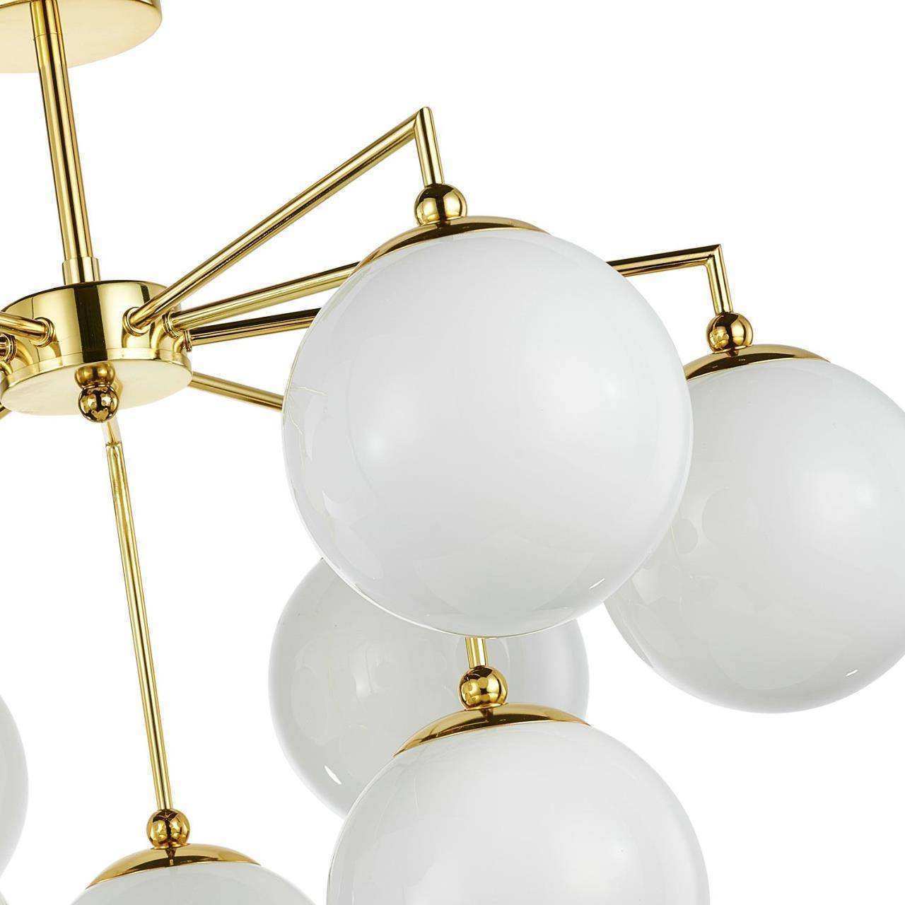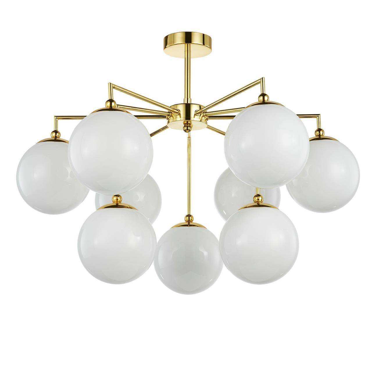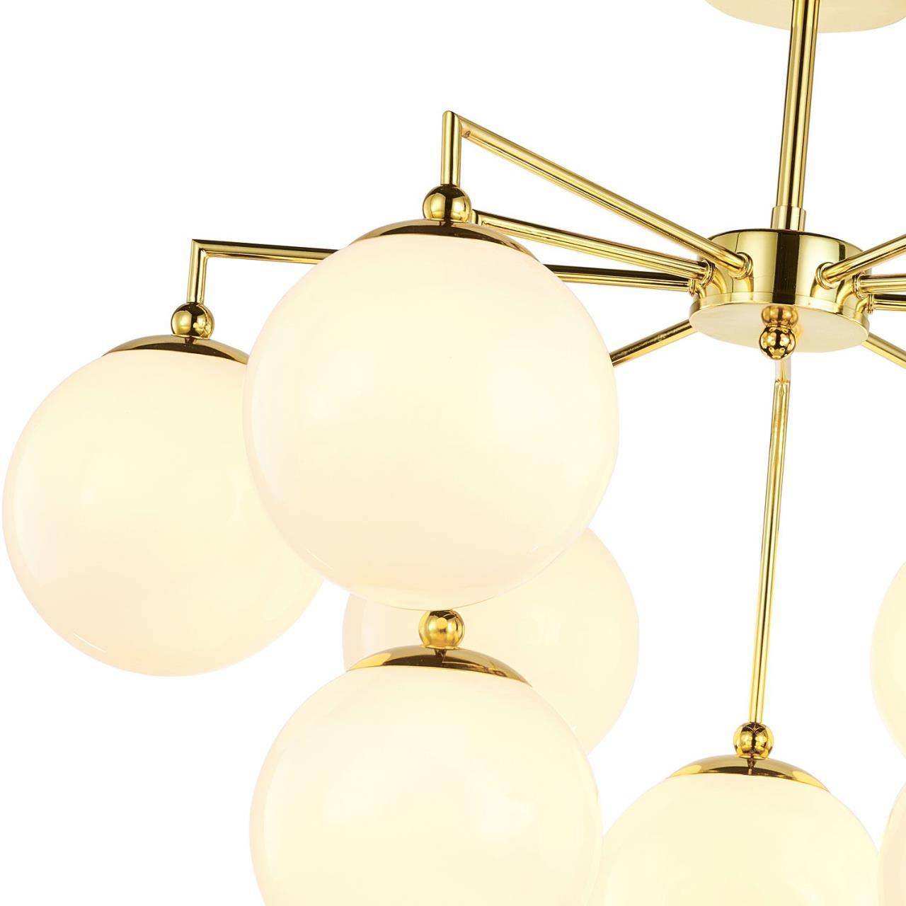 Каркас золотого цвета, плафоны из белого выдувного стекла