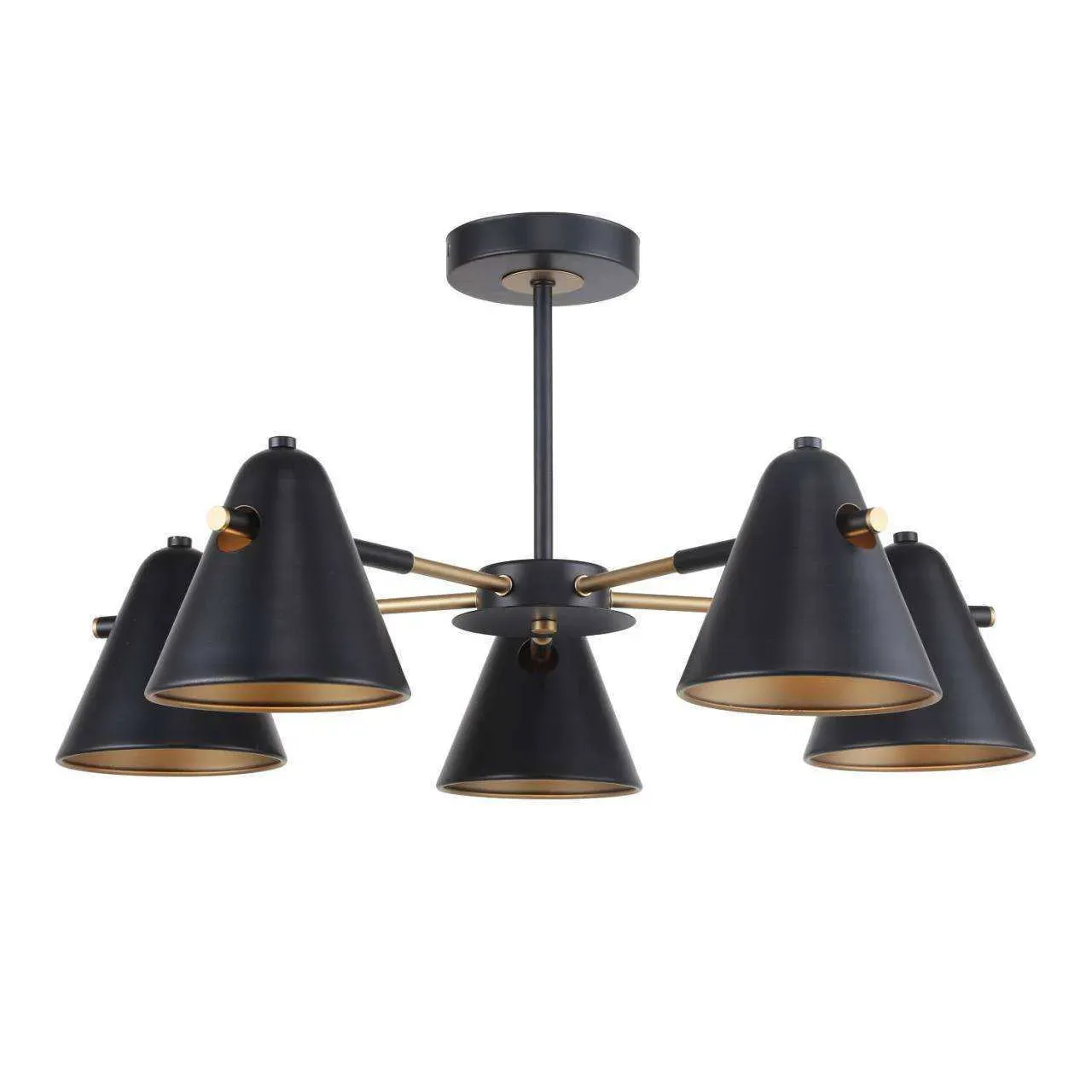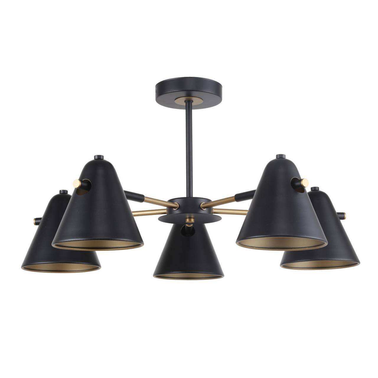 Каркас черного цвета с золотыми декоративными элементами, металлические плафоны черного цвета