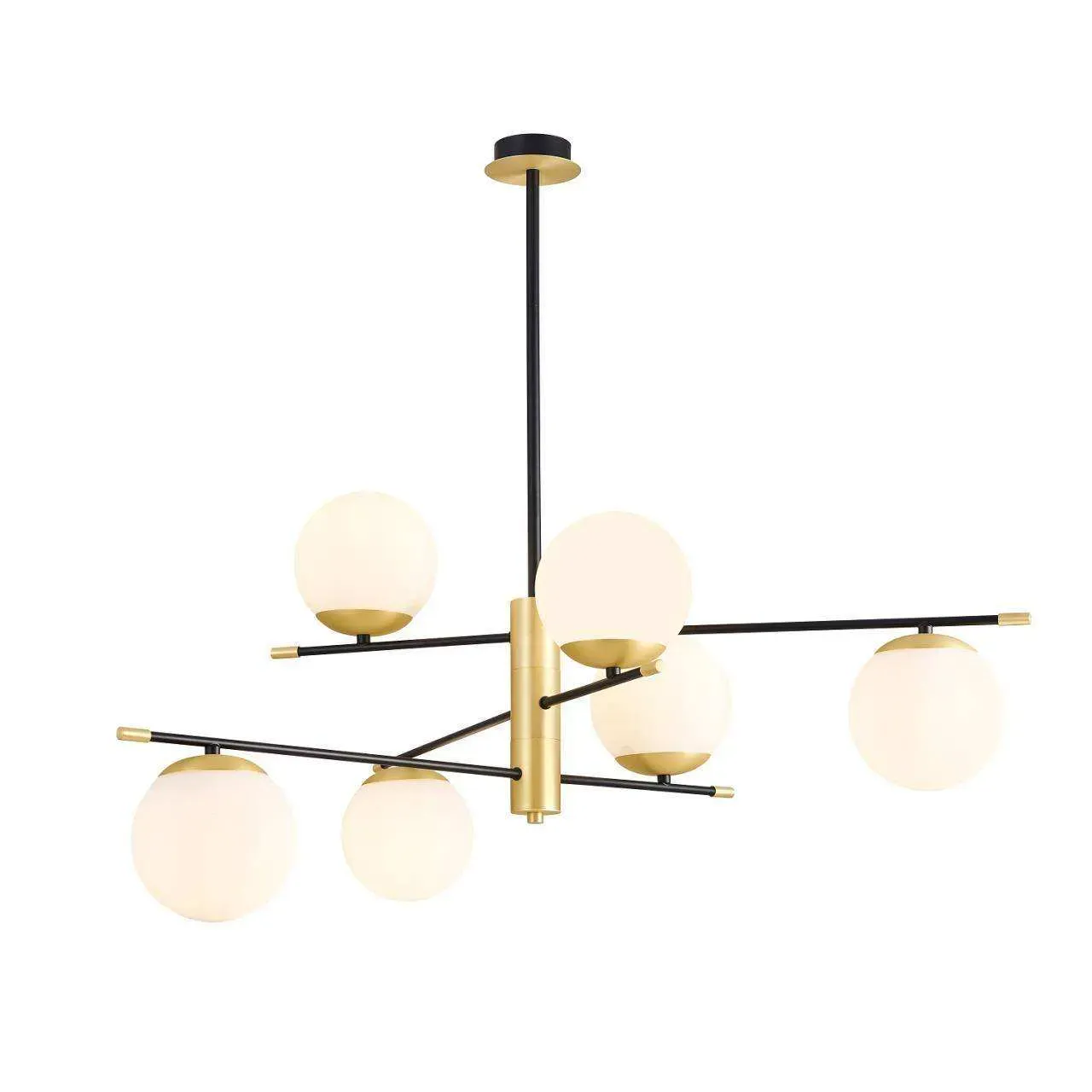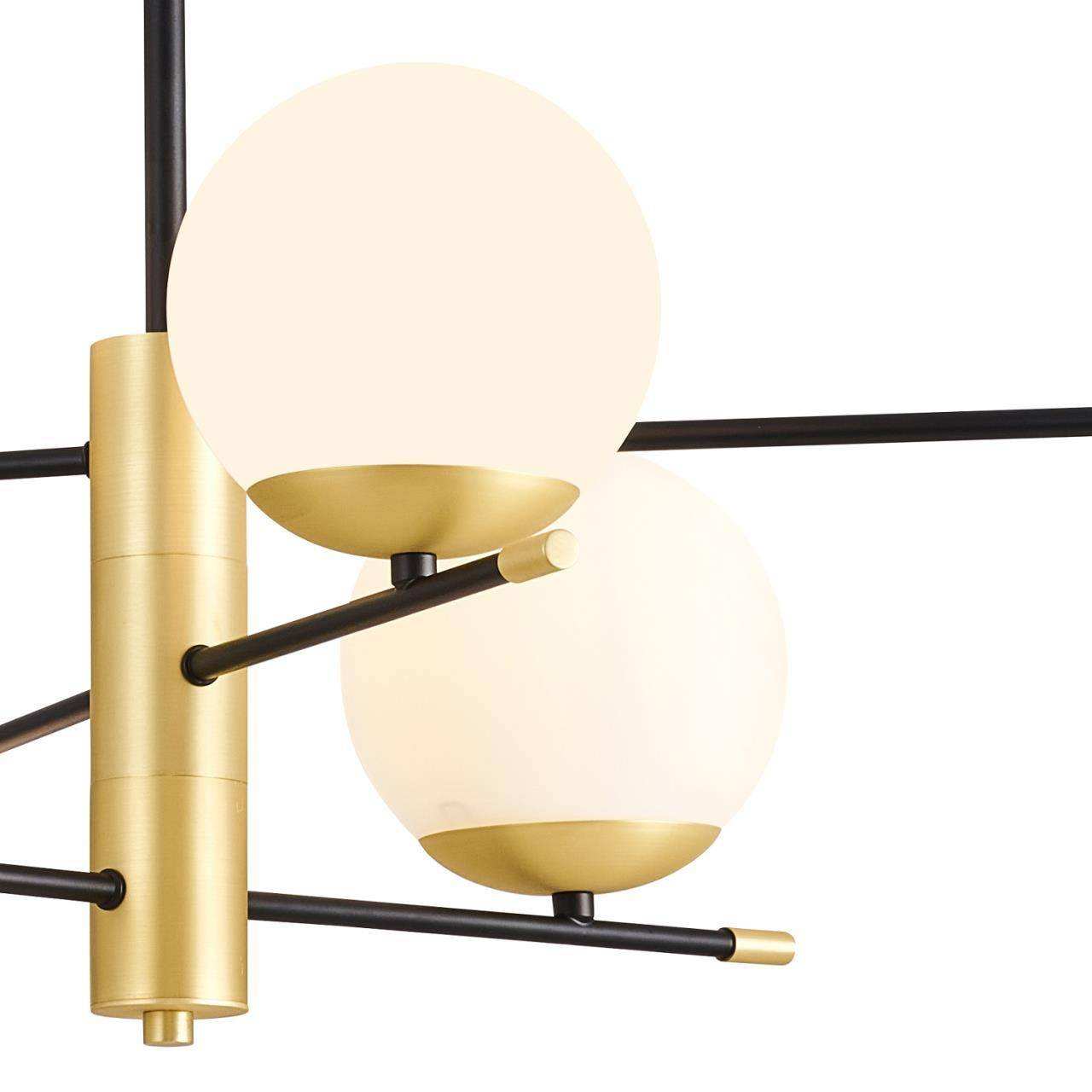 Каркас светильника сочетает два цвета - черный и золото, плафоны шарообразной формы из белого матового стекла