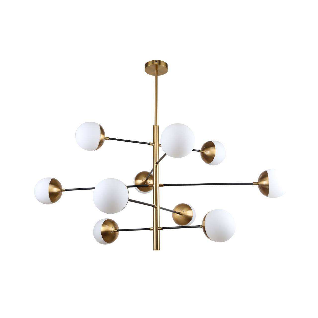 каркас двух цветов - матовый черный и латунь, плафоны из белого стекла, лампу G9 можно менять