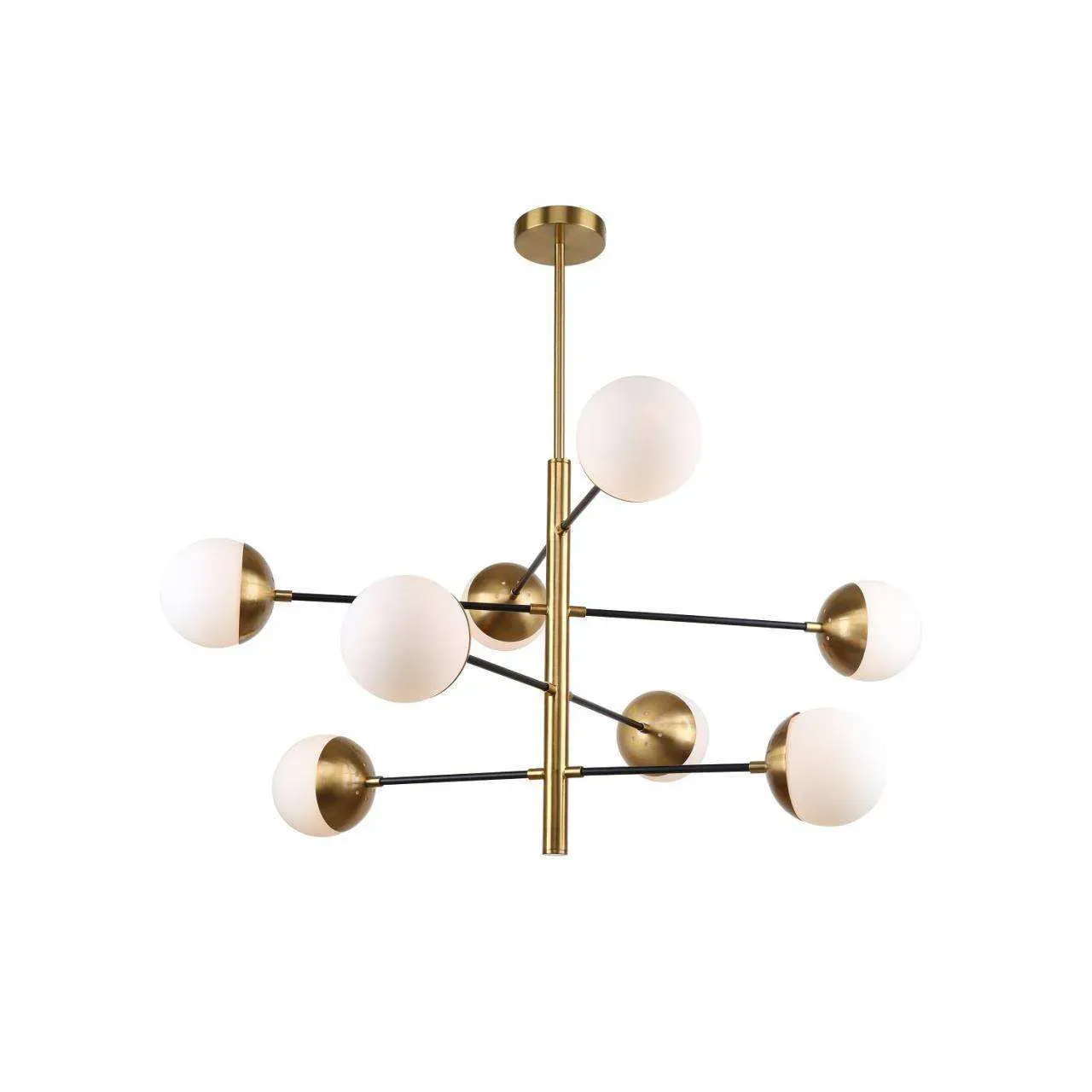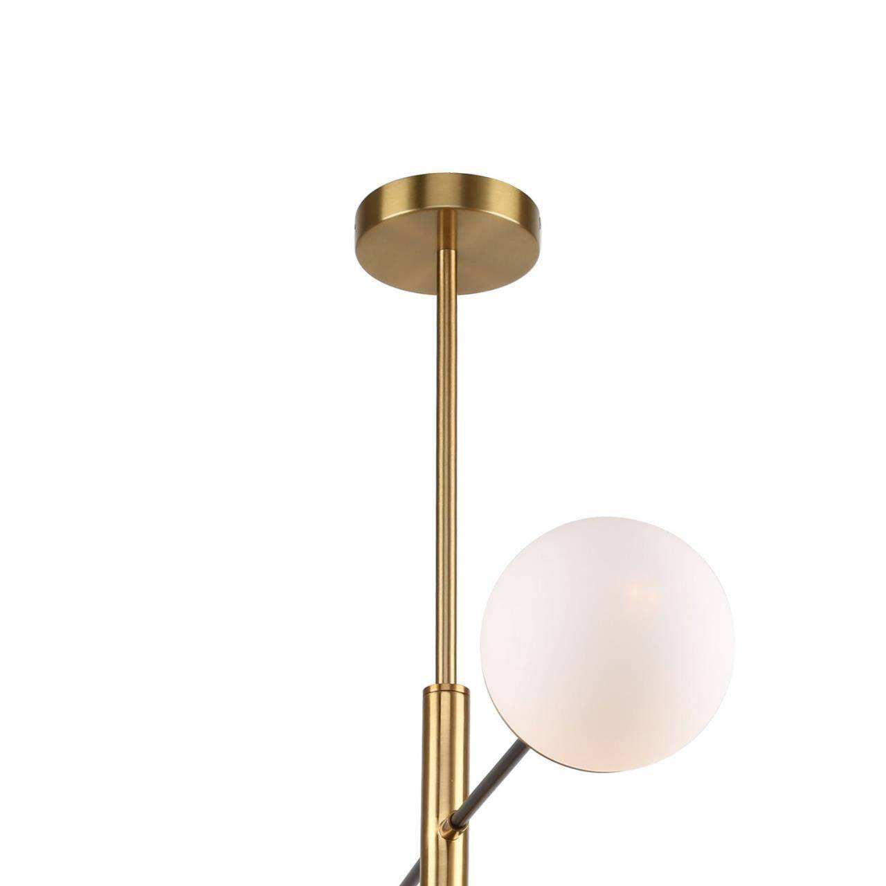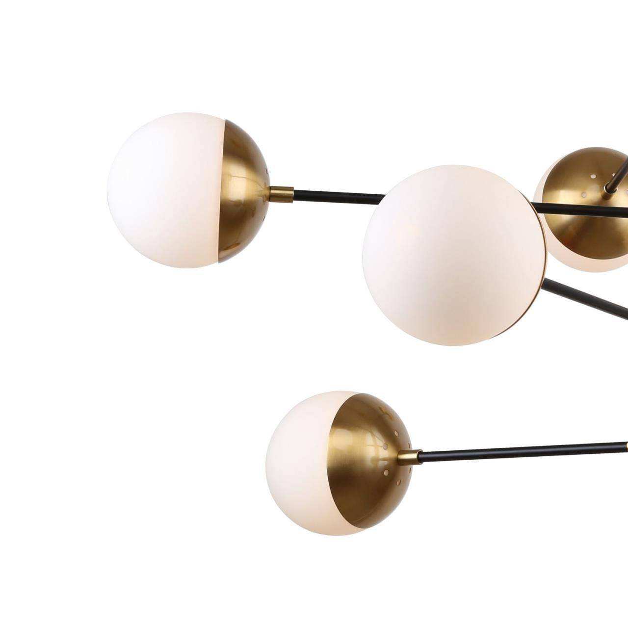 каркас двух цветов - матовый черный и латунь, плафоны из белого стекла, лампу G9 можно менять