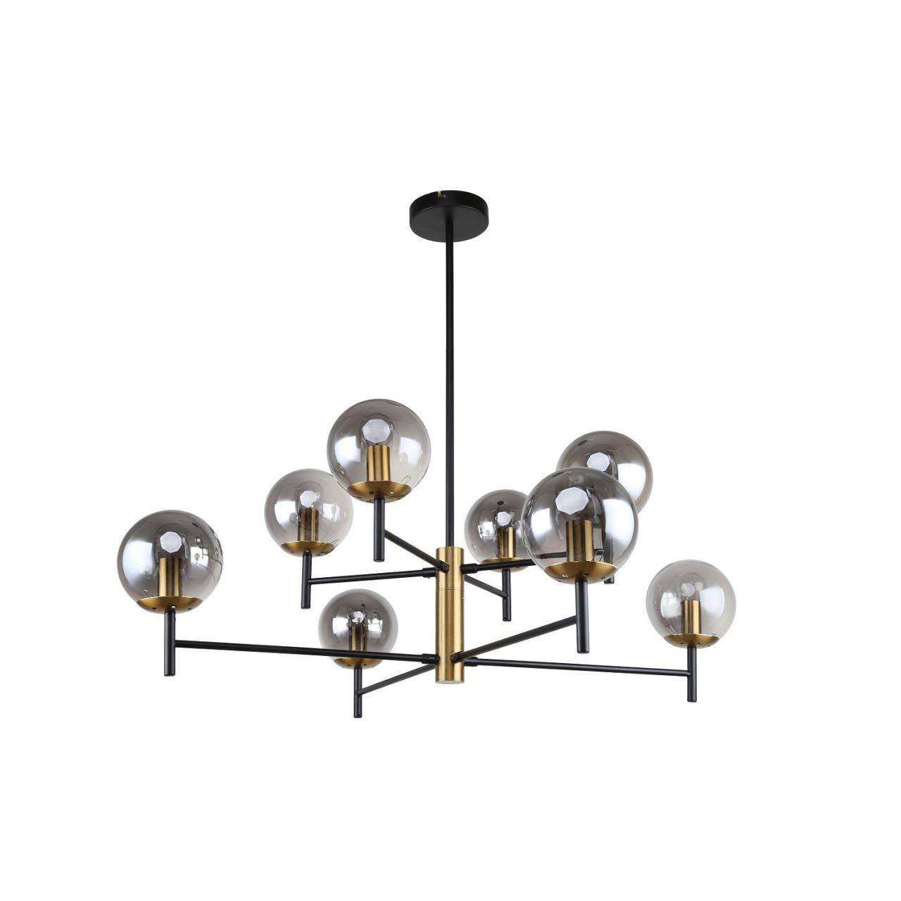 Каркас черного цвета, плафоны из стекла дымчатого серого цвета, декоративный элемент из металла цвета латуни