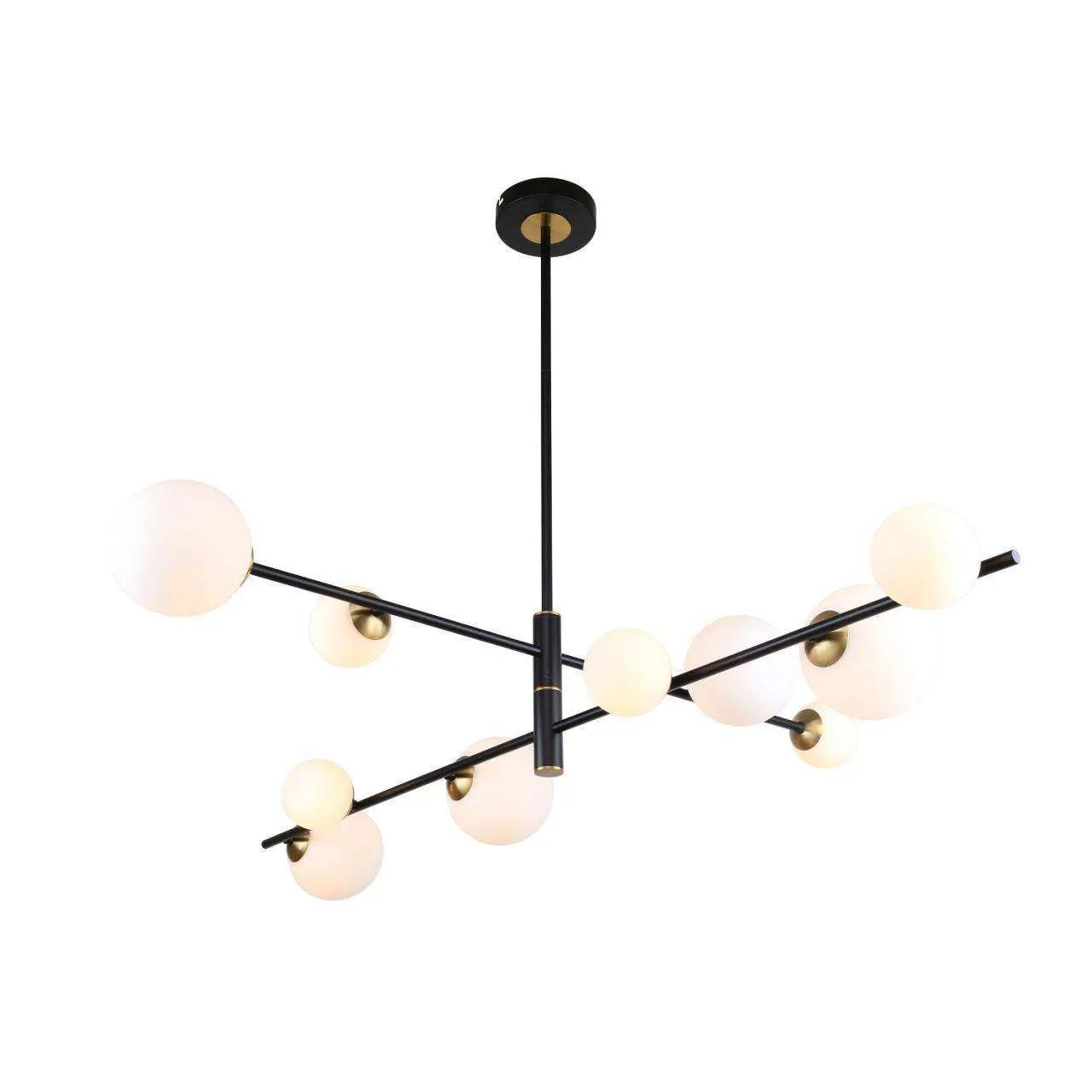Черный каркас с декоративными элементами цвета латуни, плафоны из белого стекла, лампу g9 можно менять