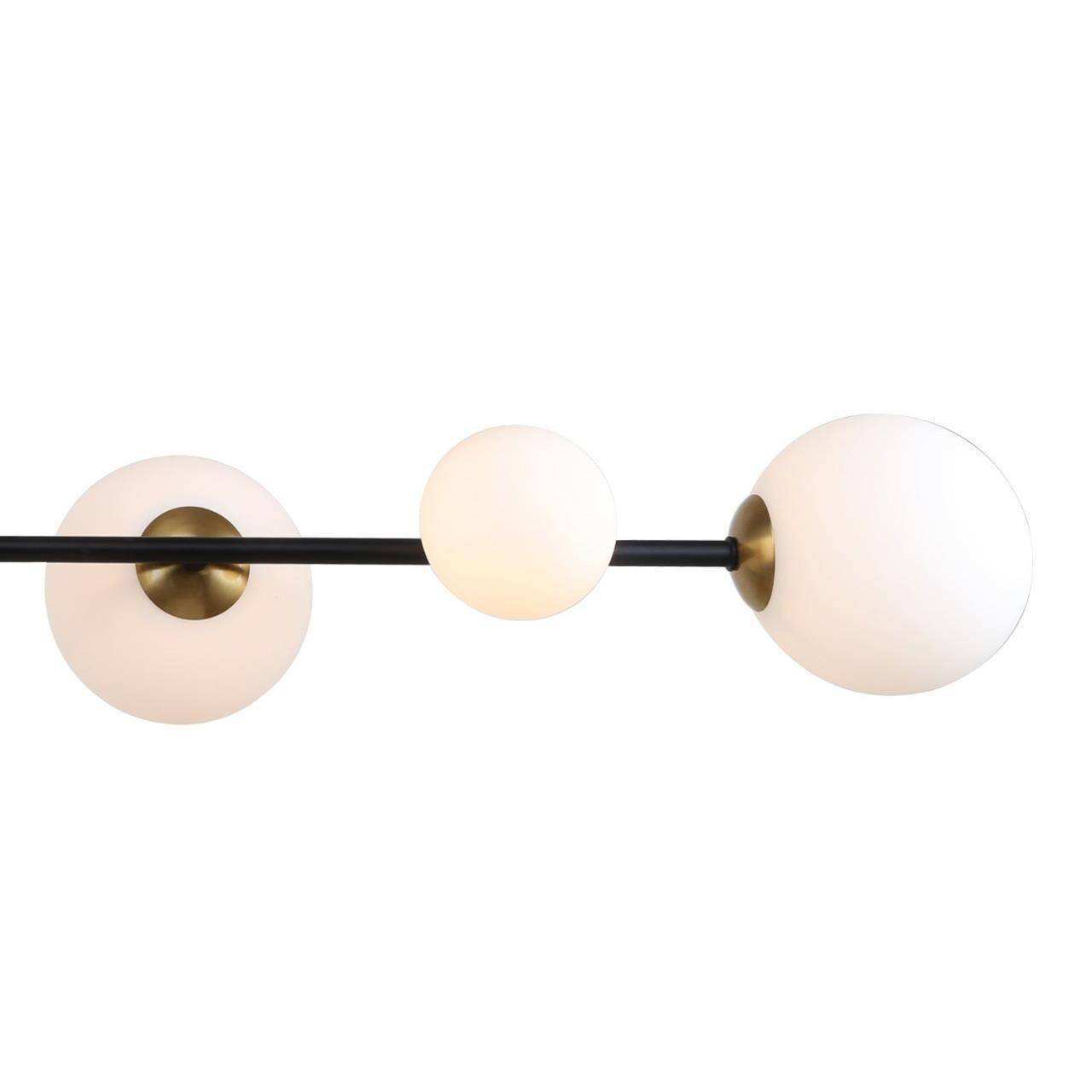 черный каркас с декоративными элементами цвета латуни, плафоны из белого стекла, лампу G9 можно менять