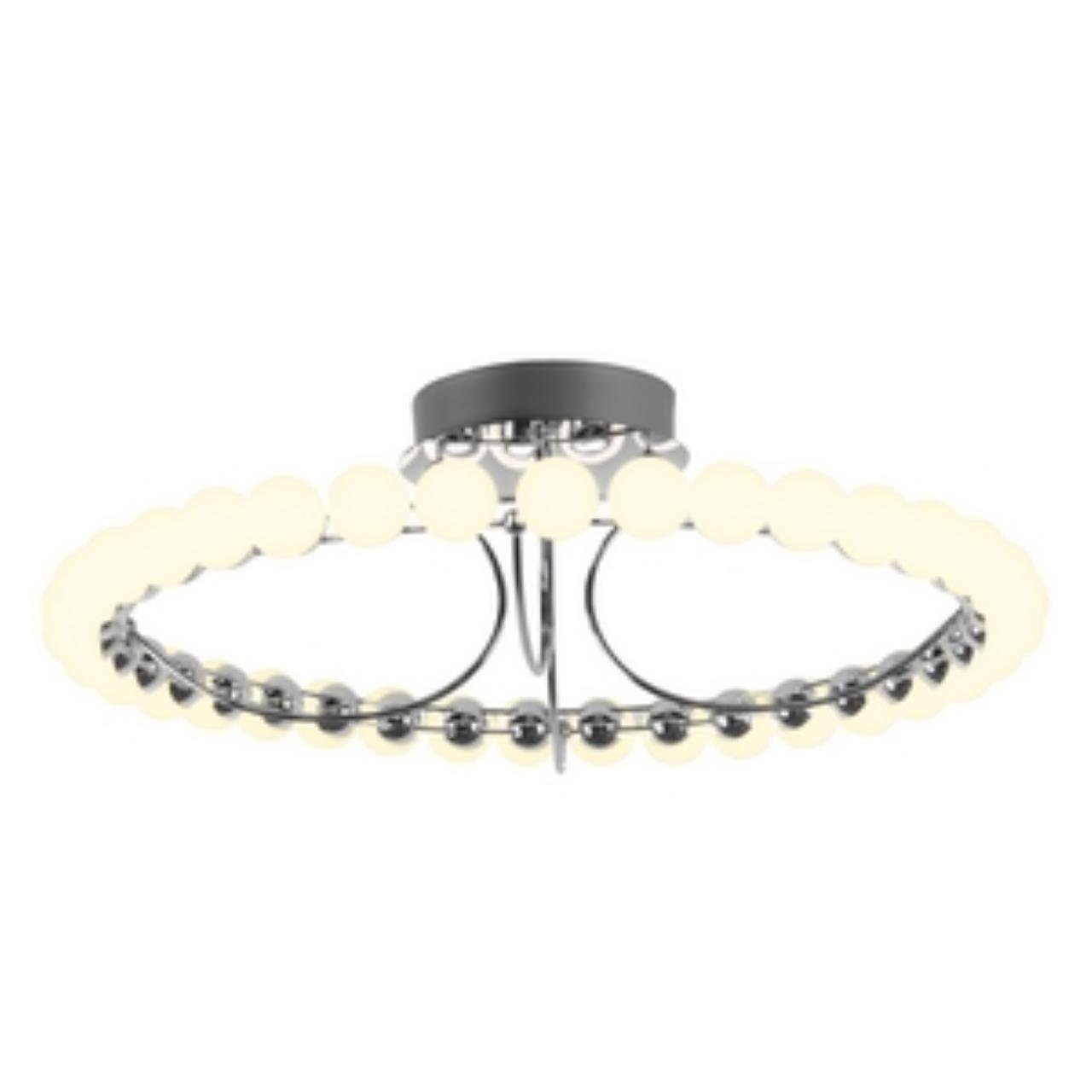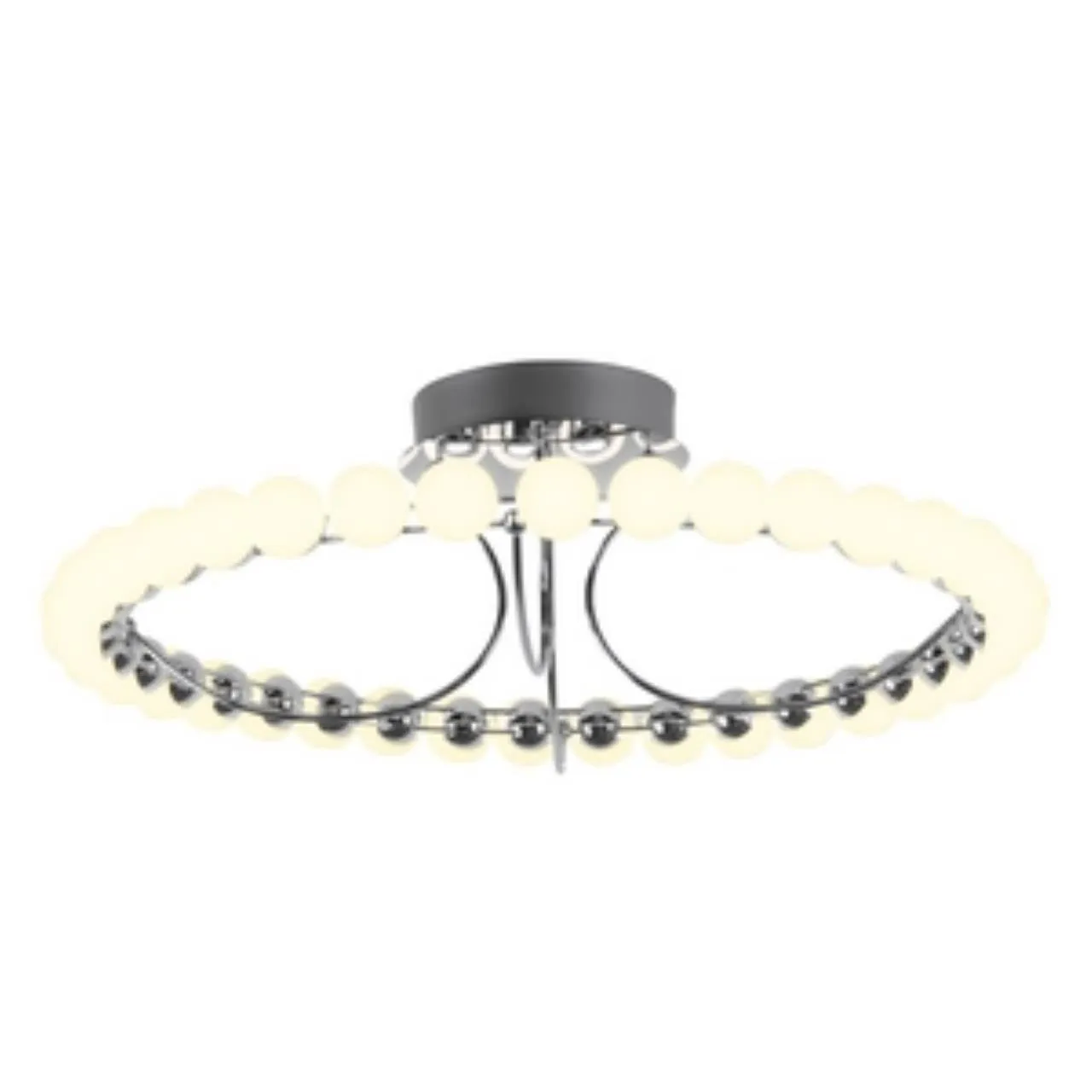Потолочная люстра диаметром 60 см с каркасом в цвете хром, служащим проводником электричества, кольцо украшено белыми акриловыми шариками в качестве п